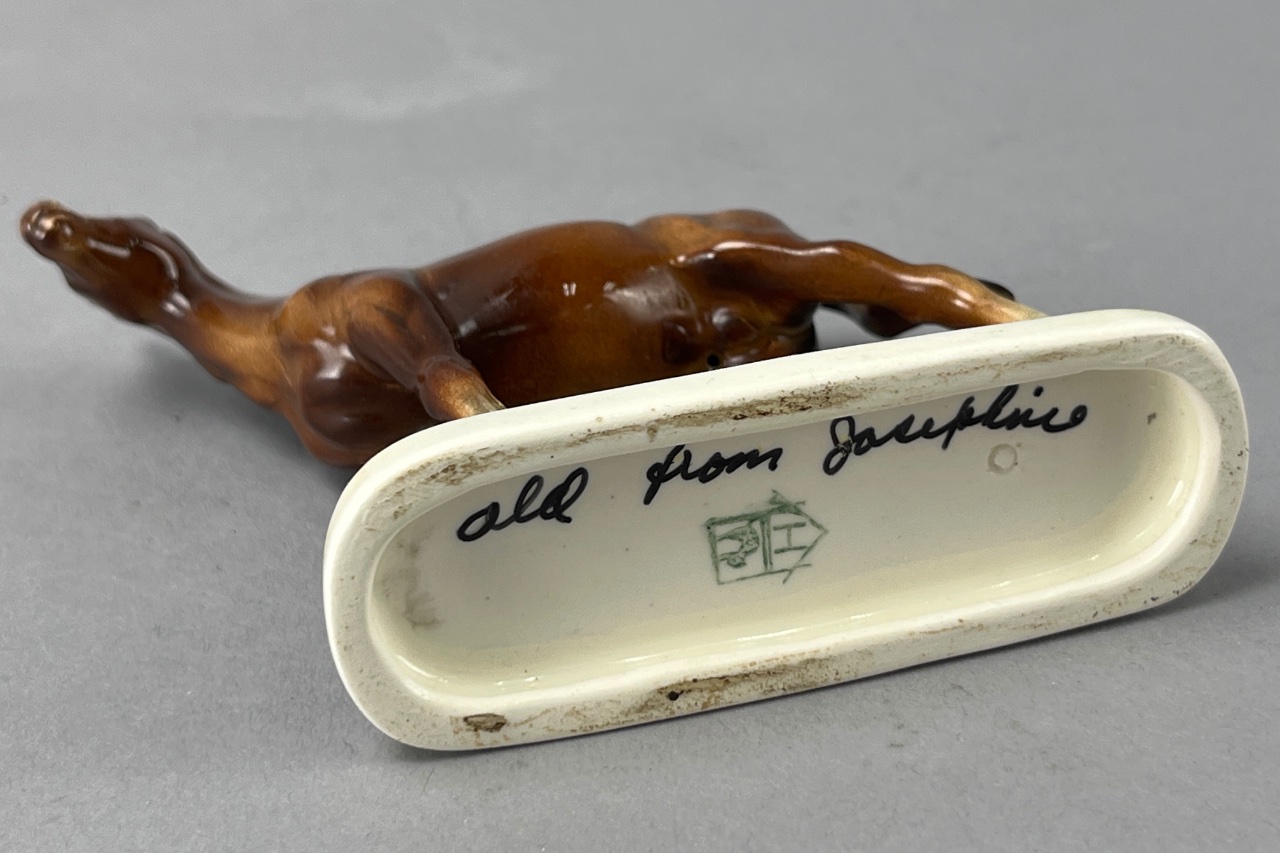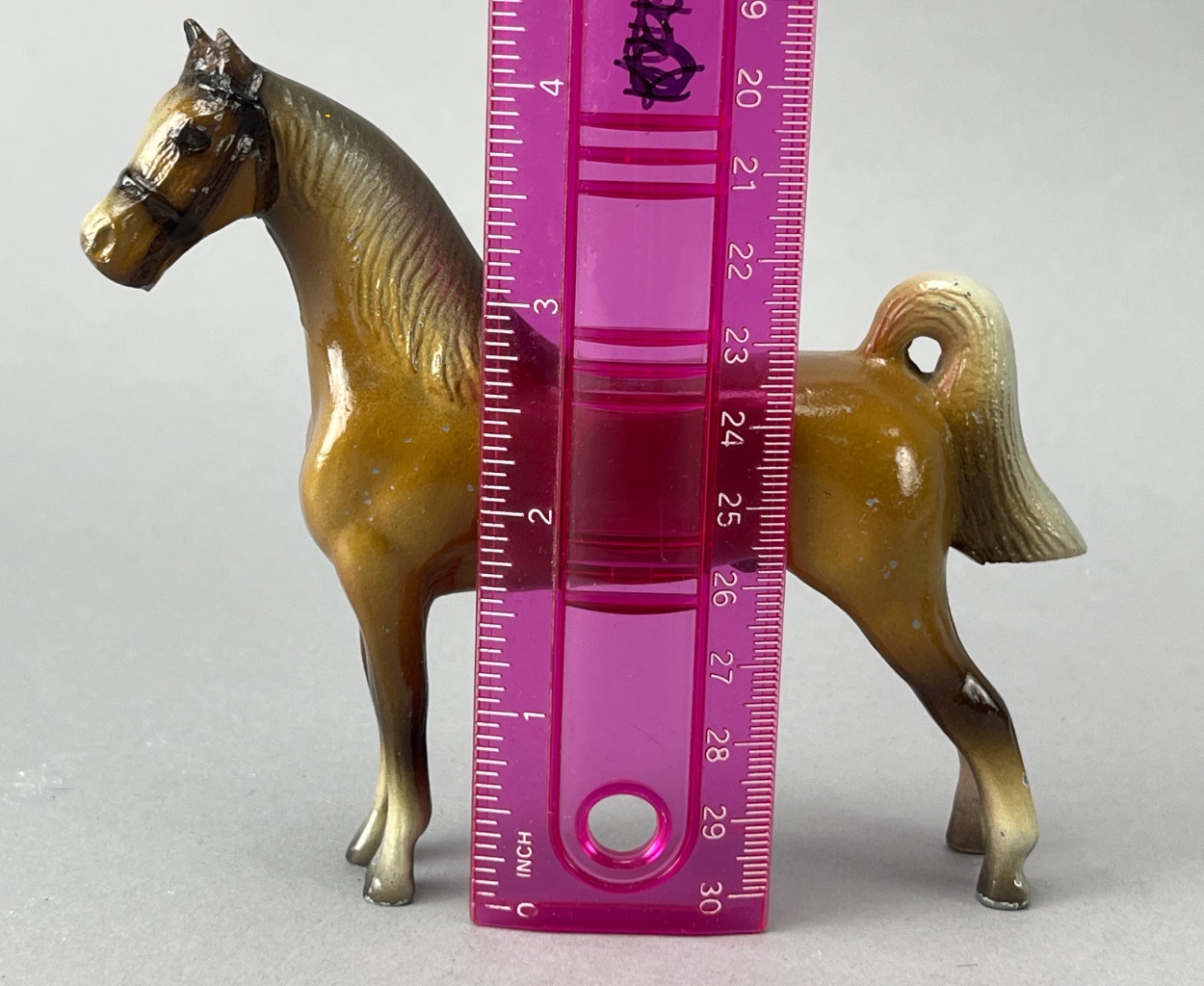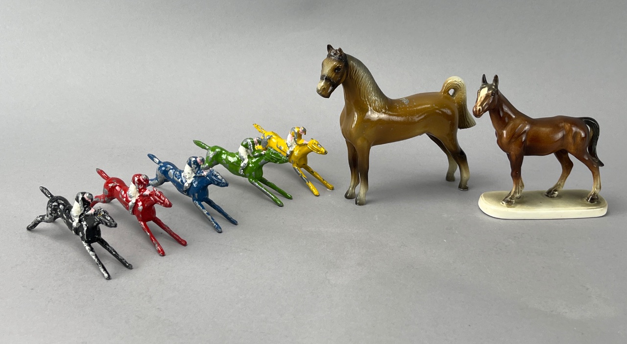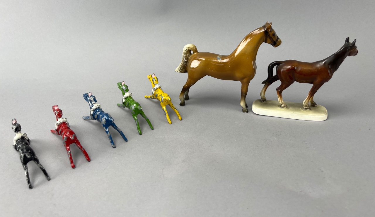 Set of plastic horse figures with riders, including one larger brown horse figure with a glossy finish and five smaller multicolored horse figures painted in black, red, blue, green, and yellow, each with white-painted riders. The base of the larger horse figure is flat and smooth. Taller horse measure 4.5″H. CONDITION: Minor paint wear observed on smaller figures. No visible damage to larger horse figures. SHIPPING: In-House Shipping Available