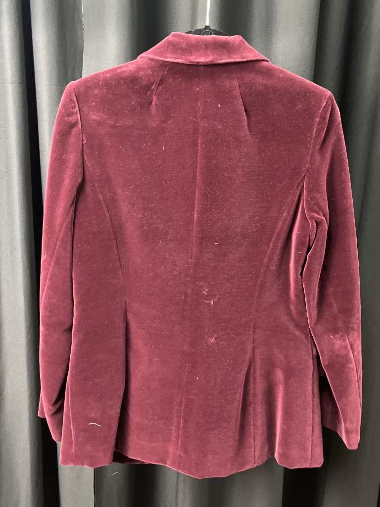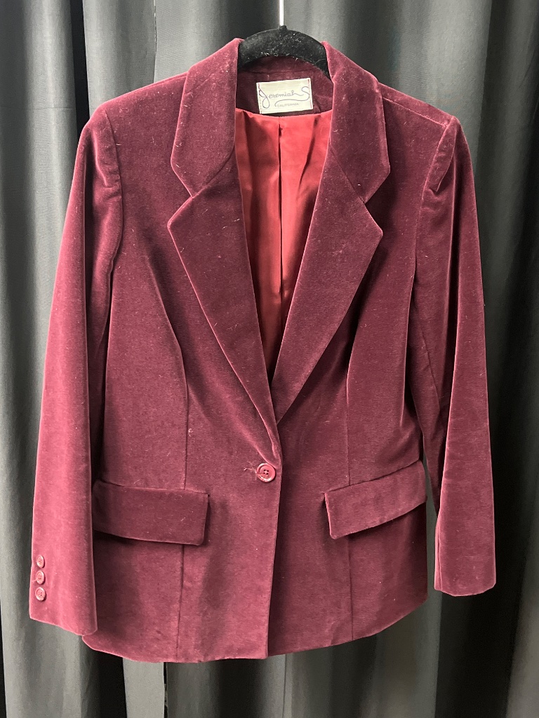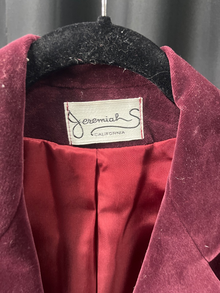 Burgundy velvet blazer by Jeremiah S, featuring a single-button closure, two front flap pockets, three sleeve buttons, and red fabric lining. The label inside reads ‘Jeremiah S California.’ CONDITION: Some lint or dust visible on the fabric. No major damage or wear observed. SHIPPING: In-House Shipping Available