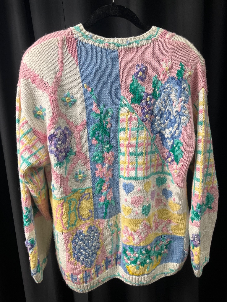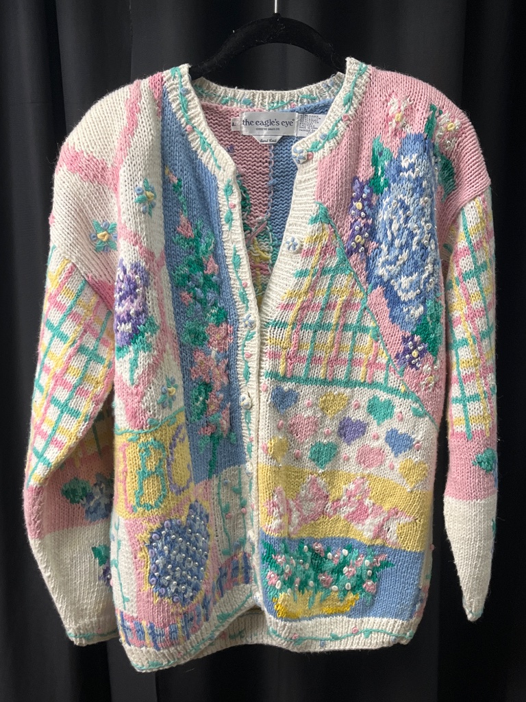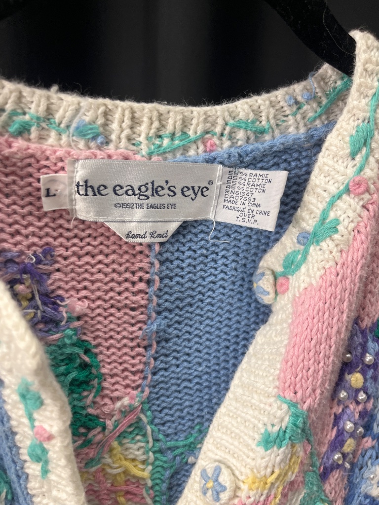 Colorful knitted cardigan by The Eagle’s Eye, marked ©1992 on the label. Features floral and geometric patterns with raised flowers and bead accents. Fabric composition includes 55% ramie and 45% cotton. Size L, made in China. CONDITION: Condition not assessed. SHIPPING: In-House Shipping Available