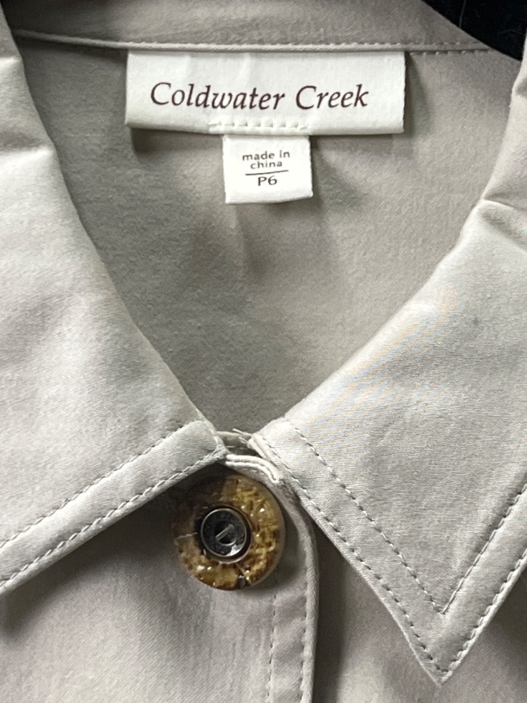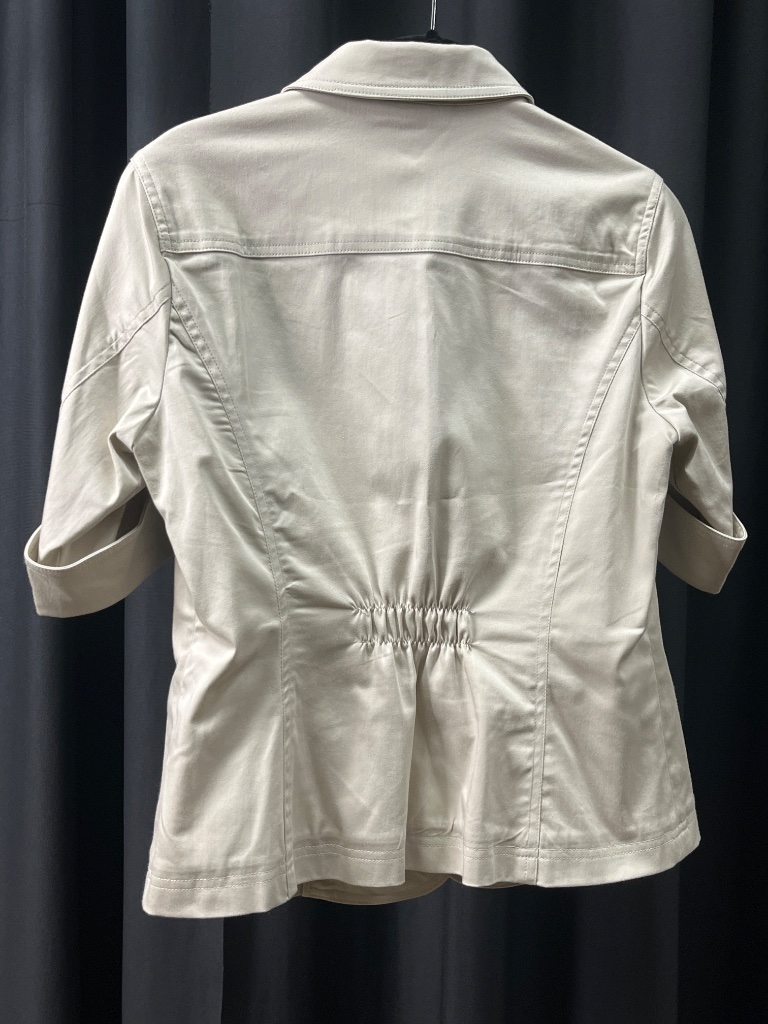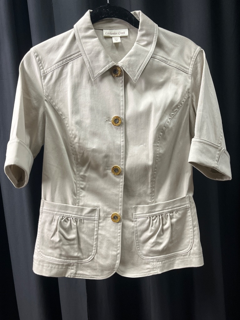 Coldwater Creek short-sleeve jacket in light beige cotton blend. Features a collared neckline, three buttons down the front with a decorative button at the collar, and two front pockets with gathered detailing. Label reads ‘Coldwater Creek’, ‘made in China’, and ‘P6’, indicating Petite size 6. CONDITION: Condition not assessed. SHIPPING: In-House Shipping Available