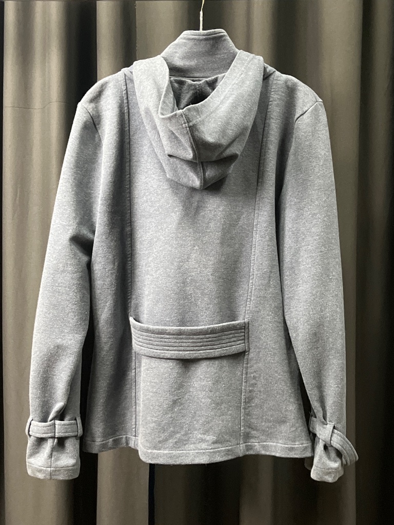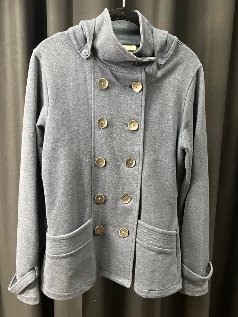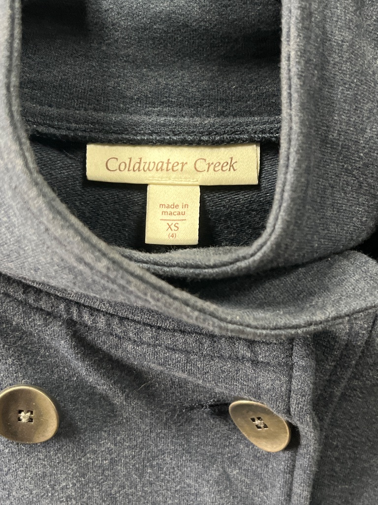 Coldwater Creek gray double-breasted jacket with hood. Features six large buttons on the front, two front pockets with horizontal stitching detail, and an attached hood. Label reads ‘Coldwater Creek’ and ‘Made in Macau’; size XS. CONDITION: Condition not assessed. SHIPPING: In-House Shipping Available