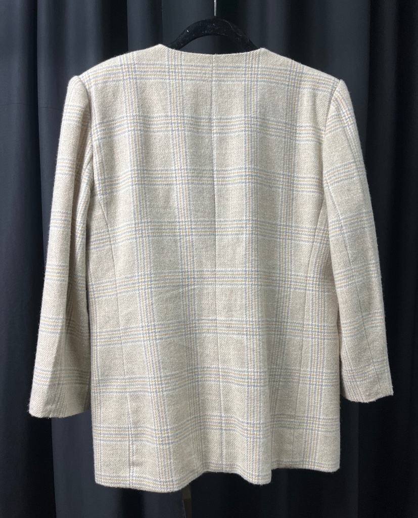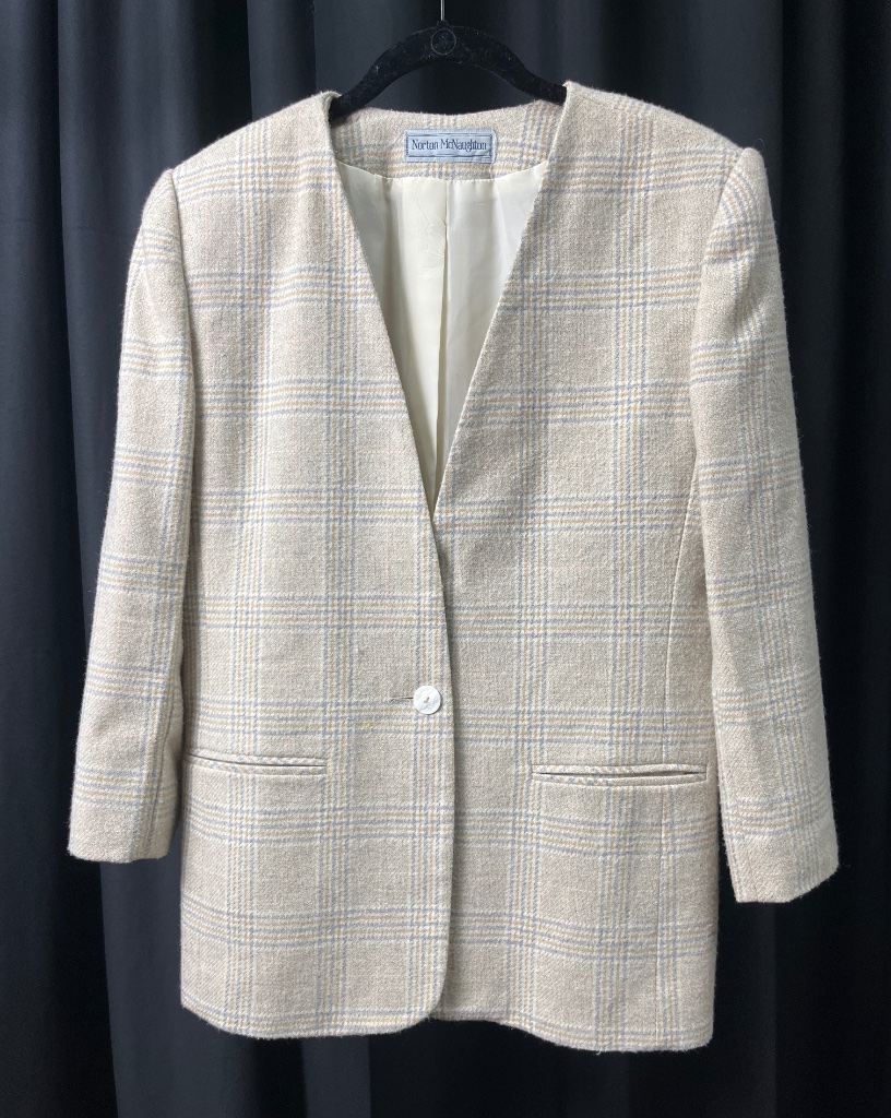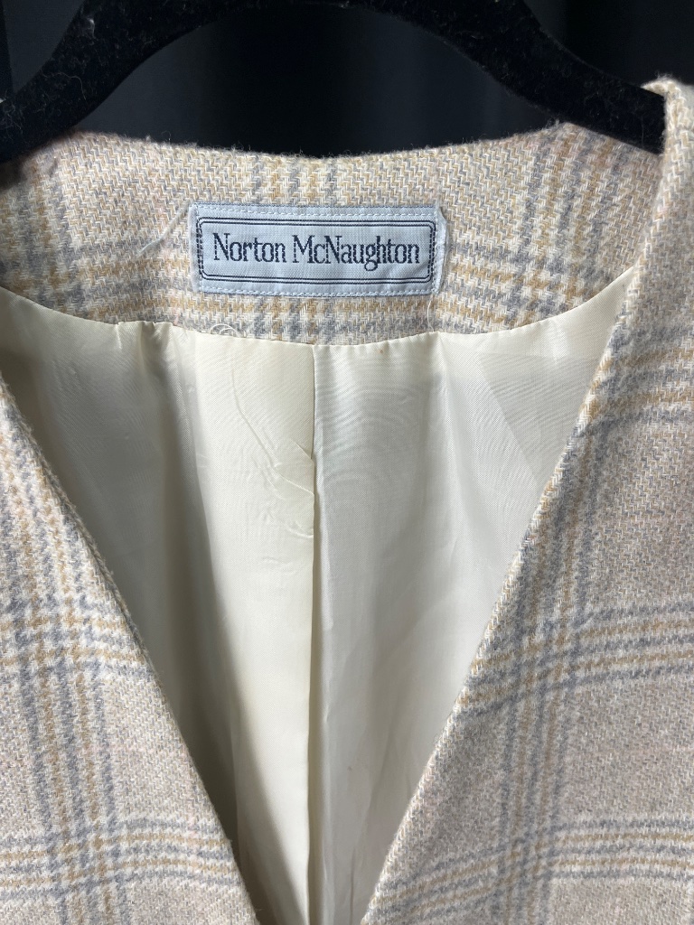 Norton McNaughton beige plaid blazer featuring a single button closure, two front pockets, long sleeves with a straight cut, and a lined interior. The label inside reads ‘Norton McNaughton.’ No size shown on tag. CONDITION: Condition not assessed. SHIPPING: In-House Shipping Available