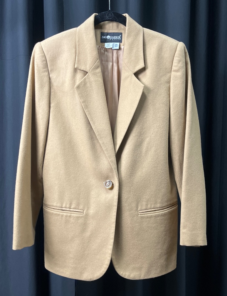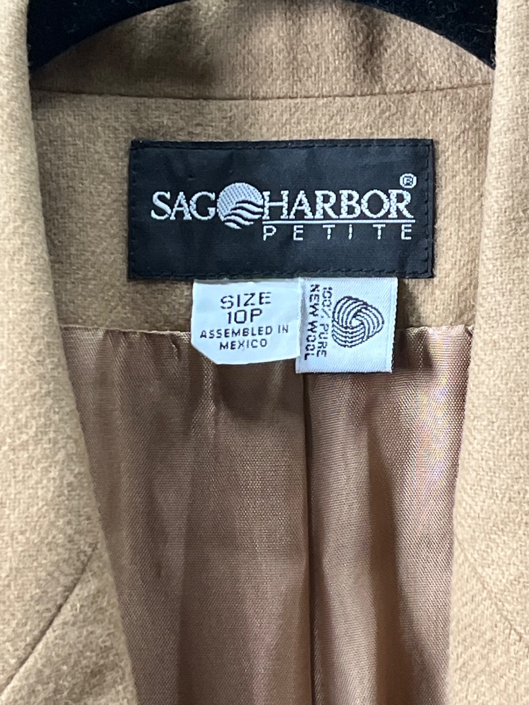 Sag Harbor tan blazer jacket in size 10P, featuring a single button closure and two front pockets with flaps. The label reads ‘SAG HARBOR PETITE’ and the size label reads ‘SIZE 10P’. Assembled in Mexico. CONDITION: Condition not assessed. SHIPPING: In-House Shipping Available