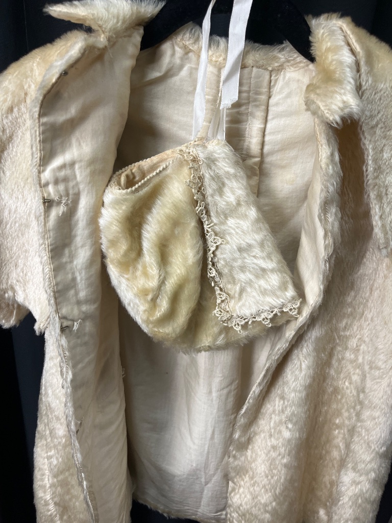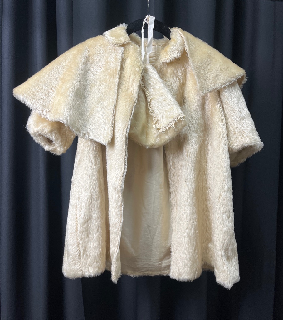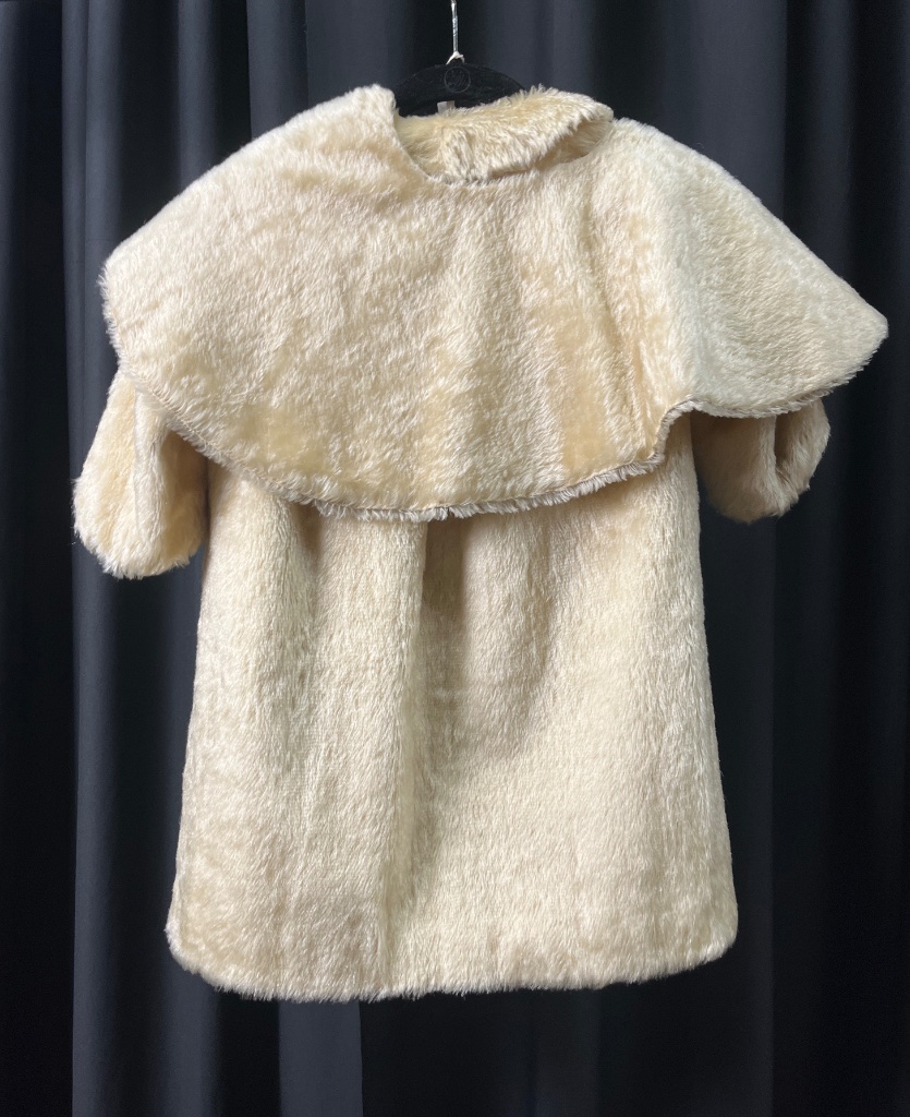 Children’s faux fur coat in light cream color with a soft, fluffy texture. Features short sleeves, a wide collar, and a smooth interior lining. Includes a small matching Bonnet attached inside the coat, consistent with mid-century children’s fashion styling. CONDITION: Condition not assessed. SHIPPING: In-House Shipping Available