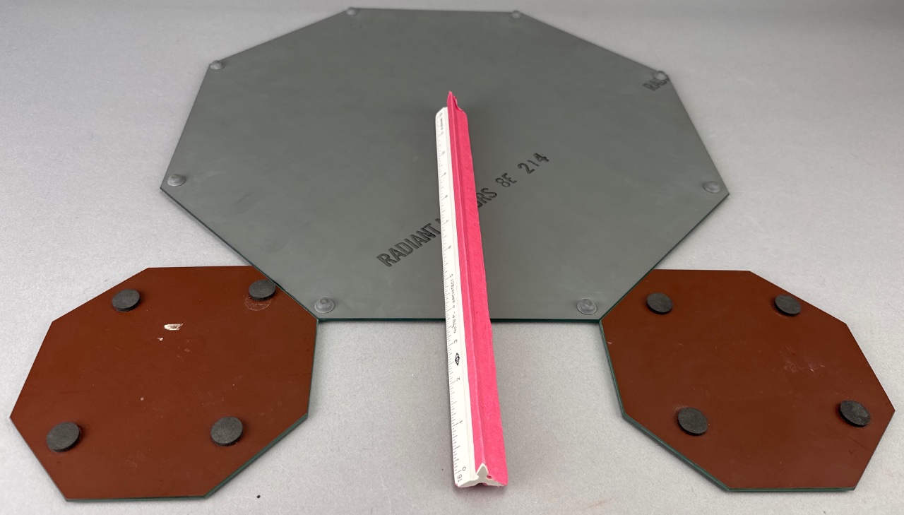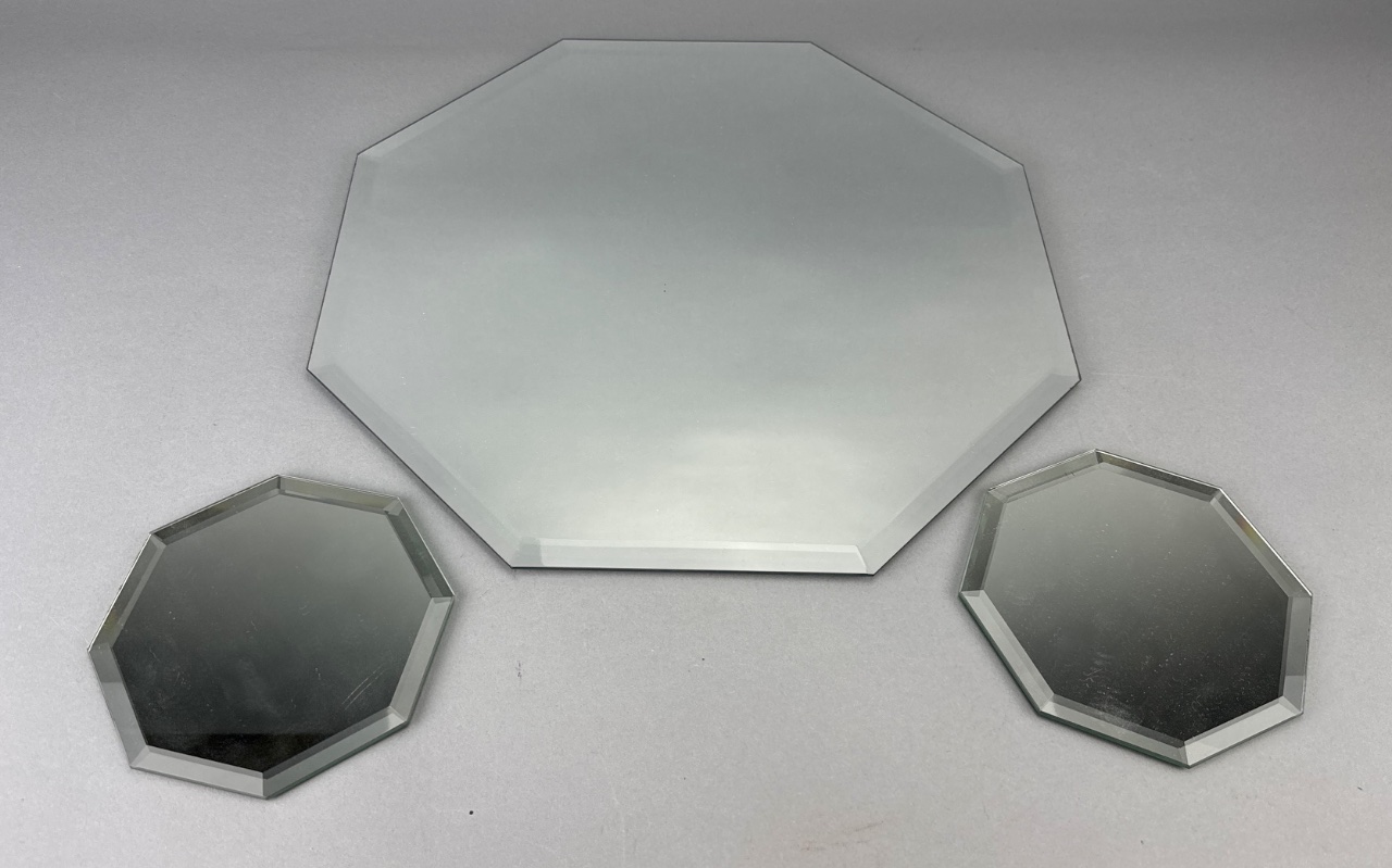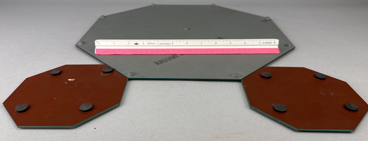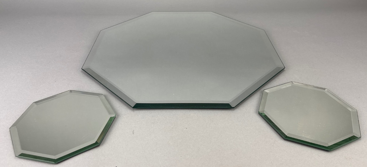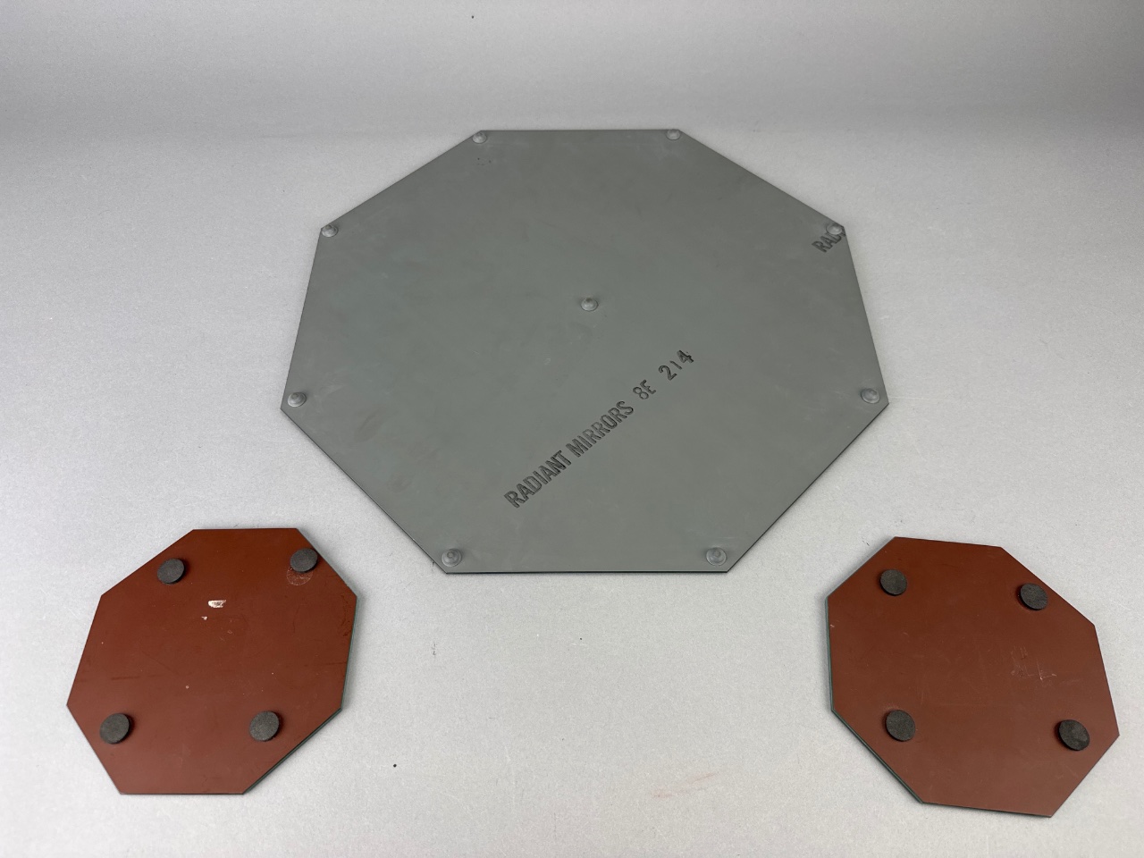Radiant Mirrors octagonal glass mirror set featuring one larger mirror with a gray tint and two smaller mirrors with a darker tint. All mirrors have beveled edges, with the smaller mirrors backed in brown and fitted with black rubber pads. The underside of the larger mirror bears the marking ‘RADIANT MIRRORS 8E 214.’ Larger one measures about 13″W. CONDITION: Minor scratches visible on the surface of the mirrors. Some wear observed on the brown backing of the smaller mirrors. SHIPPING: In-House Shipping Available