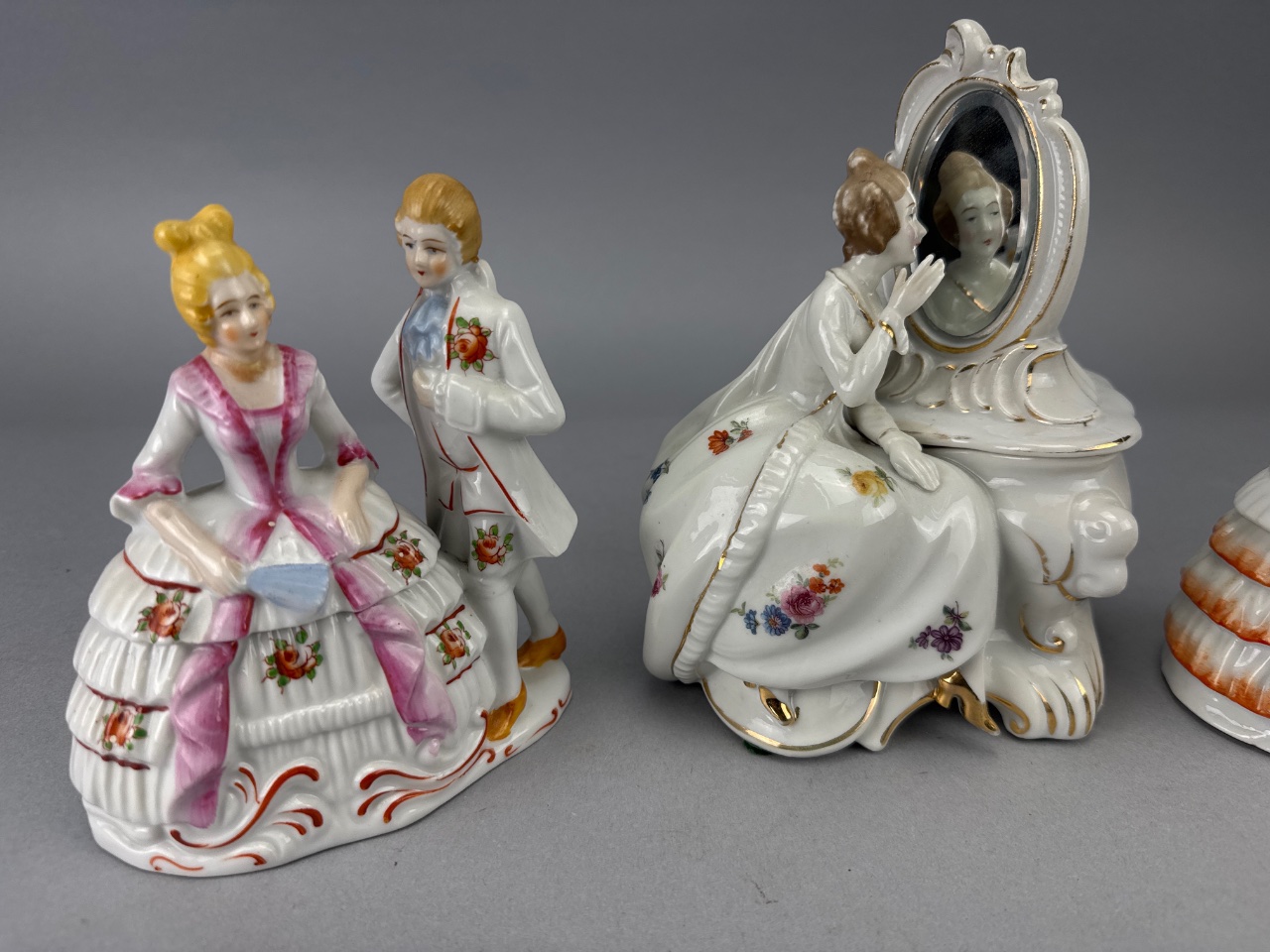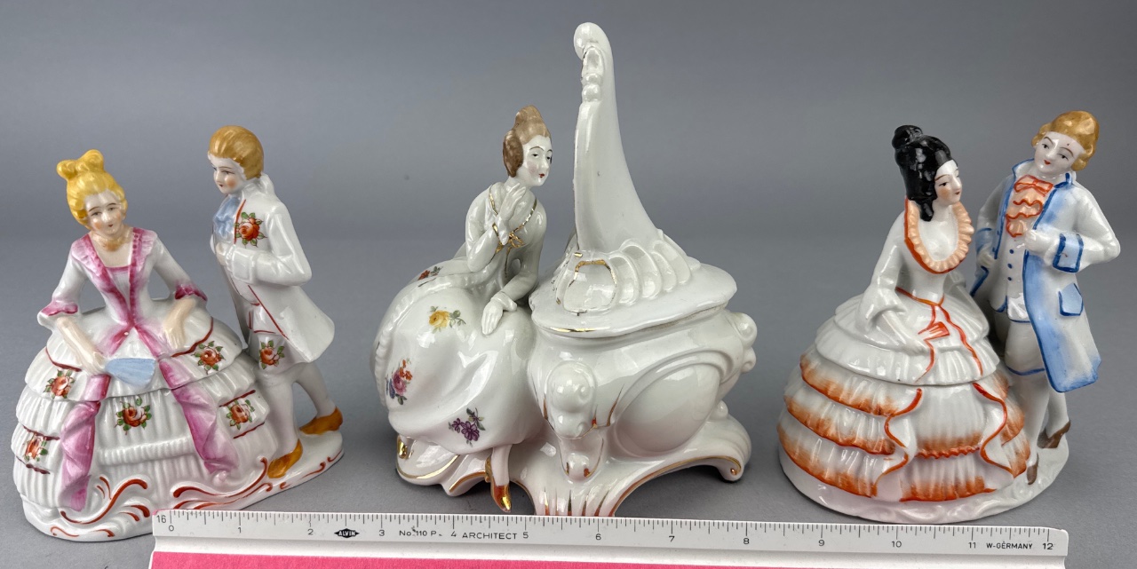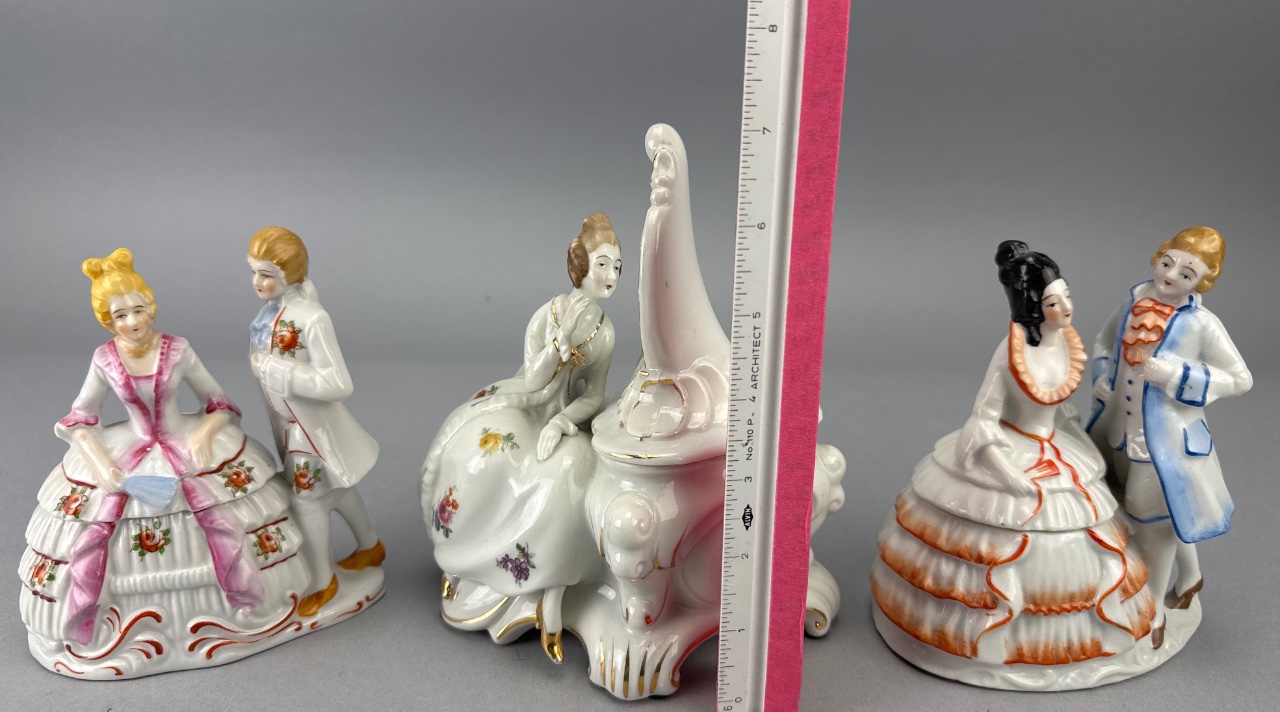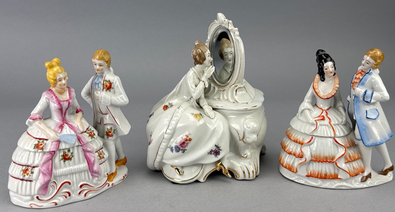 Set of three porcelain figurines by Bermay, Fifth Avenue, New York. Each figurine depicts elegantly dressed individuals with floral decorations, including a woman sitting and looking into a mirror, a couple with the woman in a pink dress and the man in a white suit, and another couple with the woman in a white dress with orange accents and the man in a blue coat. Marked ‘Bermay, Fifth Avenue, New York’ on the base and sticker. Taller one is 7″H. CONDITION: Minor wear to the gold accents on the mirror frame. Some surface dust visible on the figurines. SHIPPING: In-House Shipping Available