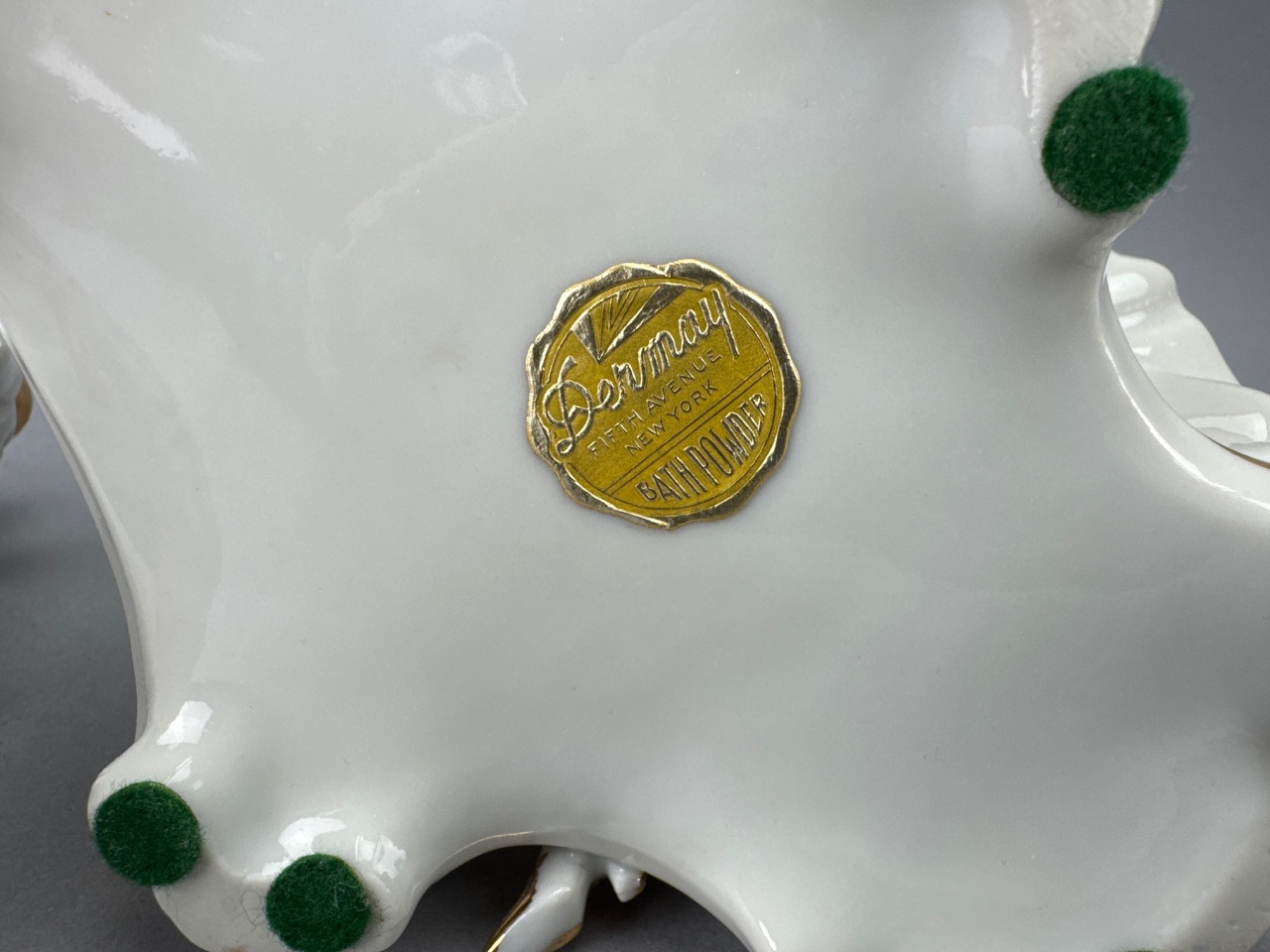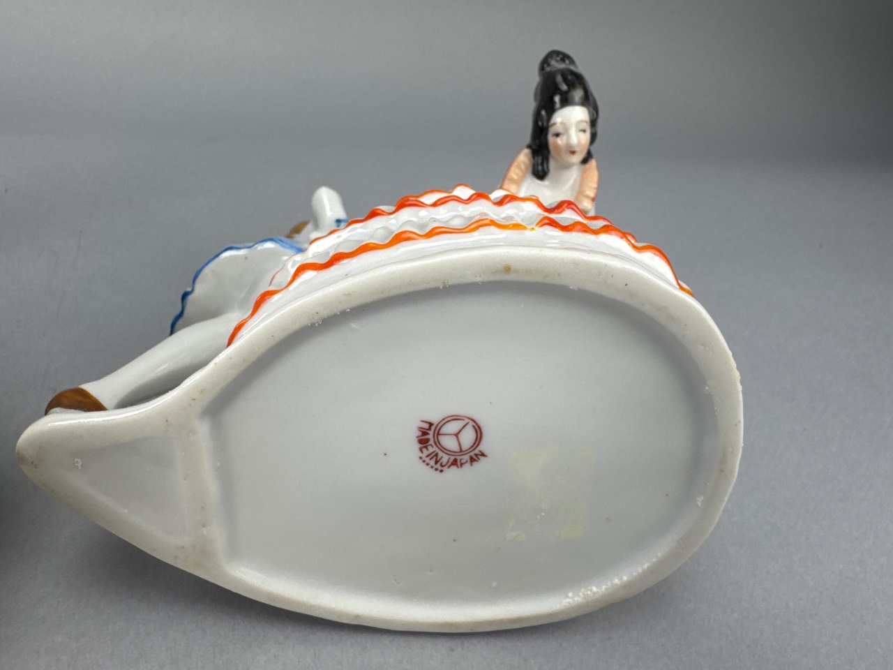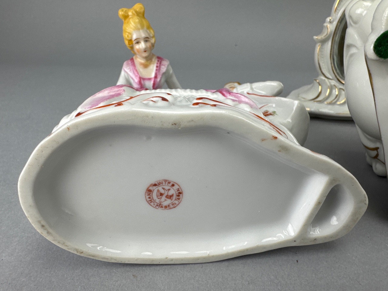 Set of three porcelain figurines by Bermay, Fifth Avenue, New York. Each figurine depicts elegantly dressed individuals with floral decorations, including a woman sitting and looking into a mirror, a couple with the woman in a pink dress and the man in a white suit, and another couple with the woman in a white dress with orange accents and the man in a blue coat. Marked ‘Bermay, Fifth Avenue, New York’ on the base and sticker. Taller one is 7″H. CONDITION: Minor wear to the gold accents on the mirror frame. Some surface dust visible on the figurines. SHIPPING: In-House Shipping Available
