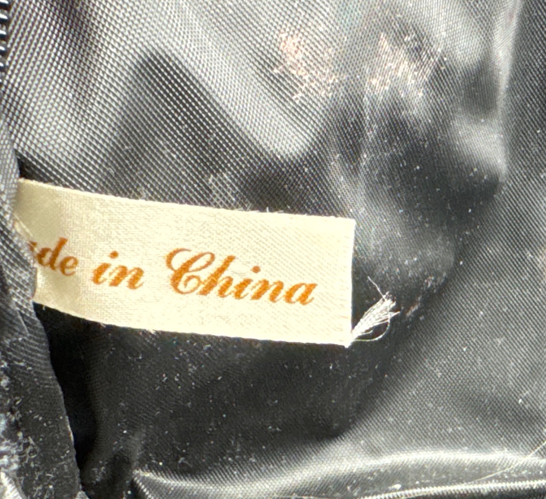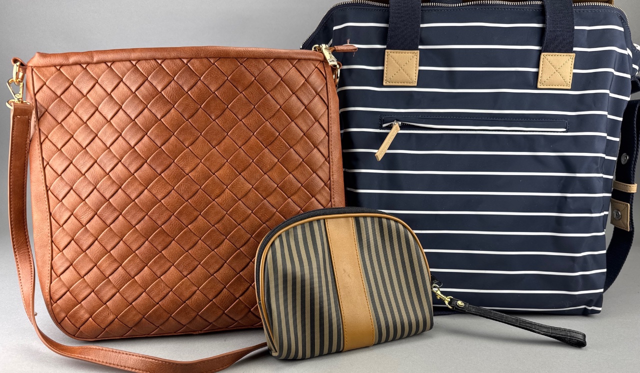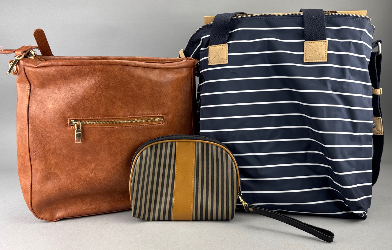 Group lot of three fashion accessories marked ‘Made in China,’ including a brown leather shoulder bag with zippered pocket, a navy striped canvas tote bag with tan accents and shoulder strap, and a striped canvas cosmetic pouch with tan center stripe. All items are mass-market imports, typical of budget accessory lines. CONDITION: Condition not assessed. SHIPPING: In-House Shipping Available