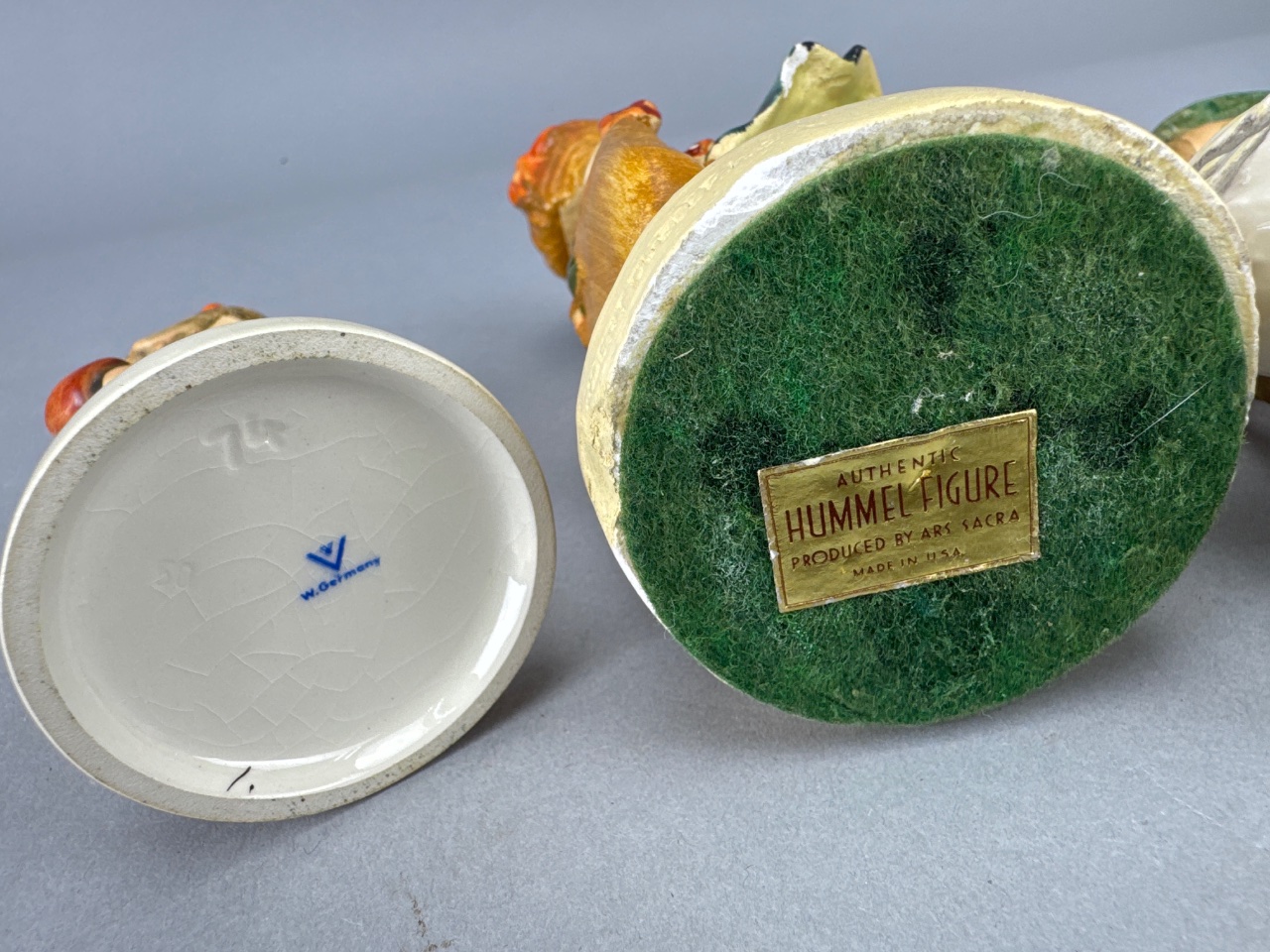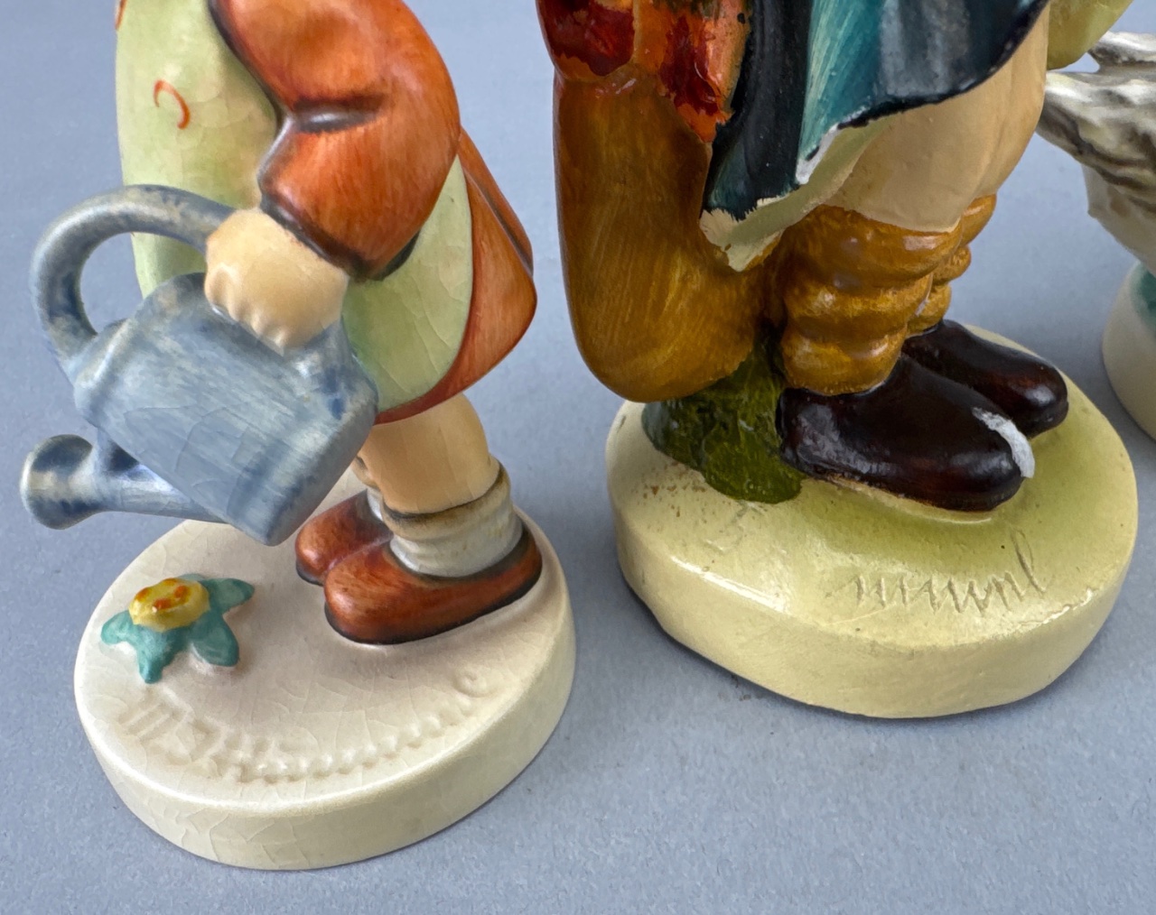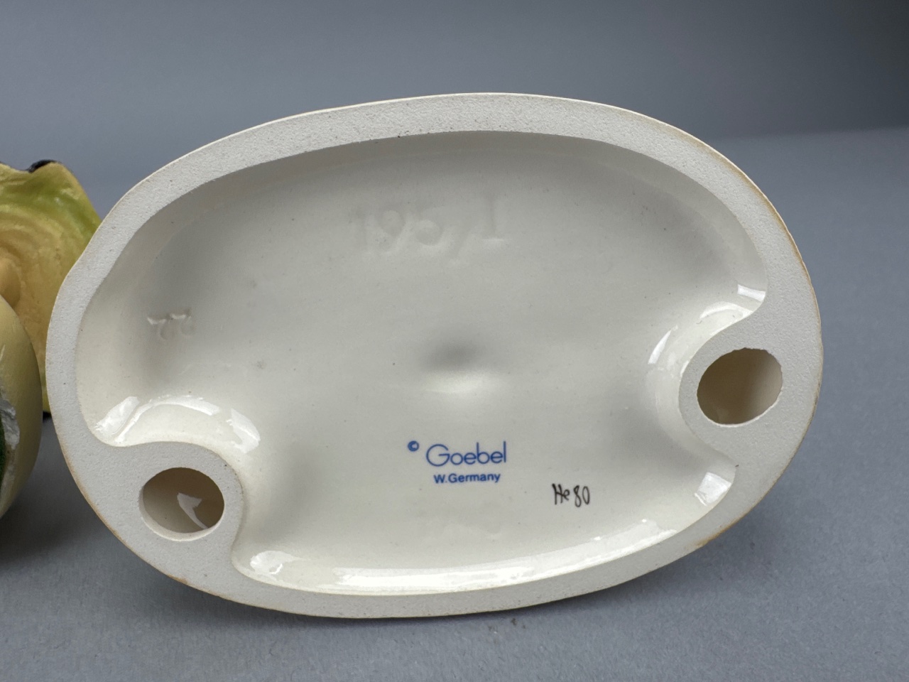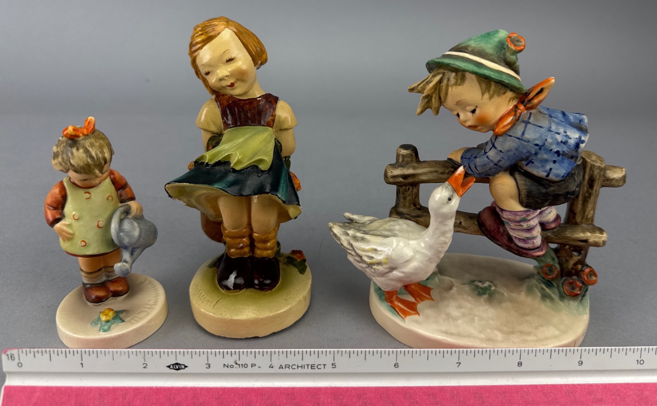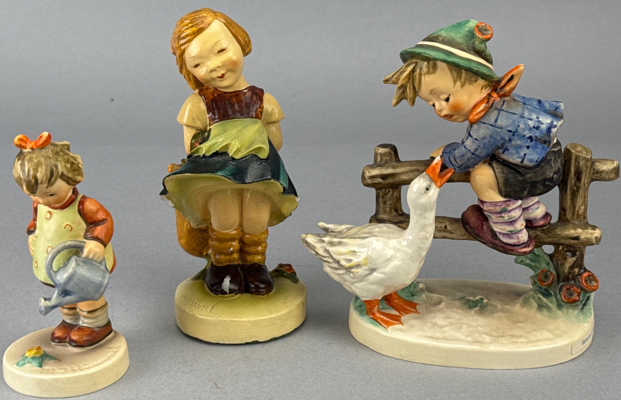 Set of three Goebel ceramic Hummel figurines, including a child with a watering can, a girl in a green and brown dress with yellow boots, and a boy in a blue shirt and green hat sitting on a fence with a goose. Each figurine bears a visible mark: ‘Goebel W. Germany’ on the first and third figurines, and ‘Hummel’ on the second figurine. Glossy finish throughout. Measure 2″-4″W. CONDITION: No visible chips or cracks observed on any figurine. Minor surface wear visible on the bases. SHIPPING: In-House Shipping Available