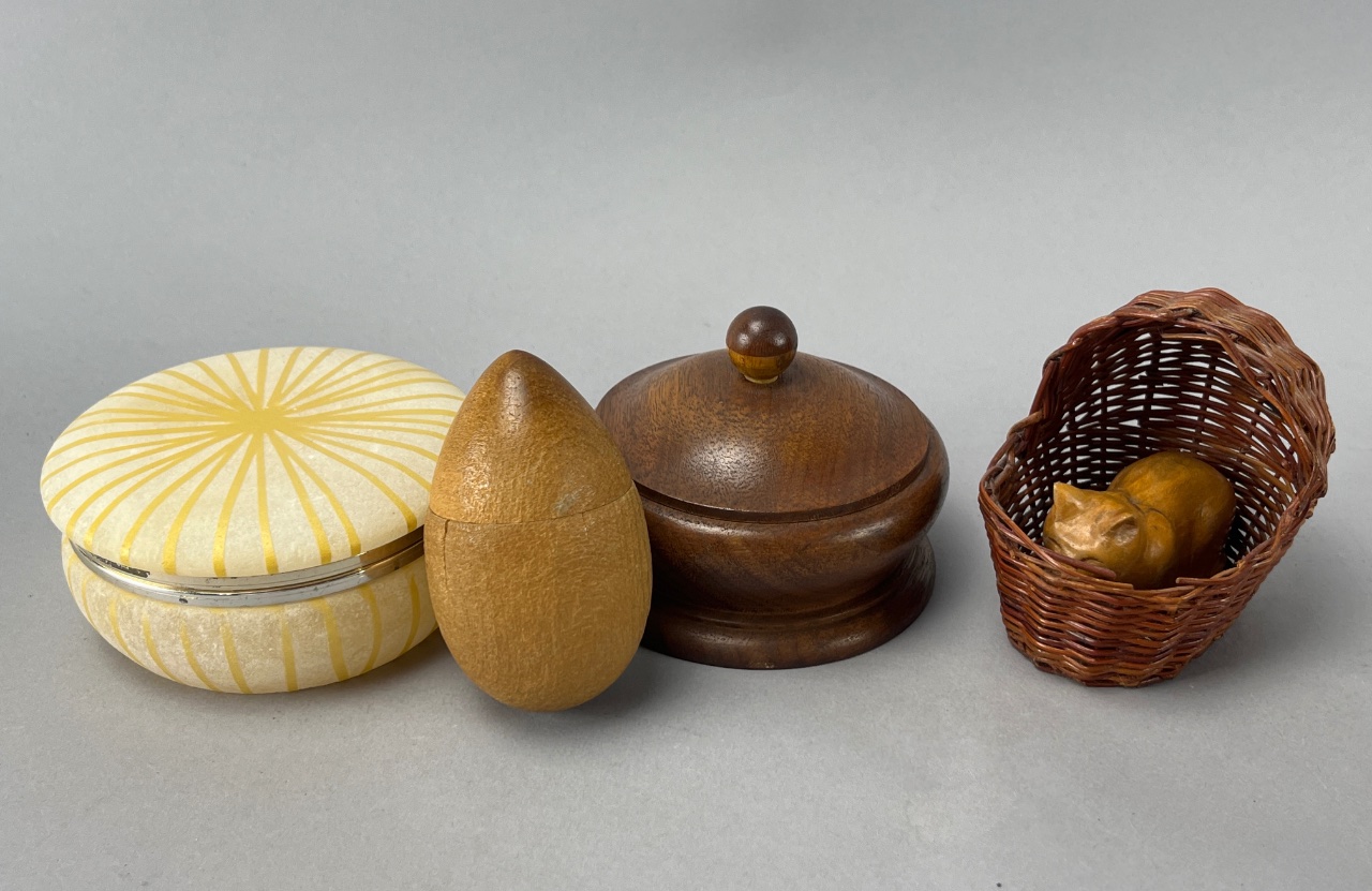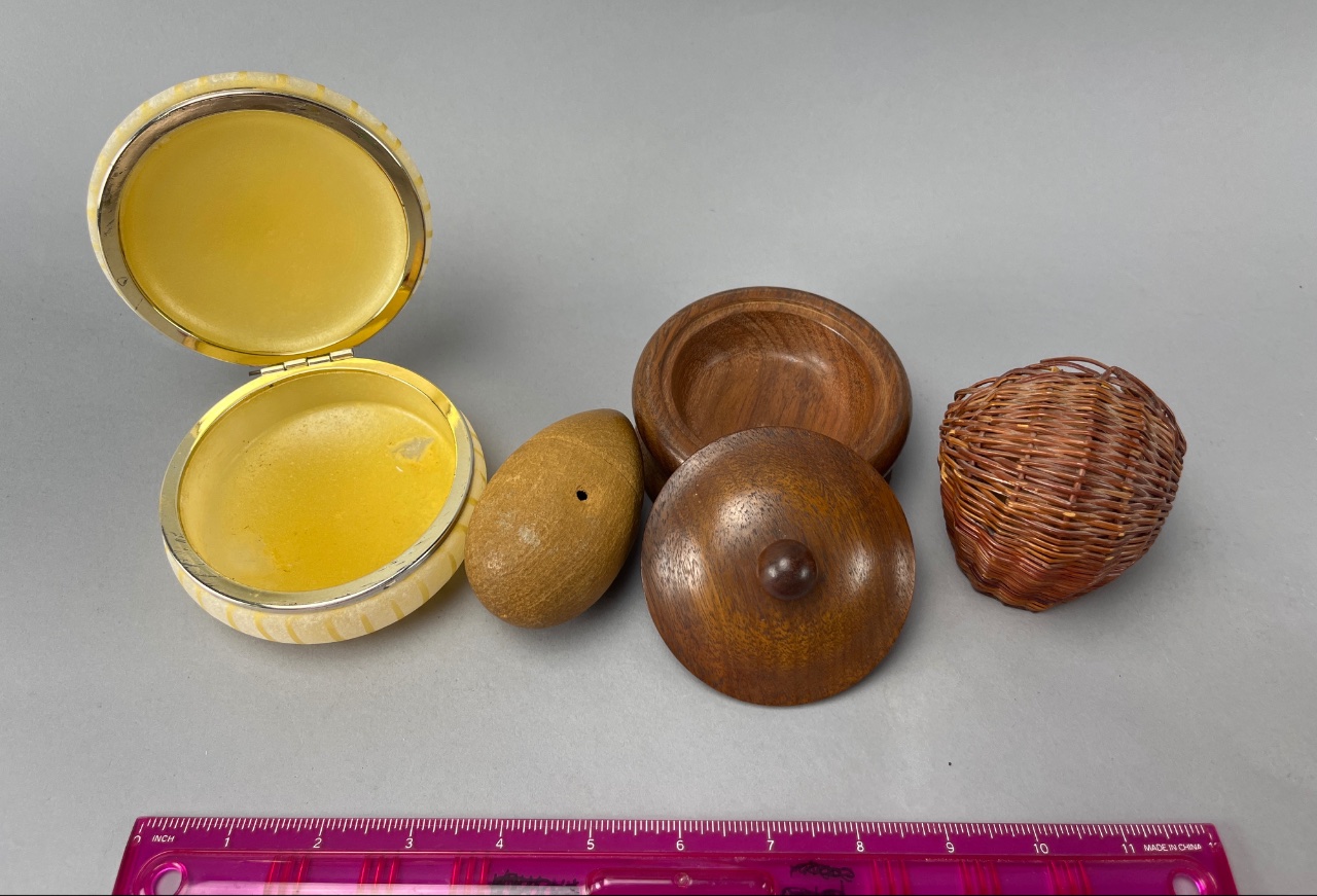 Grouping of decorative wooden containers and a woven basket containing a small animal figure. Includes a round container with a yellow and white striped lid and silver band, a wooden egg-shaped container with a smooth finish, a small wooden bowl with a rounded lid and knob, and a woven basket. Materials include wood, metal, and woven material. measure about 2″-3″. CONDITION: Condition not assessed. SHIPPING: In-House Shipping Available