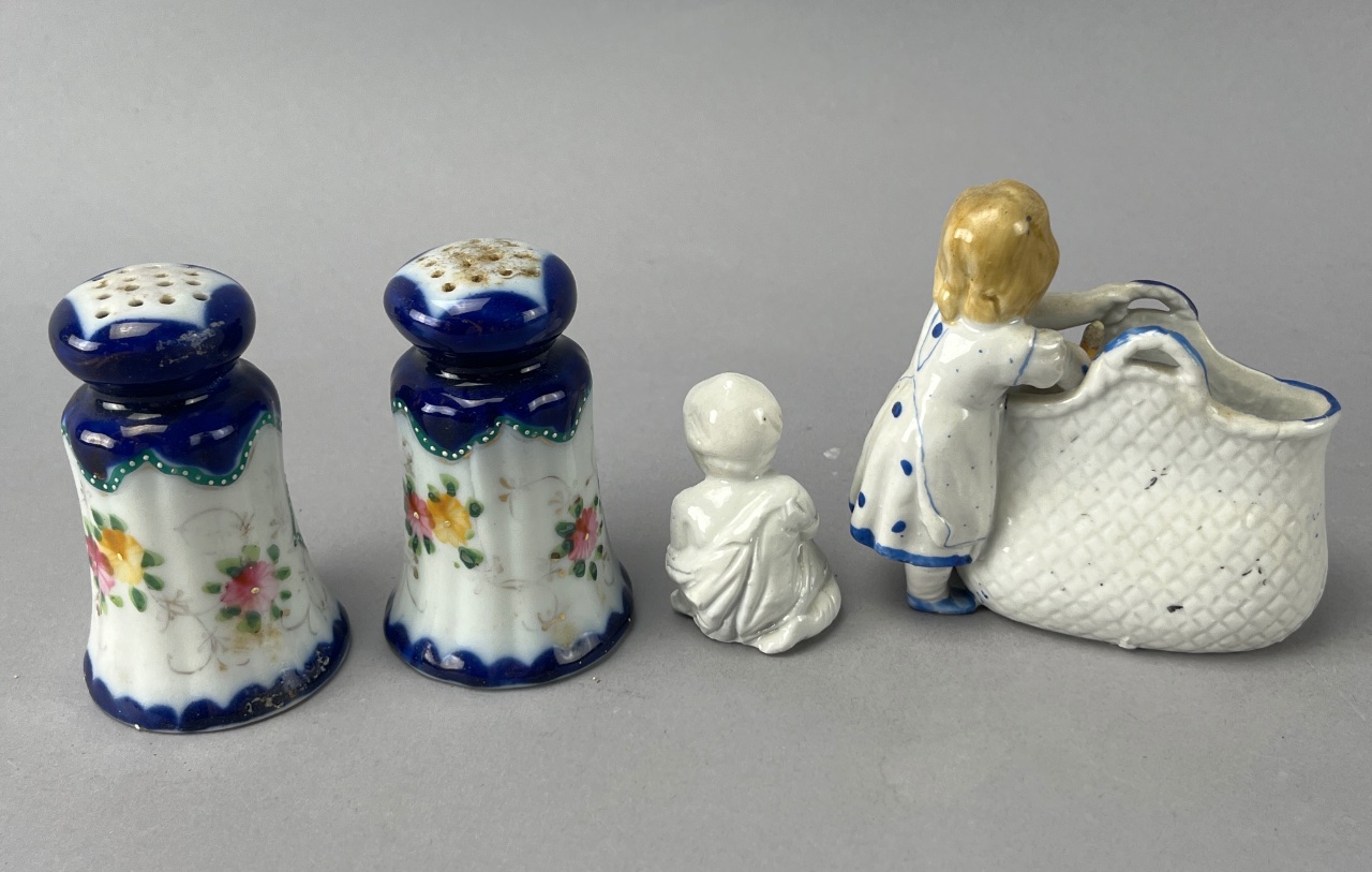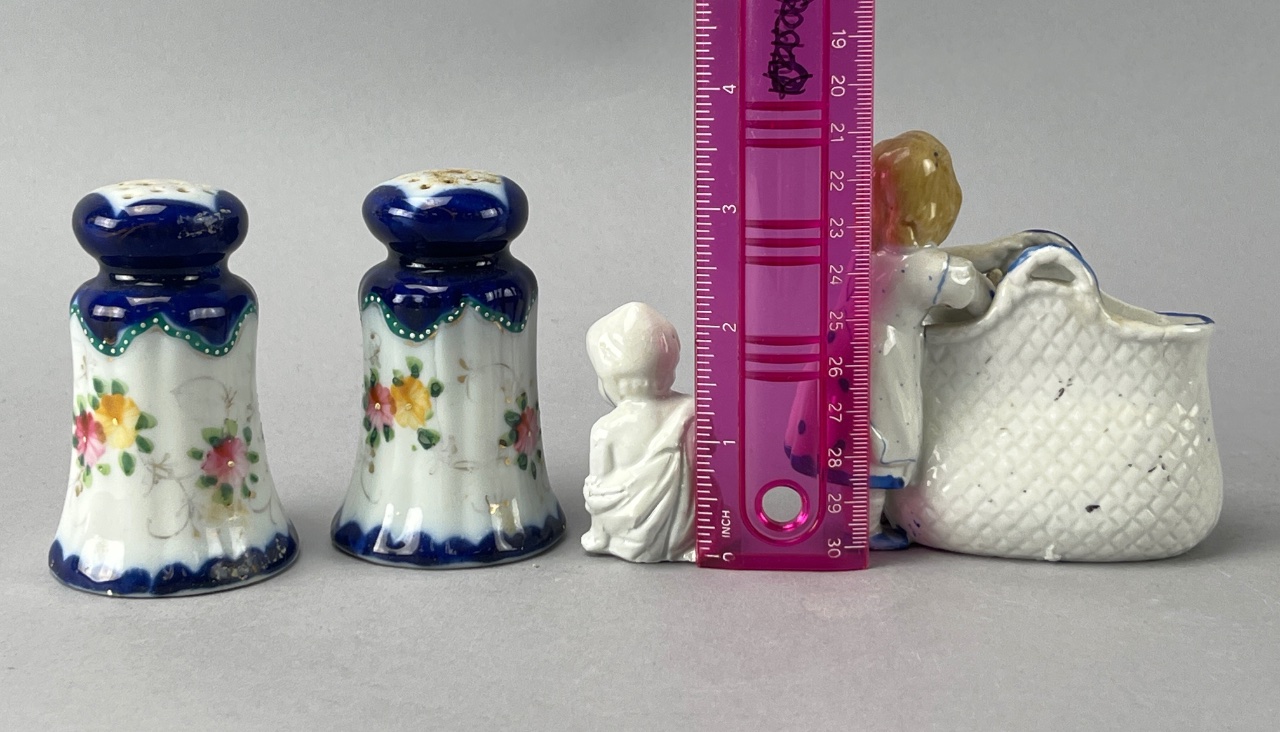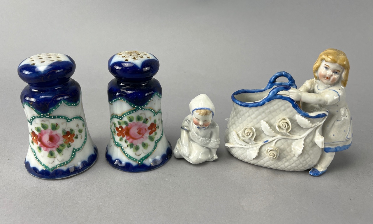Group lot including a pair of ceramic salt and pepper shakers with floral decoration and blue tops, a small figurine of a child kneeling with a white hood, and a small basket with a child figure holding it, decorated with roses. The salt and pepper shakers feature surface wear and dirt on the tops, while the figurines and basket show no visible damage. Tallest is 3.5″H. CONDITION: Surface wear and dirt visible on the shaker tops. No visible damage to the figurines or basket. SHIPPING: In-House Shipping Available