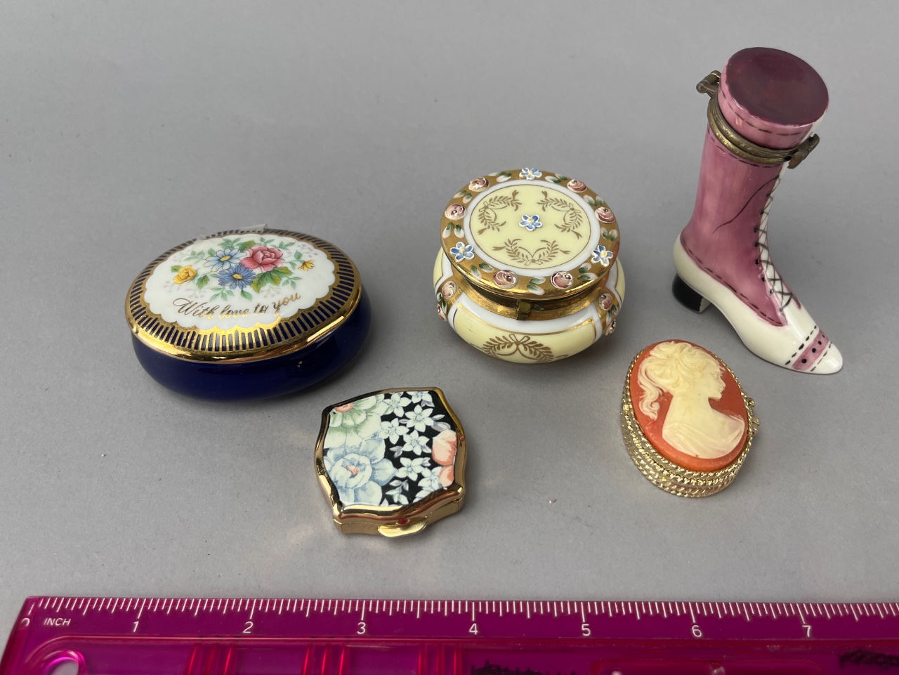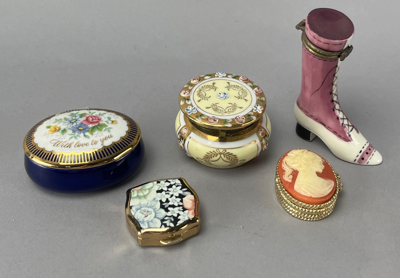 Grouping of five decorative porcelain boxes and a boot-shaped container. The blue box lid bears the inscription ‘With love to you.’ Designs include floral motifs with gold accents, a cameo-style lid featuring a profile of a woman, and a pink boot-shaped container with black laces and a small heel. each measures about 1″-2″. CONDITION: Condition not assessed. SHIPPING: In-House Shipping Available