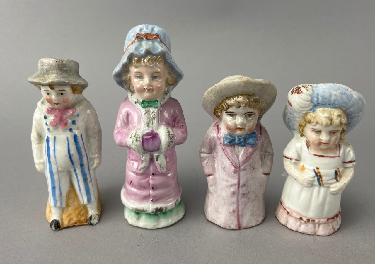 Set of four ceramic figurine salt and pepper shakers, each featuring distinct clothing and hats with holes on top for shaker functionality. Painted in various colors including pink, blue, and white. Bases are flat and stable. Taller one is 4″H. CONDITION: Some paint wear and chipping visible on the hats. No significant cracks or breaks observed. SHIPPING: In-House Shipping Available