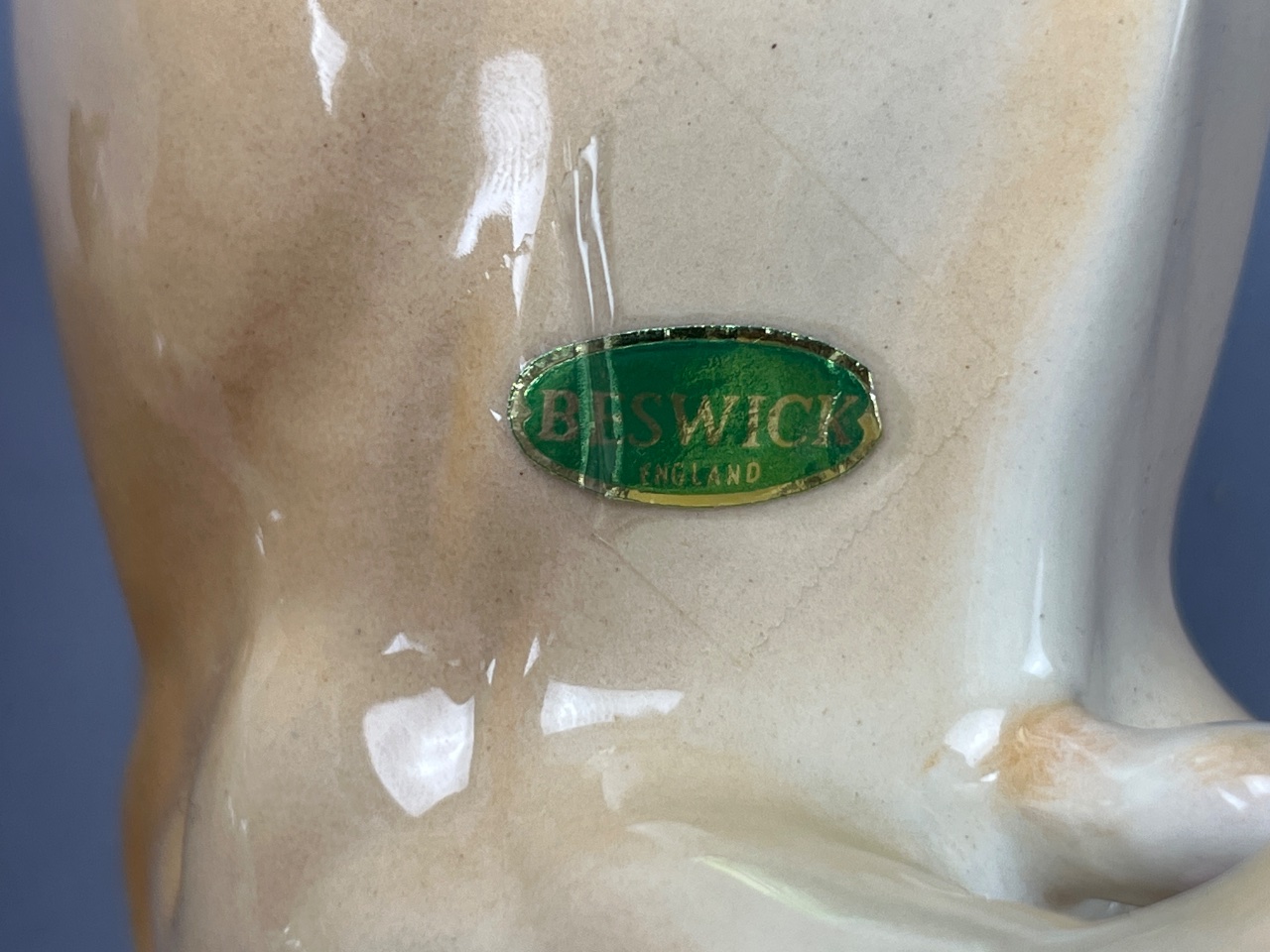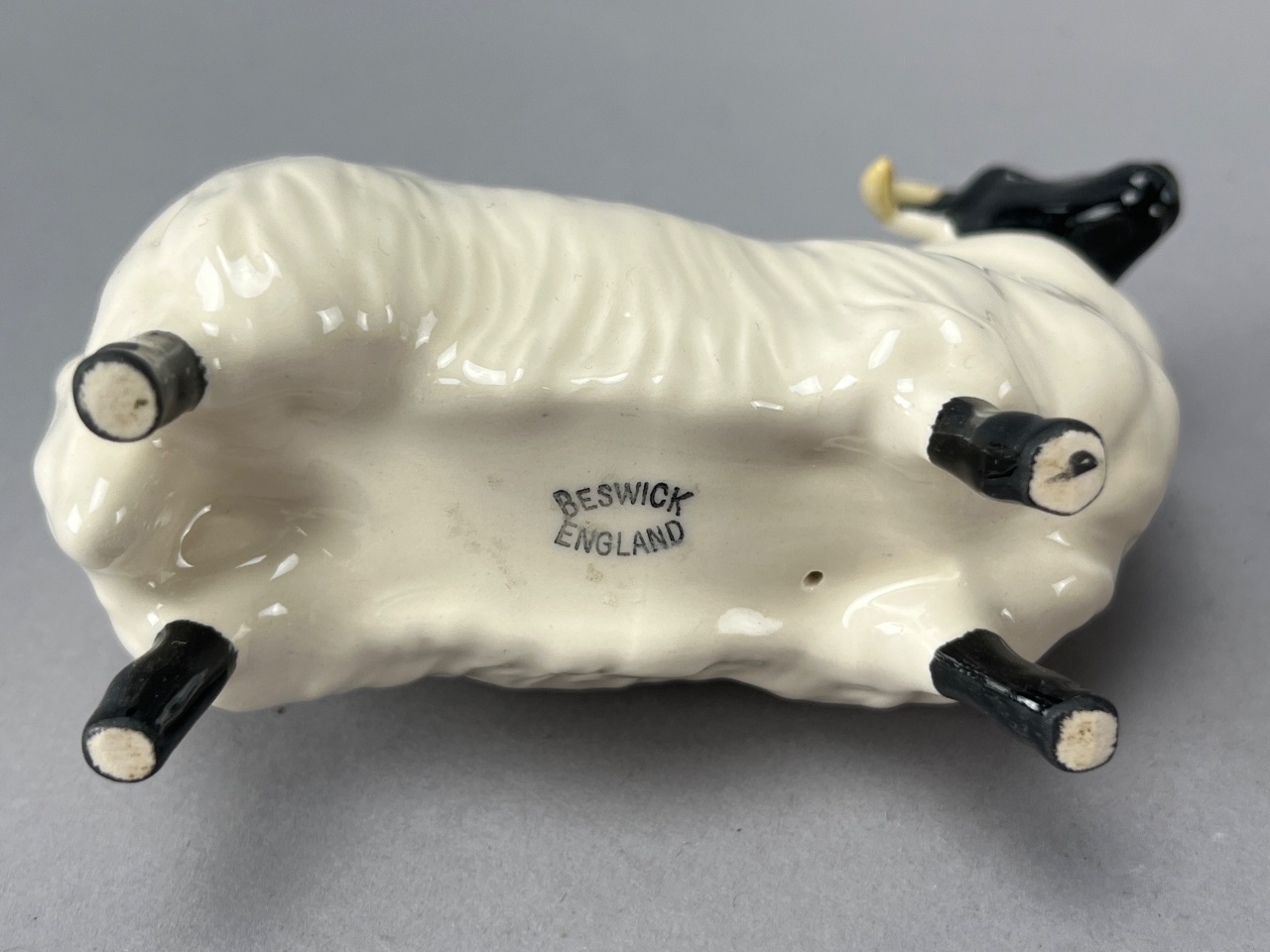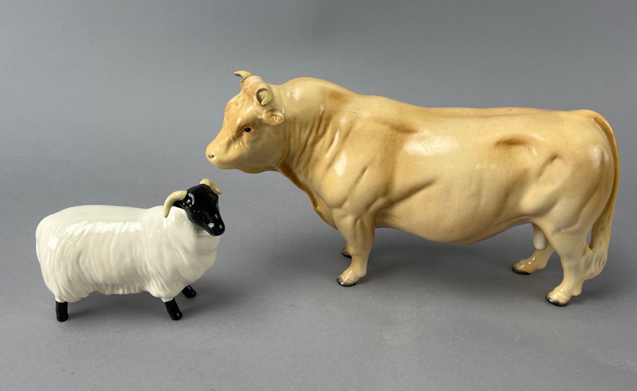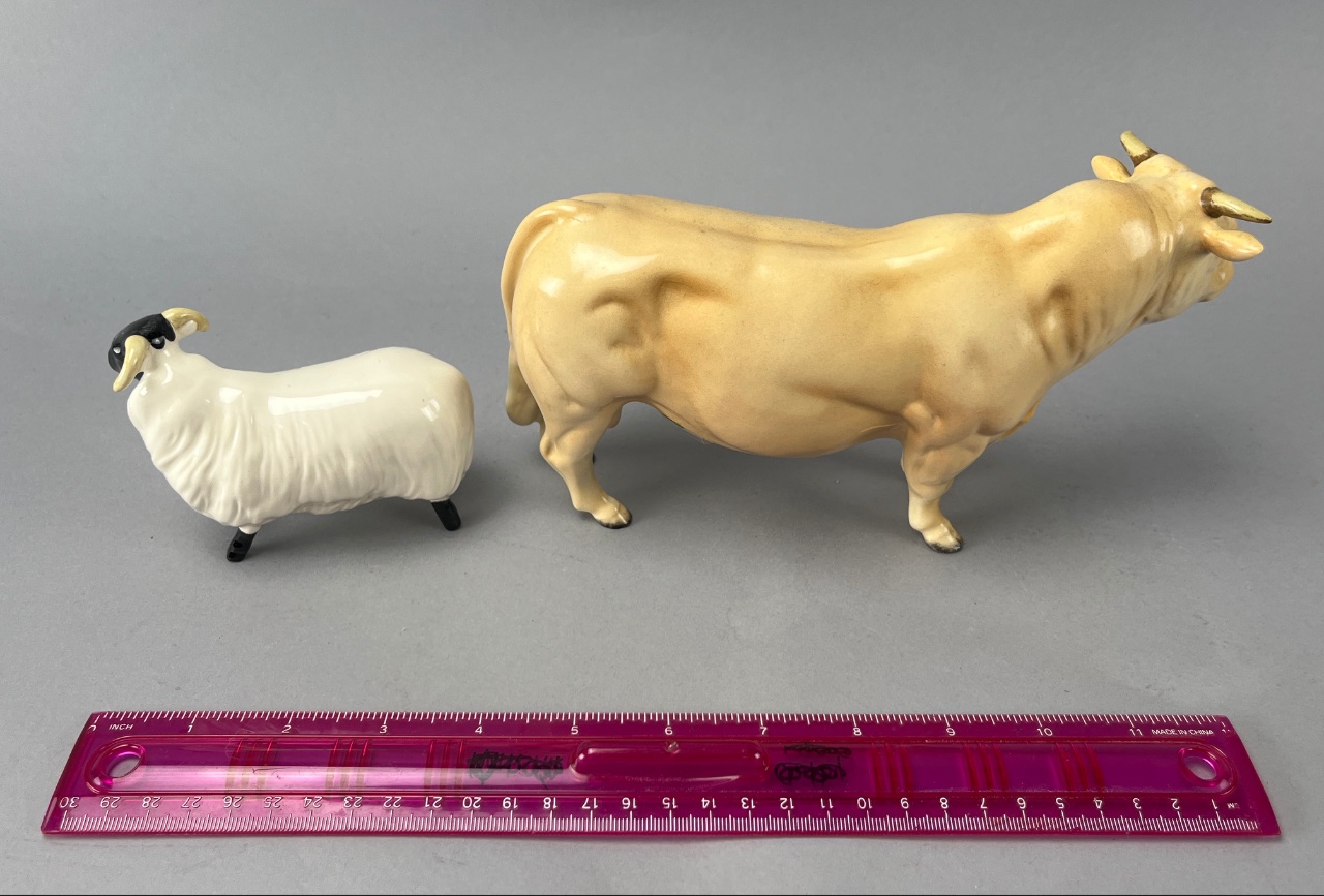 Pair of Beswick ceramic animal figures, including a tan bull with smooth finish and muscle definition, and a white sheep with black face and legs featuring a textured wool appearance. Both bases are marked ‘BESWICK ENGLAND.’ Bull is 6″L. CONDITION: Condition not assessed. SHIPPING: In-House Shipping Available
