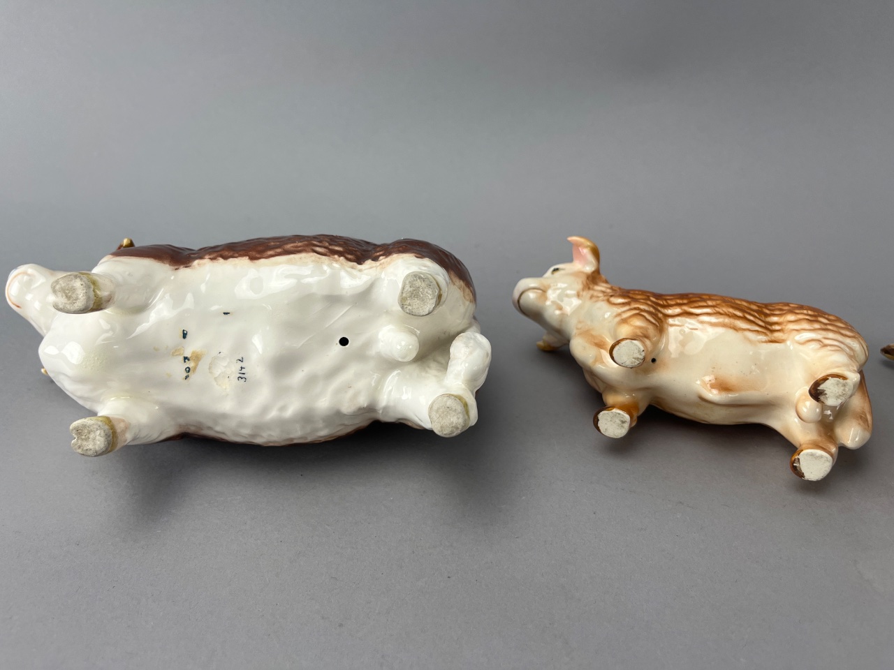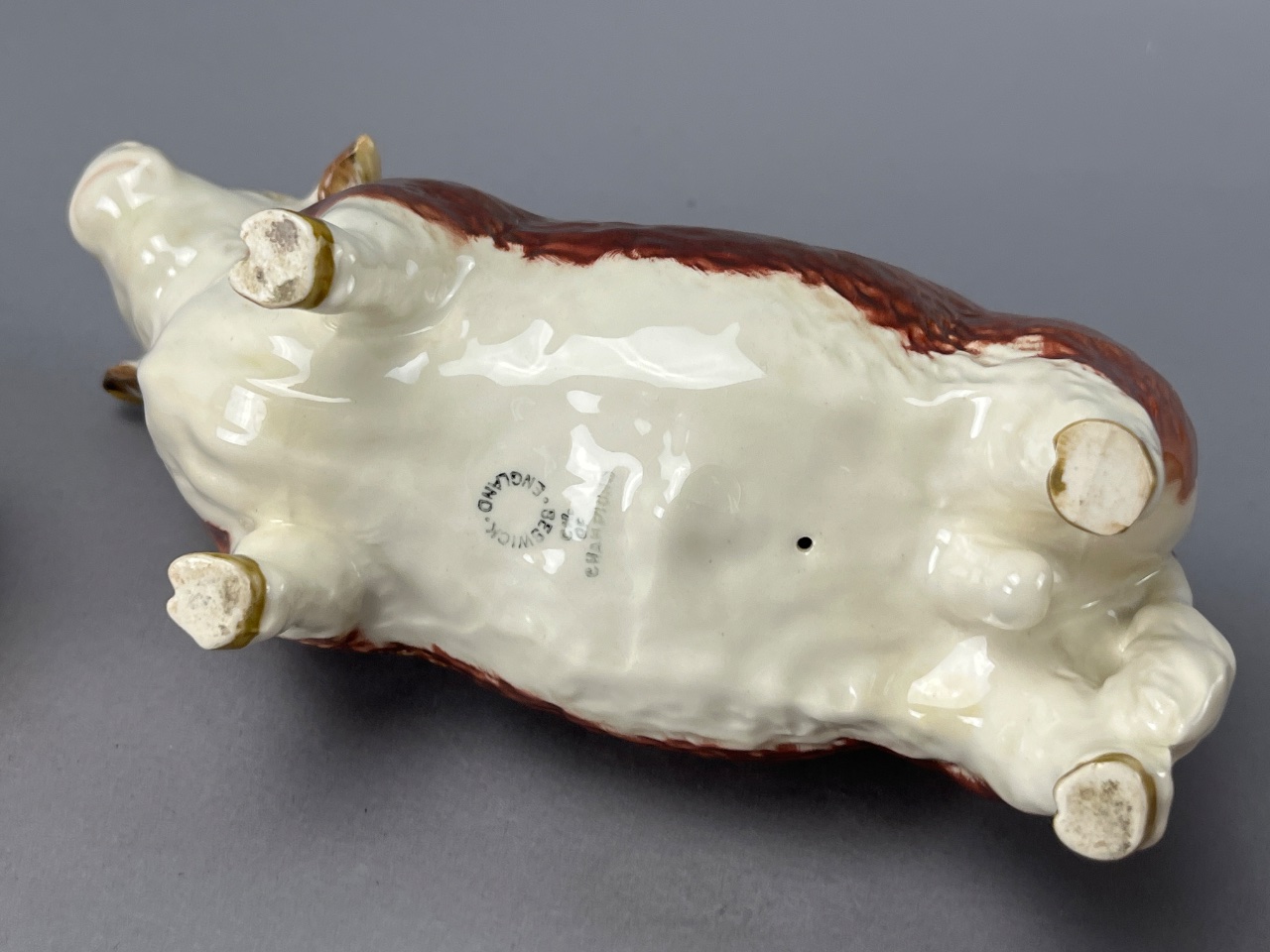 Set of three Beswick ceramic cattle figures featuring glossy brown and white finishes. The largest figure bears a mark reading ‘BESWICK ENGLAND’ on its underside. Includes one large, one medium, and one small figure. Larger is 4″W. CONDITION: Minor surface wear consistent with age. No visible chips or cracks observed. SHIPPING: In-House Shipping Available