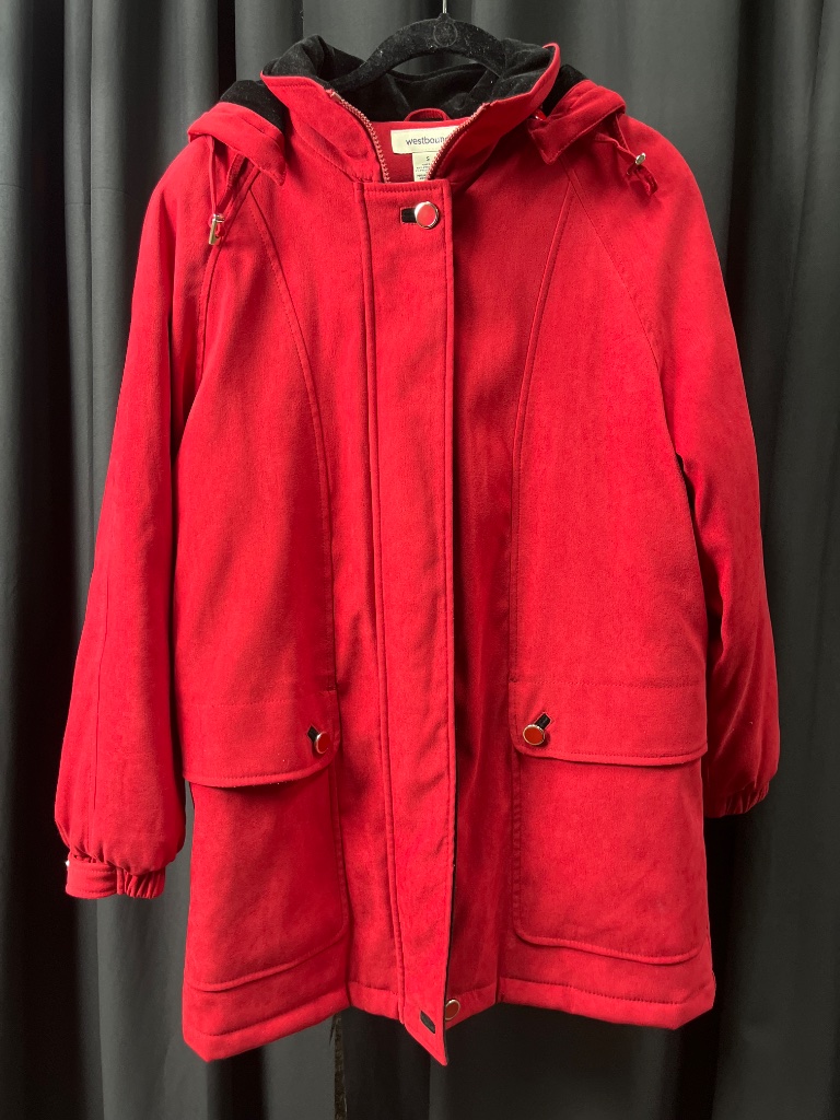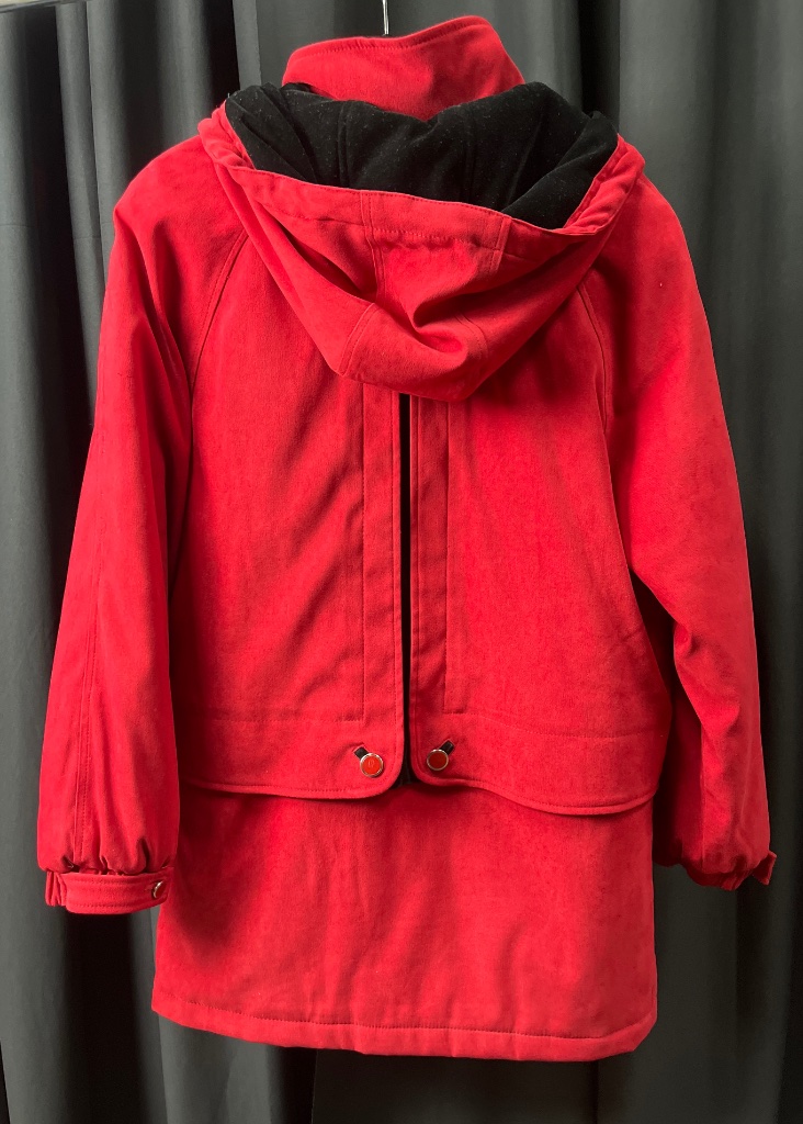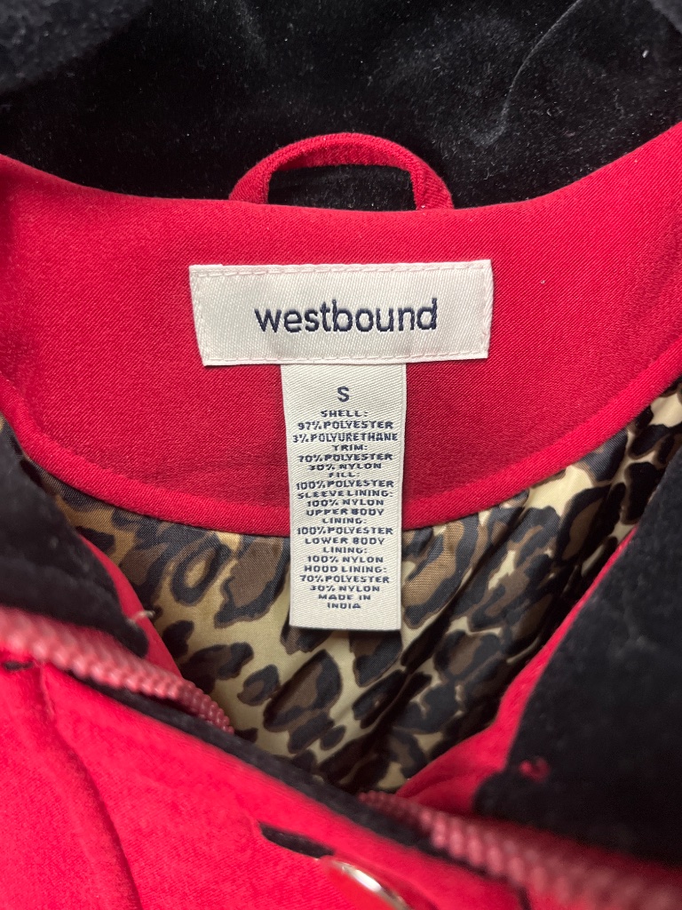 Westbound red hooded jacket featuring a leopard print interior lining. The jacket includes a front button closure, two front pockets with button closures, and a hood. The shell is composed of 97% polyester and 3% polyurethane, with interior linings made of polyester and nylon blends. Label inside reads ‘westbound’ with size ‘S’. Made in India. CONDITION: Condition not assessed. SHIPPING: In-House Shipping Available