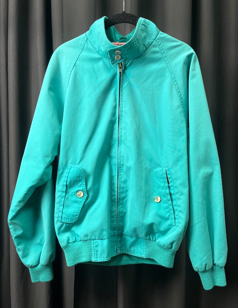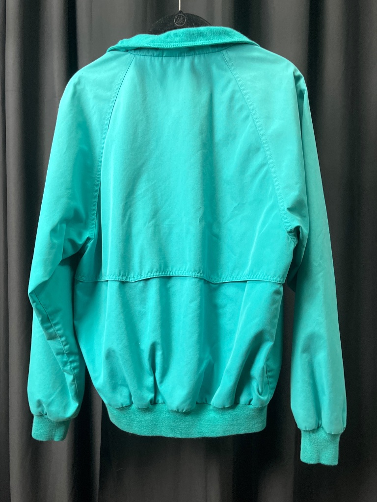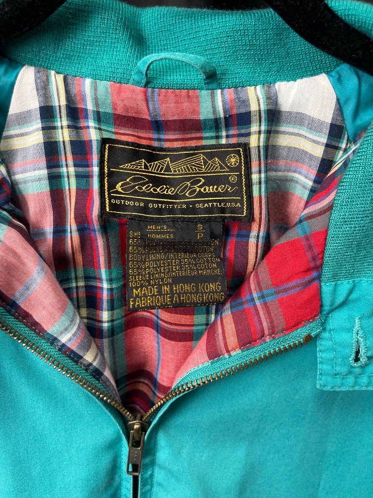 Eddie Bauer teal zip-front jacket featuring a stand-up collar, two front pockets with button closures, elastic cuffs and waistband, and plaid lining. The label inside reads ‘Eddie Bauer Outdoor Outfitter – Seattle, U.S.A.’ and the jacket is marked ‘Made in Hong Kong.’ Mens size S. CONDITION: Condition not assessed. SHIPPING: In-House Shipping Available