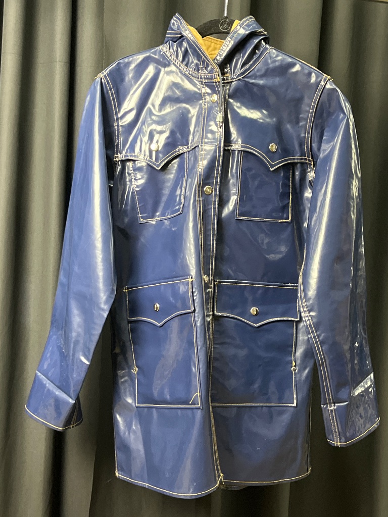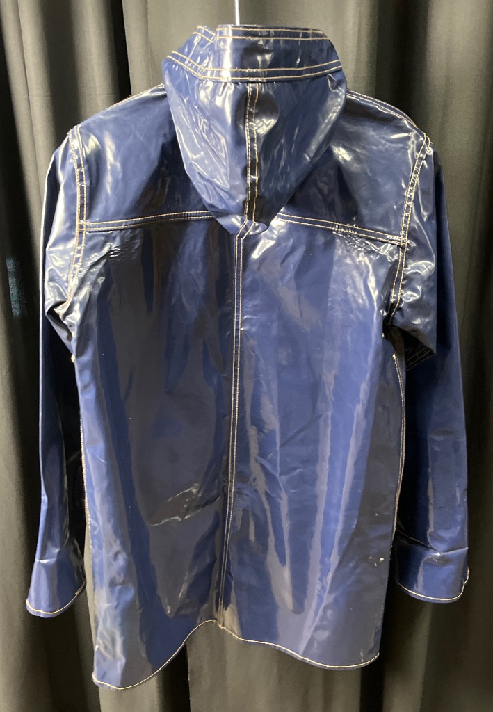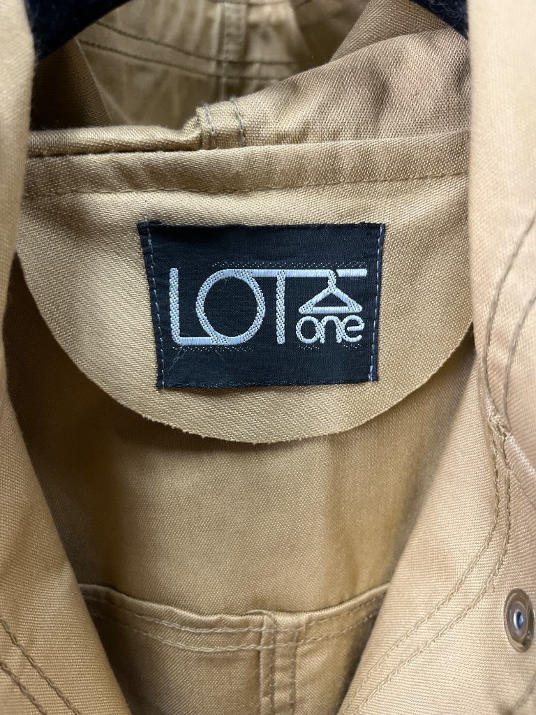 Lot One navy blue shiny jacket with hood, featuring four front pockets with button closures, white stitching along seams, and tan interior lining. The interior label reads ‘LOT one,’ confirming the maker as Lot One, a contemporary fashion brand. CONDITION: Condition not assessed. SHIPPING: In-House Shipping Available
