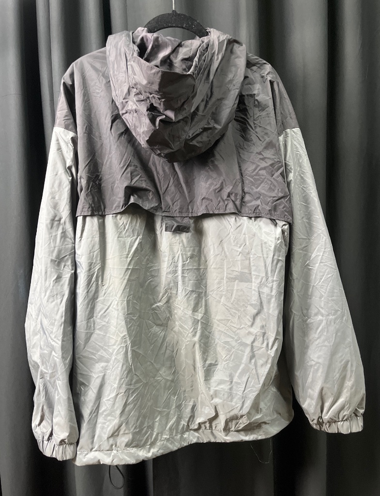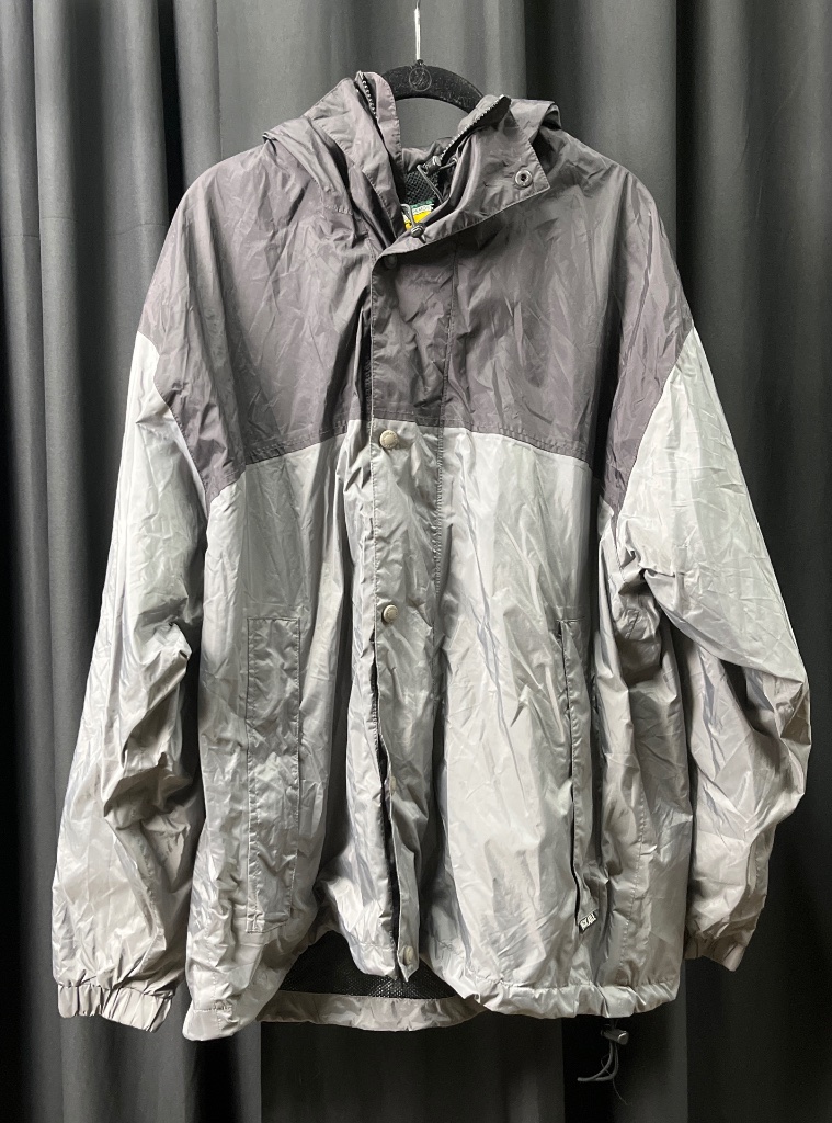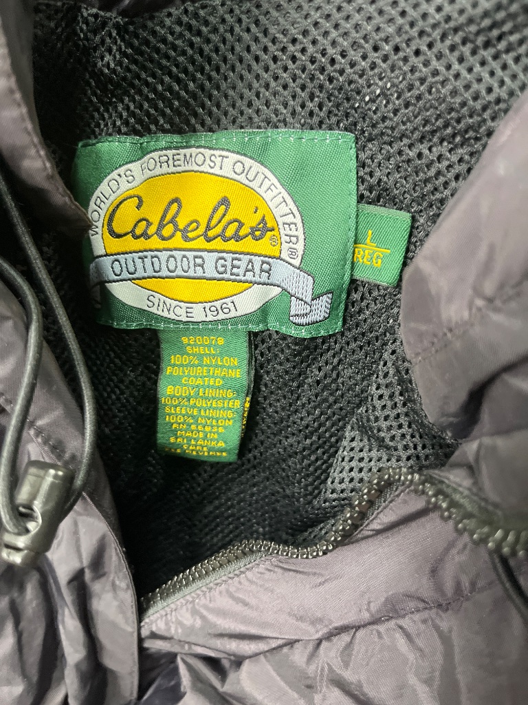 Cabela’s Outdoor Gear nylon jacket in gray and light gray, featuring a hood, front zipper closure, snap button overlay, elastic cuffs, and mesh lining. Label reads ‘Cabela’s Outdoor Gear’ with ‘Since 1961’. Size L, made in Sri Lanka, with fabric content of 100% nylon shell and 100% polyester lining. CONDITION: Condition not assessed. SHIPPING: In-House Shipping Available