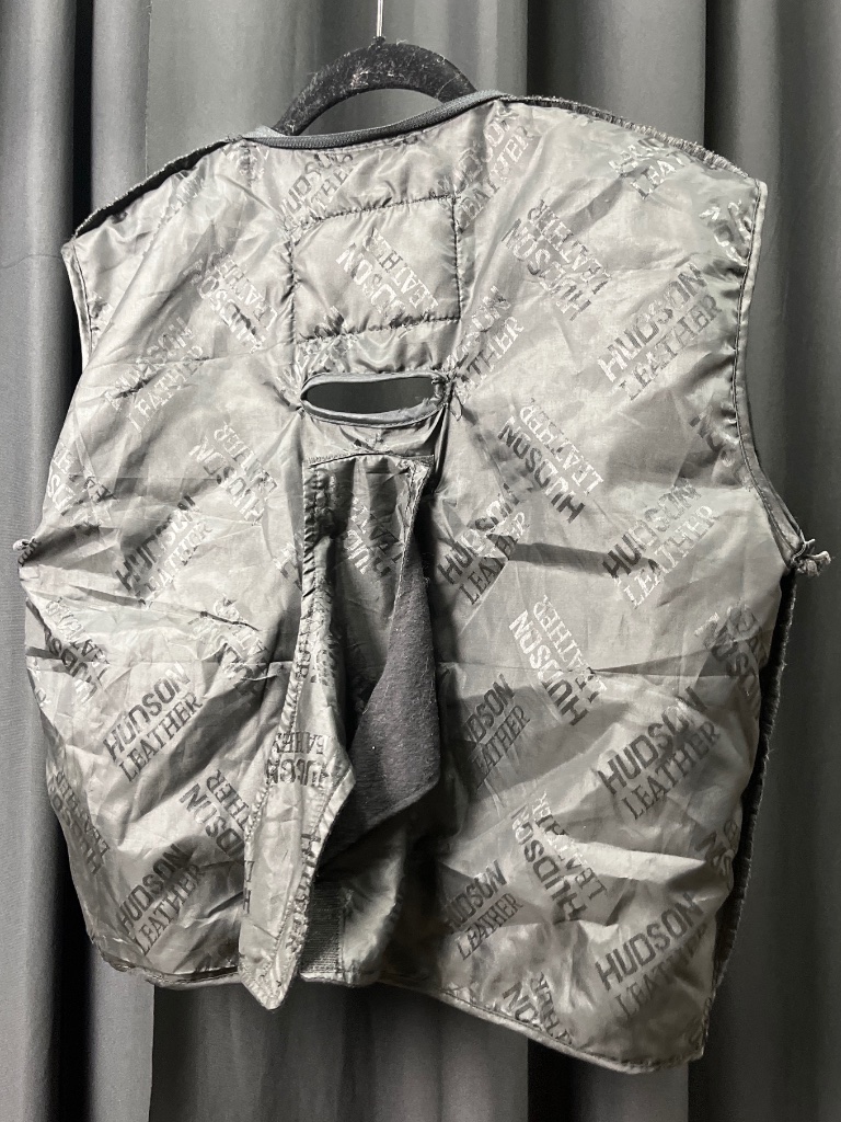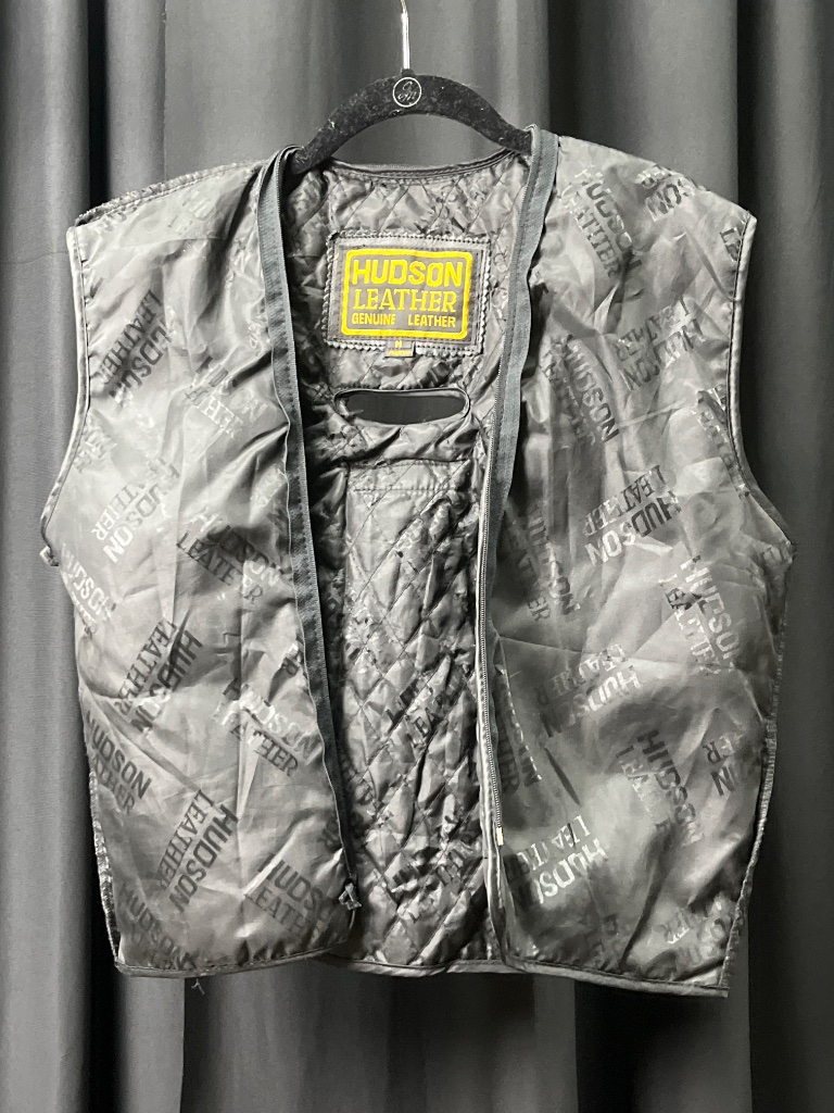 Hudson Leather quilted vest in black genuine leather with a textile lining. The label reads ‘HUDSON LEATHER GENUINE LEATHER’ and indicates ‘MADE IN PAKISTAN.’ Interior lining features repeated text ‘HUDSON LEATHER.’ CONDITION: Condition not assessed. SHIPPING: In-House Shipping Available