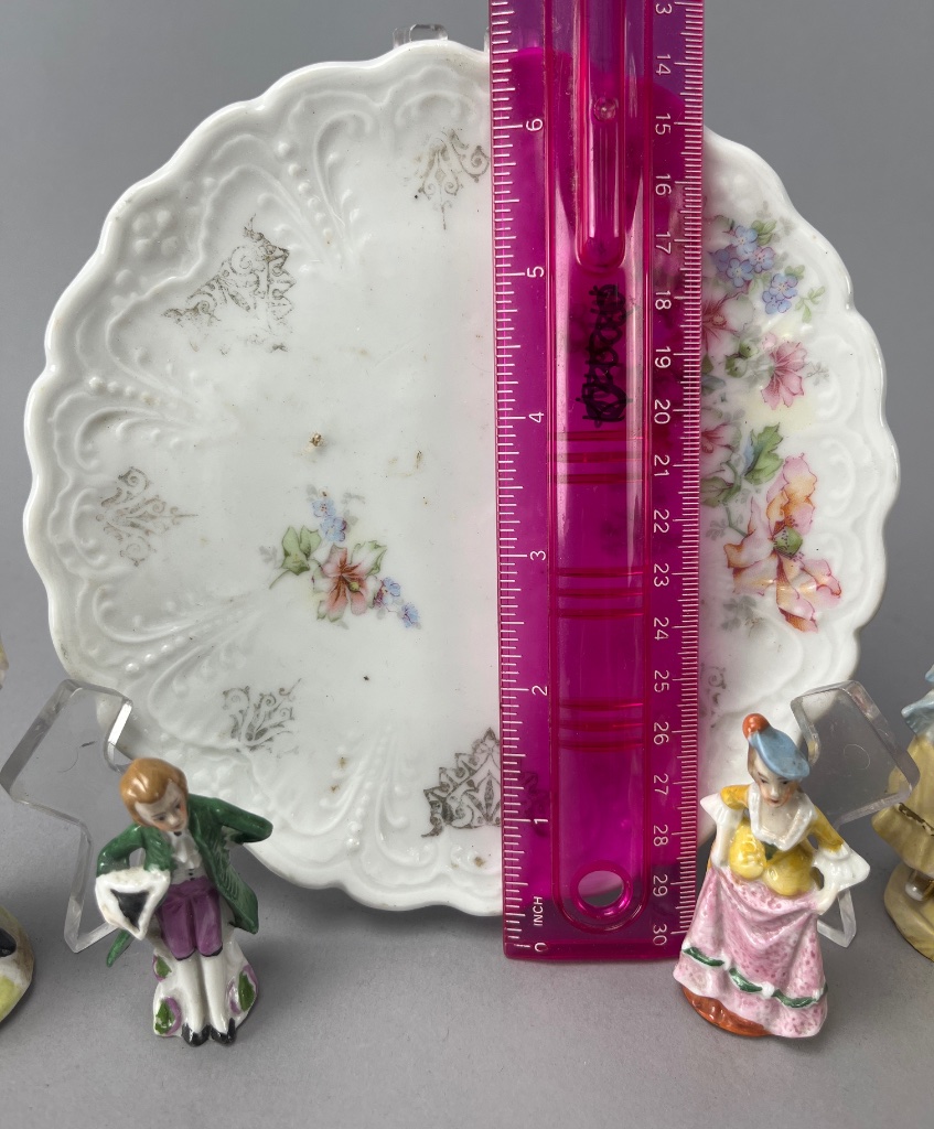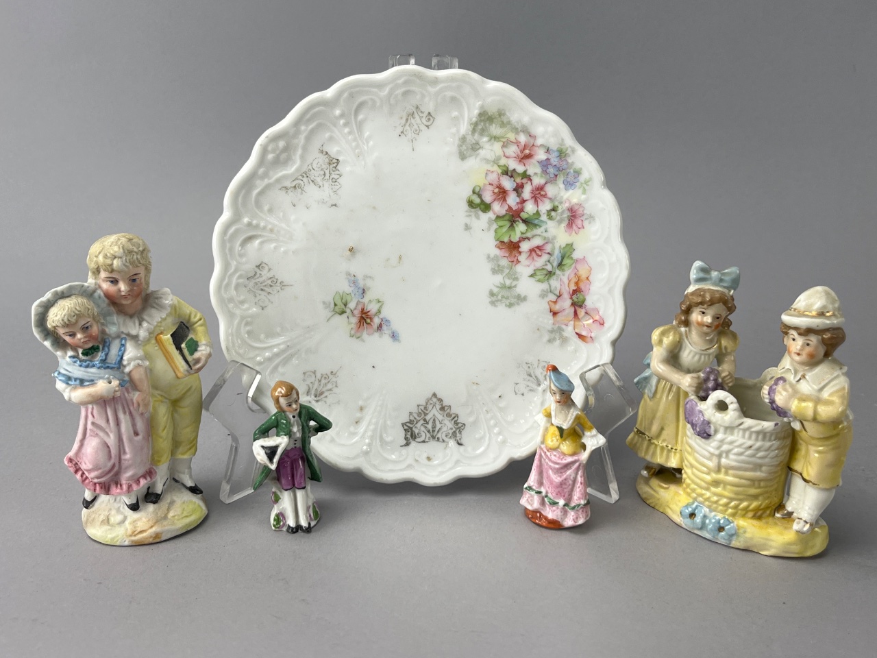 Grouping of porcelain items including a decorative plate with floral design and five figurines depicting children in various poses. The figurines include a boy and girl holding a book, a girl with a basket of flowers, a girl in a pink dress with a blue bow, and a boy in a green coat holding a book. The plate features surface wear, and the figurines show minor paint loss. Plate is 6.5″D. CONDITION: Surface wear observed on the plate. Minor paint loss noted on the figurines. SHIPPING: In-House Shipping Available