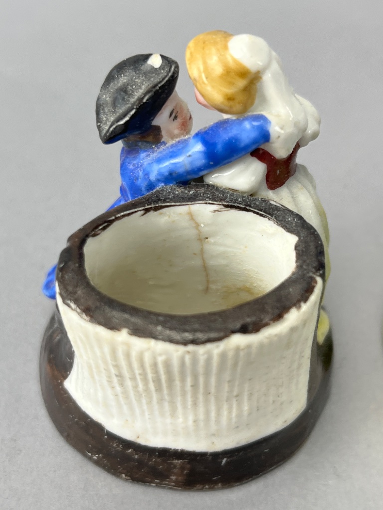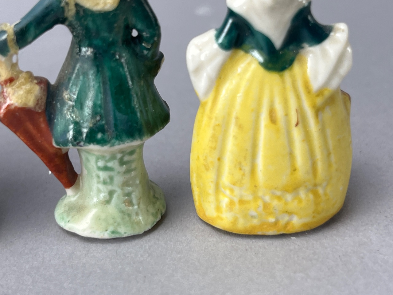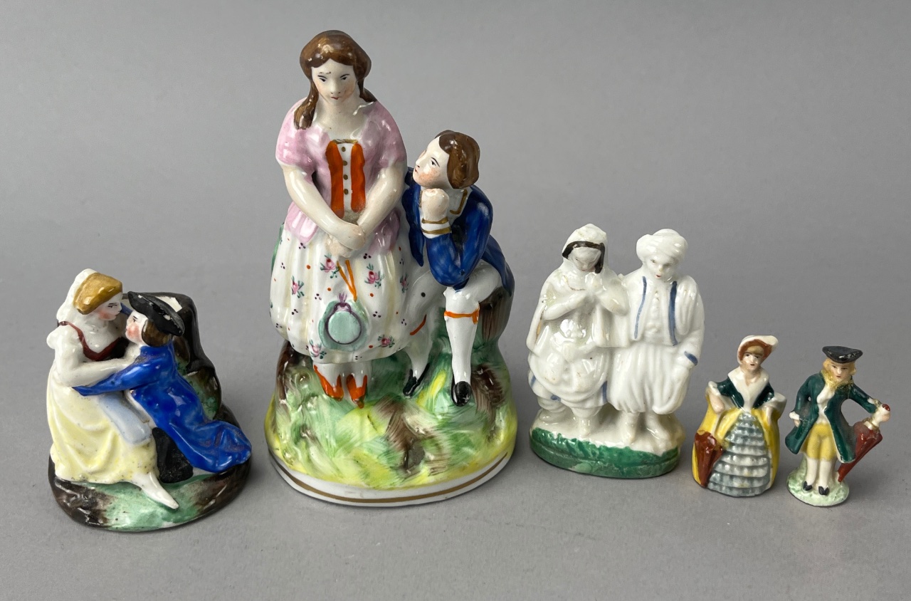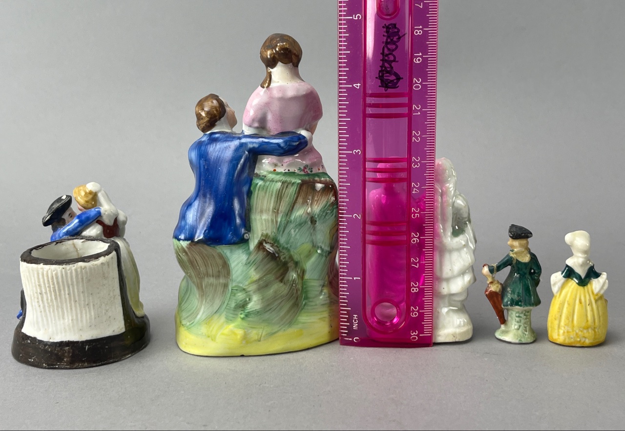 Group of porcelain figurines featuring five figures in various poses and colors. The tallest figurine depicts a girl in a pink dress with floral decoration. Other figures include two children embracing, one wearing a blue coat and a black hat, and two figures in traditional attire, one holding an umbrella. The base of one figurine shows a hollow interior. Marked ‘SERIAL’ on the base of one figurine; the mark likely indicates a production or pattern number rather than a maker’s mark. Tallest measures 5″H. CONDITION: Minor paint loss observed on some figures. No visible cracks or chips. SHIPPING: In-House Shipping Available