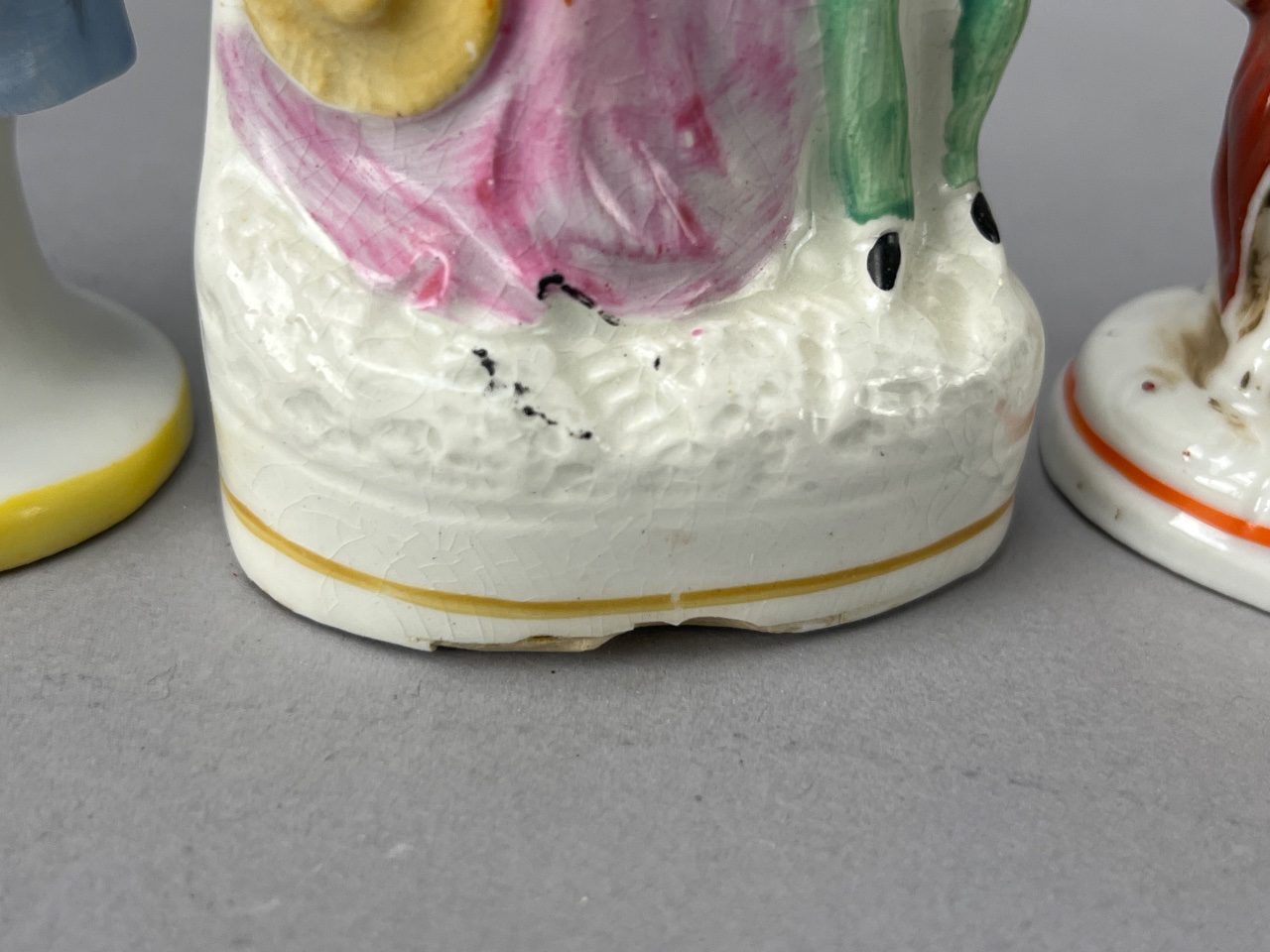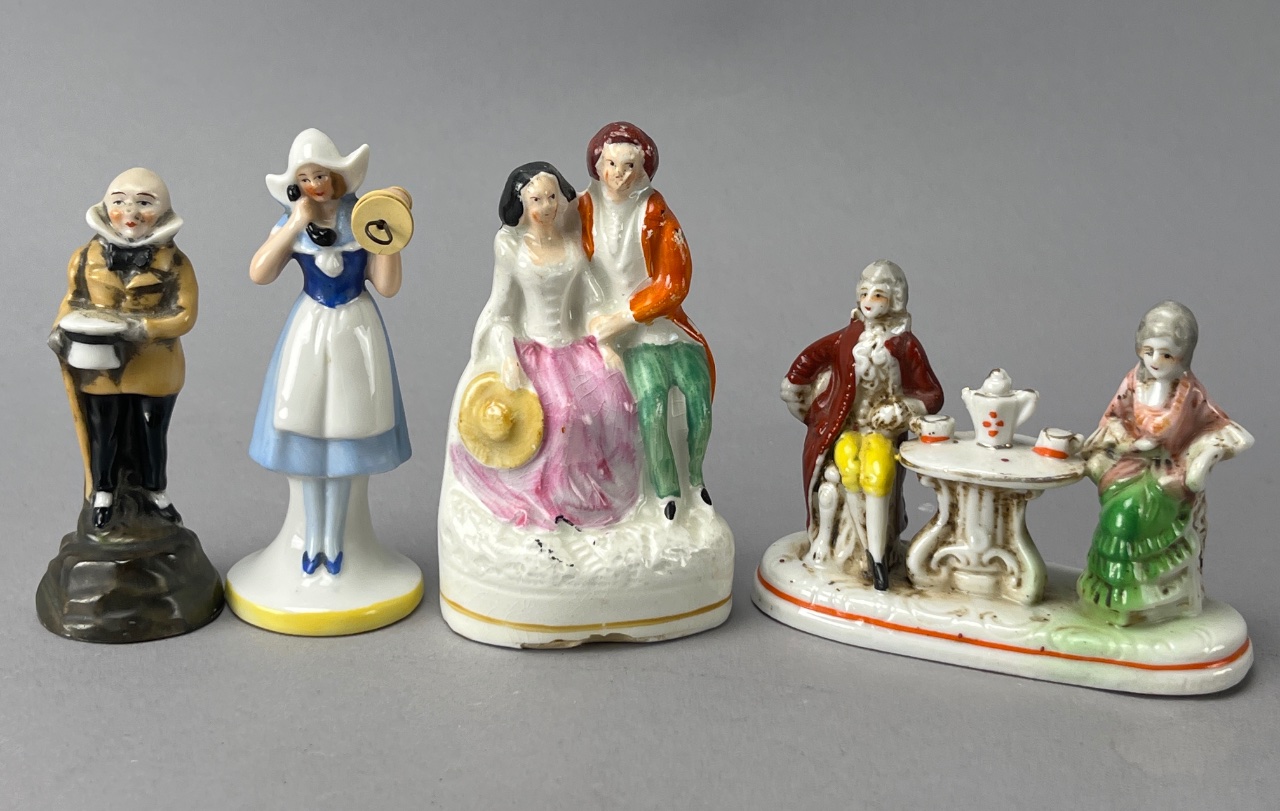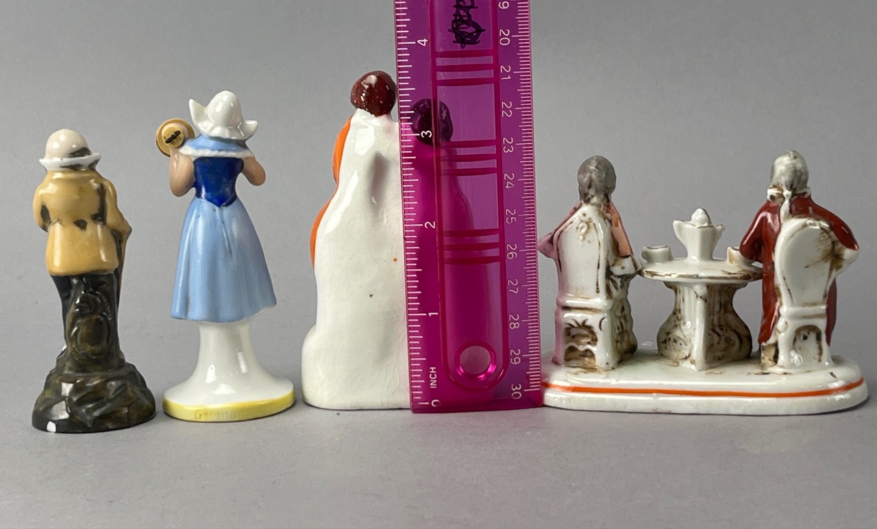 Group of five porcelain figurines marked ‘G. H. W.’ on the base. The figurines depict various characters, including a man holding a tray, a woman in a blue dress with a white apron holding a bell, a couple in period clothing, and a seated couple at a table with a teapot and cups. The mark ‘G. H. W.’ is directly readable on the base of the figurines. Tallest 4″H. CONDITION: Crack visible on the base of the third figurine depicting a couple in period clothing. Some wear and discoloration observed across the figurines. SHIPPING: In-House Shipping Available