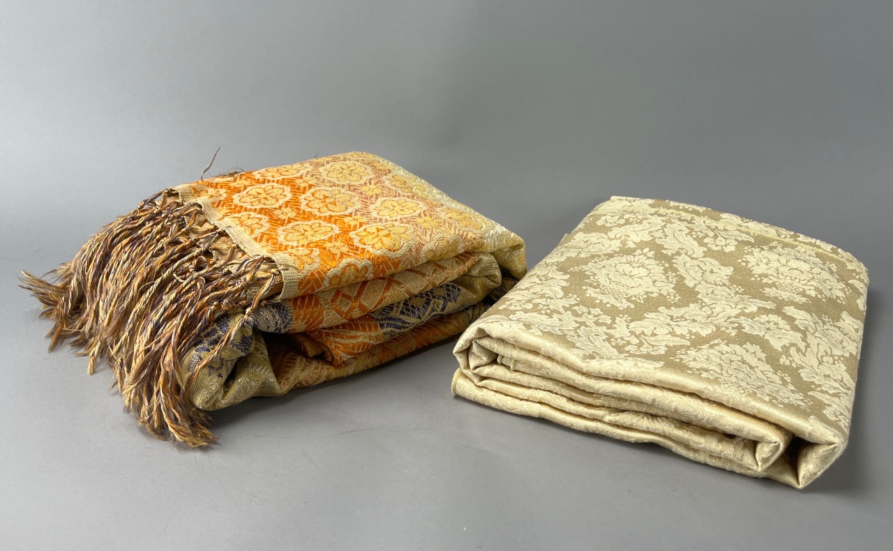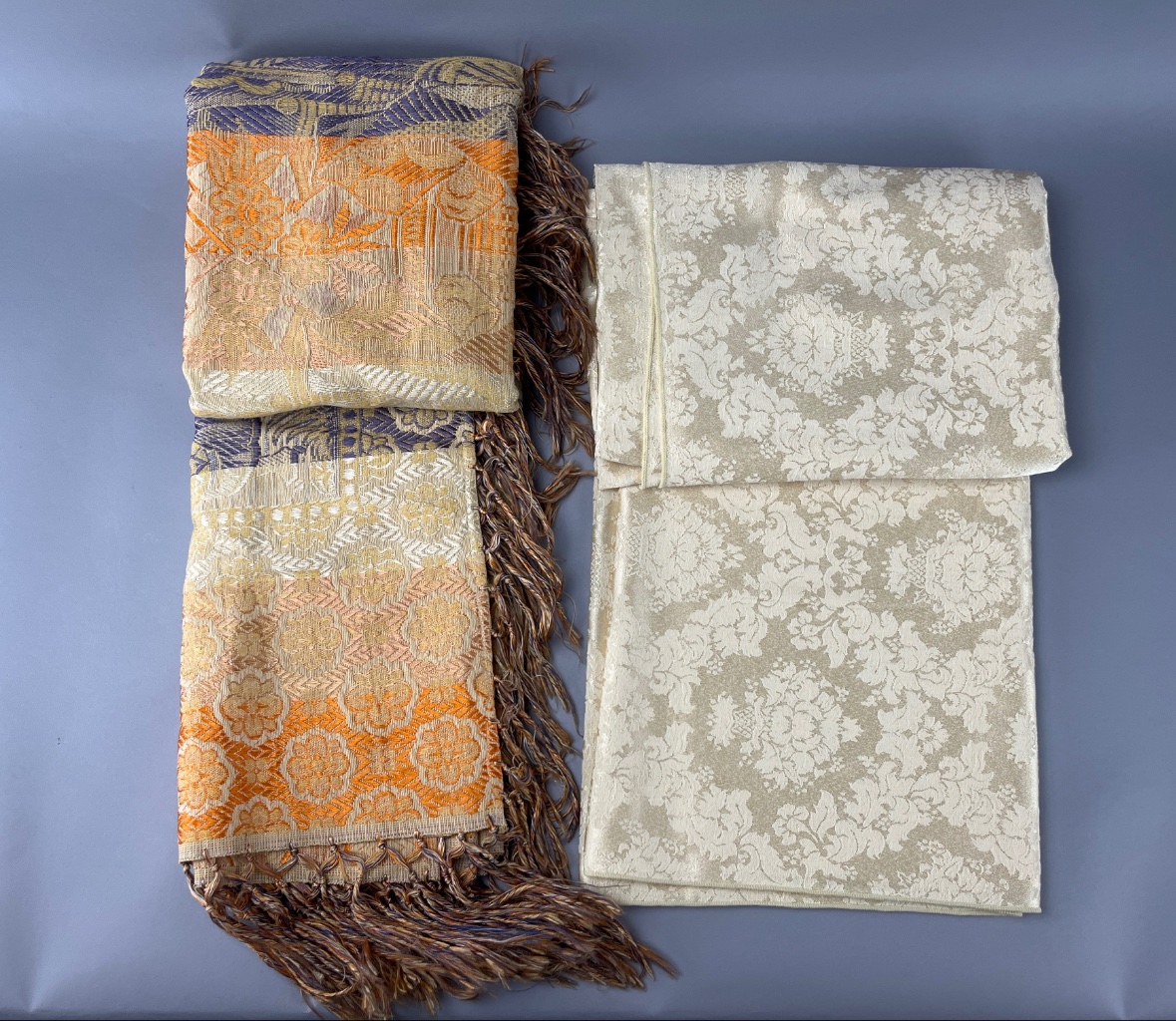 Group of two textiles, including one with colorful floral pattern and multi-colored fringe, and one cream-colored textile with damask pattern featuring a subtle floral design. CONDITION: Condition not assessed. SHIPPING: In-House Shipping Available