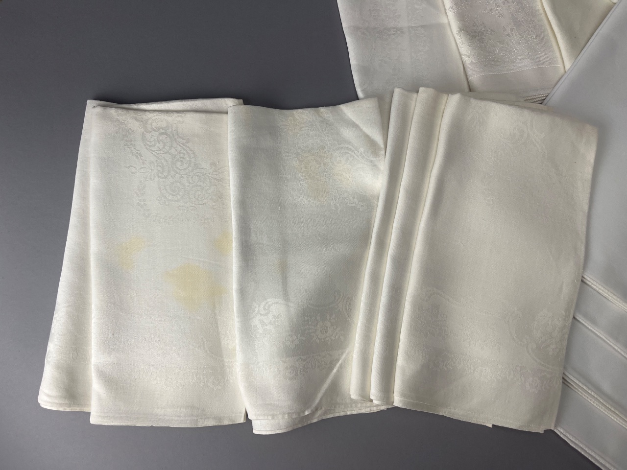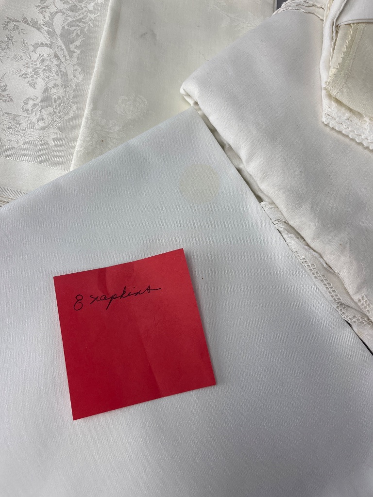 Assorted collection of embroidered and lace-trimmed napkins and handkerchiefs. Includes white and cream-colored fabric items with lace edges and embroidered details. A red sticky note indicates ‘8 napkins,’ and a yellow tag with handwritten text reads ‘At your service,’ which appears to be a seller’s identifier rather than a maker’s mark. CONDITION: Some items show visible stains. Lace edges appear intact on most pieces. SHIPPING: In-House Shipping Available