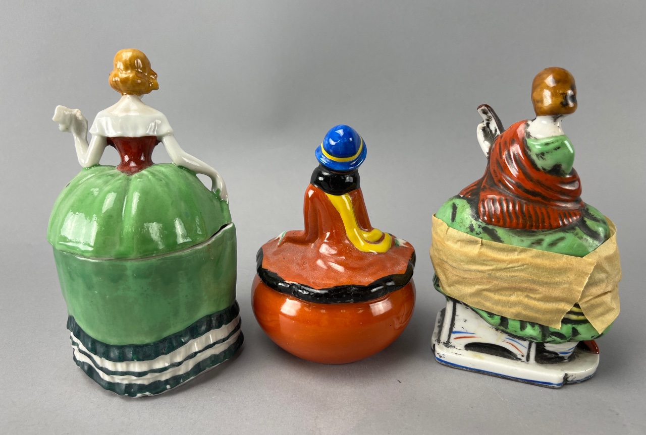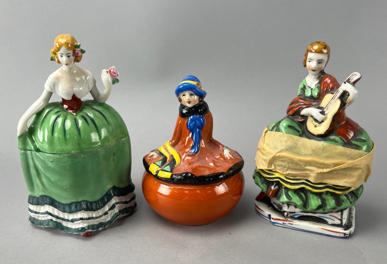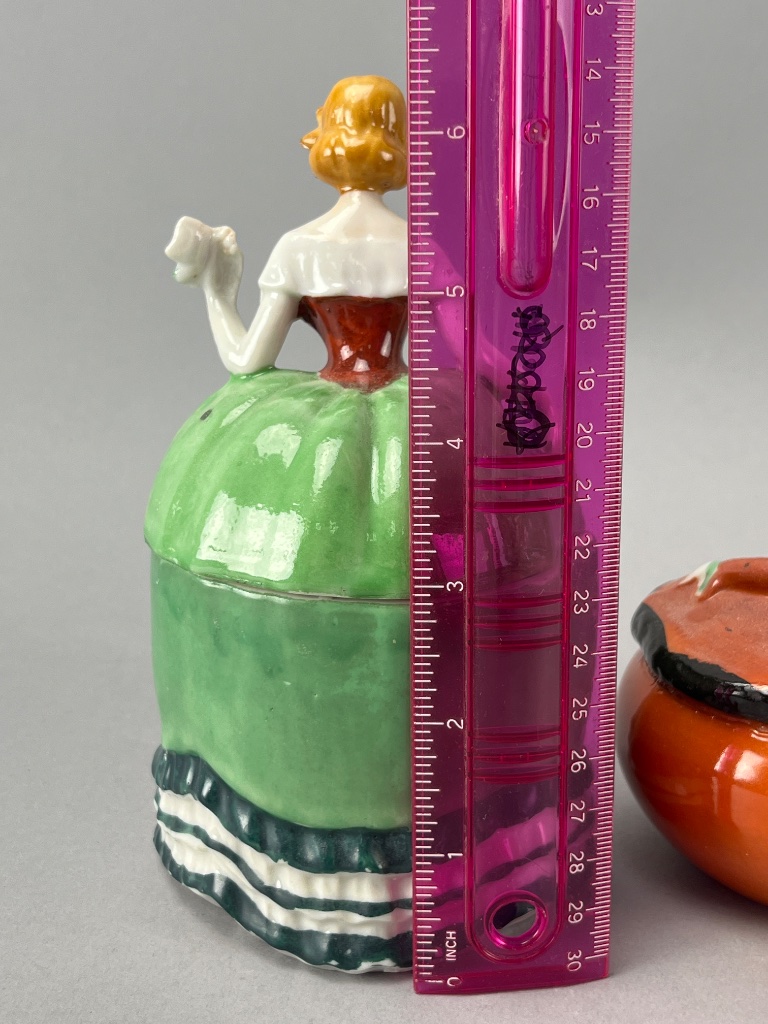 Grouping of three ceramic figurines with colorful glazes and detailed painted features. Includes a figurine of a woman in a green dress holding a flower, a figurine of a woman in an orange dress with a blue hat, and a figurine of a woman playing guitar wrapped in tape. No visible maker marks observed. Tallest is 6.5″H. CONDITION: Tape wrapped around the waist of the figurine playing guitar. No visible chips or cracks observed. SHIPPING: In-House Shipping Available