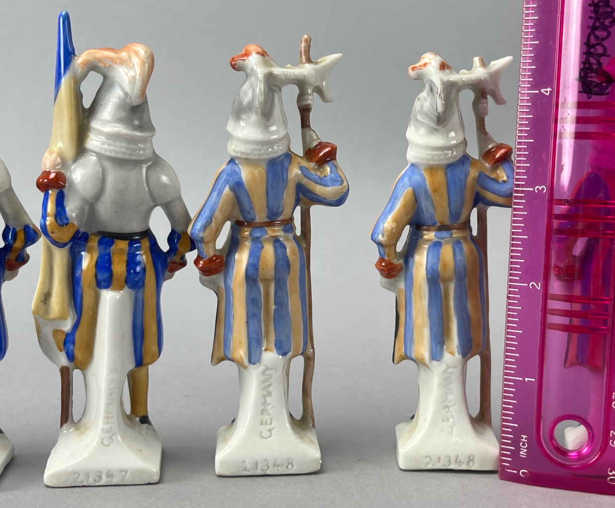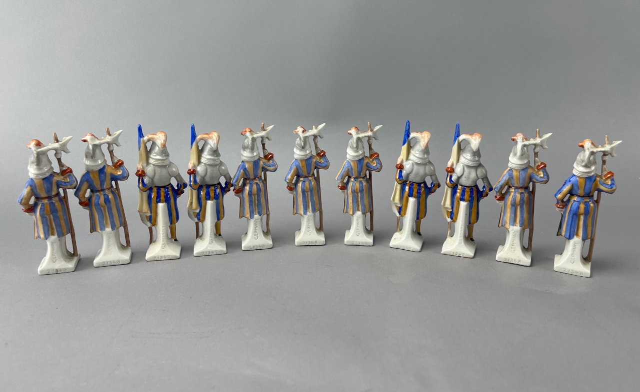 Set of ten ceramic soldier figurines by Gerold Porzellan, mid-20th century German production. Each figurine is marked ‘GERMANY’ with model numbers ‘21347’ and ‘21348’ on the base. The soldiers are depicted in colorful striped uniforms holding spears and flags, with distinct poses and facial expressions. Each is about 4.5″H. CONDITION: Condition not assessed. SHIPPING: In-House Shipping Available