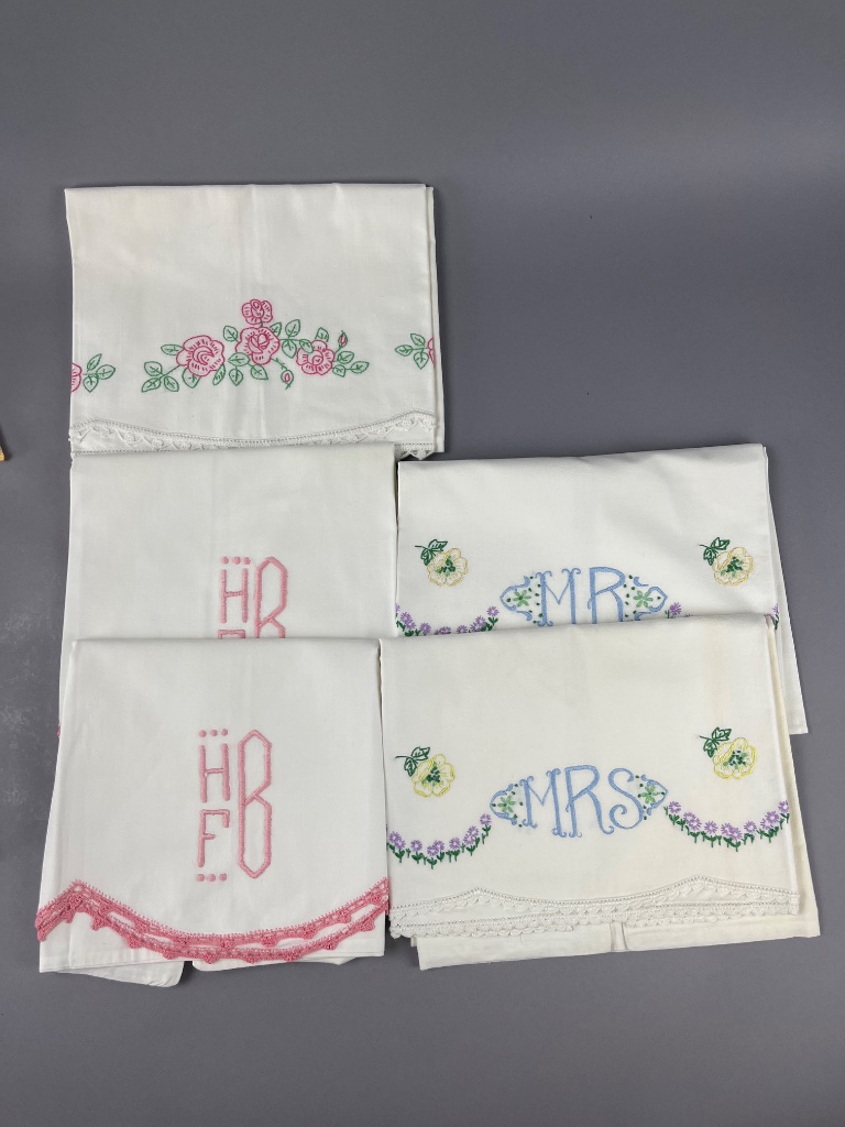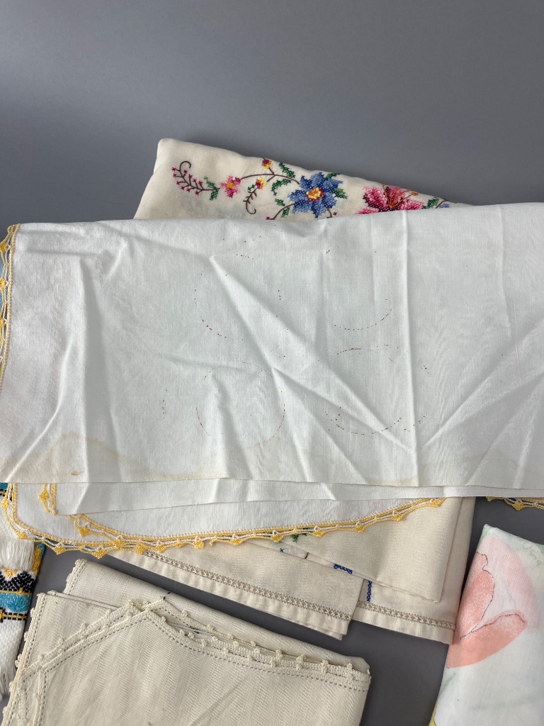 Assorted collection of embroidered handkerchiefs and decorative cloths featuring floral embroidery and monogrammed initials HFB and MRS. Some pieces include fringed edges and decorative designs, consistent with mid-20th century vintage linens, possibly part of a trousseau or bridal collection. CONDITION: Visible stains on some textiles. Wrinkles present on several pieces. SHIPPING: In-House Shipping Available