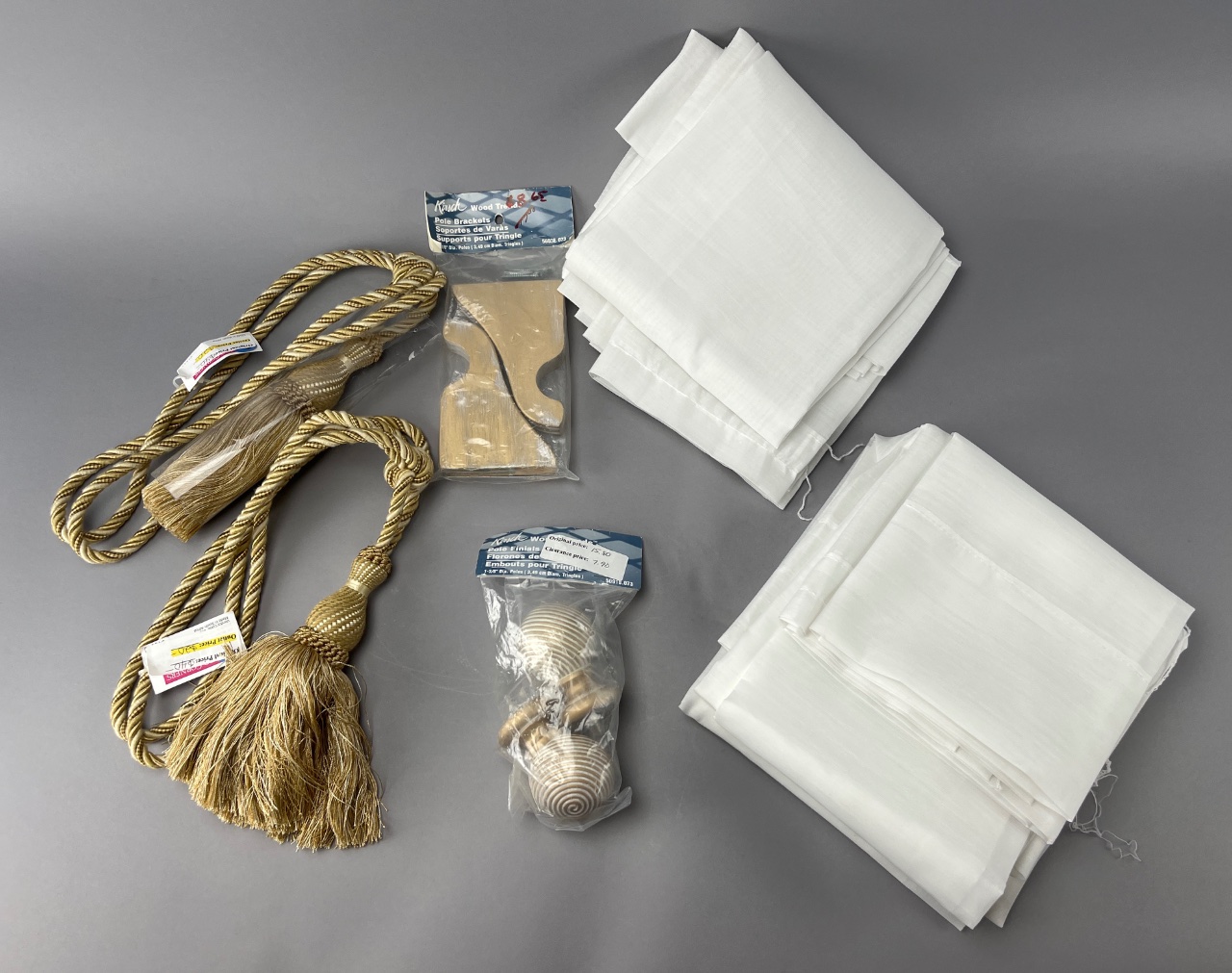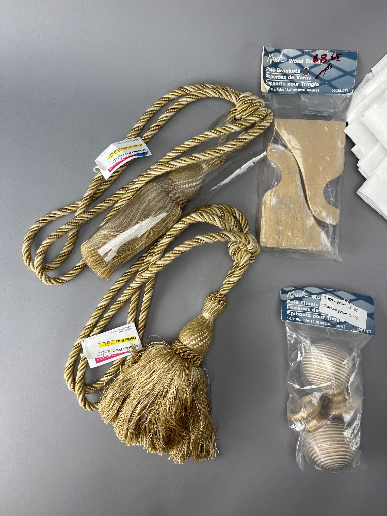 Group lot of decorative tassels and pole accessories by Kraft, marked ‘Kraft Wood Treasures’ on packaging. Includes two decorative tassels with gold-colored rope, wooden pole brackets, and three decorative finials, all in unopened plastic packaging. Materials include fabric, wood, and rope. CONDITION: Condition not assessed. SHIPPING: In-House Shipping Available