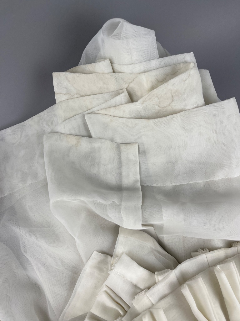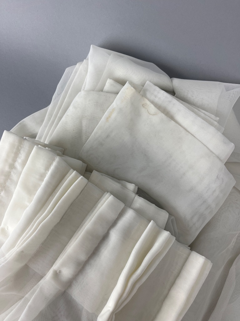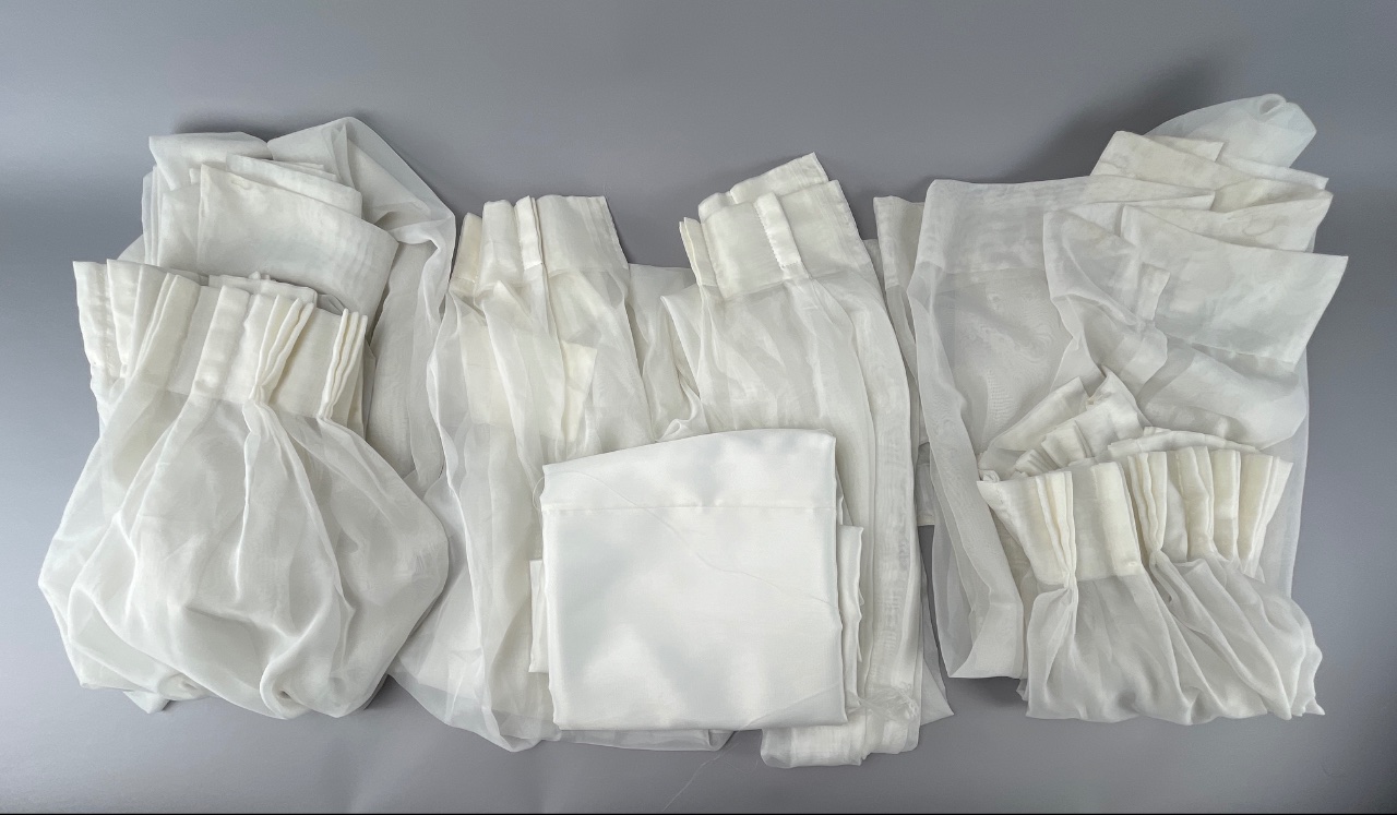 Curtain set with extra fabric pieces, featuring multiple layers of sheer fabric with gathered edges and one larger square piece in the center. Some fabric pieces display a textured pattern. CONDITION: Some fabric pieces show slight discoloration. SHIPPING: In-House Shipping Available