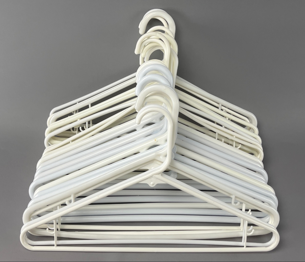 Stack of plastic hangers primarily white. Smooth surface finish. CONDITION: Condition not assessed. SHIPPING: In-House Shipping Available