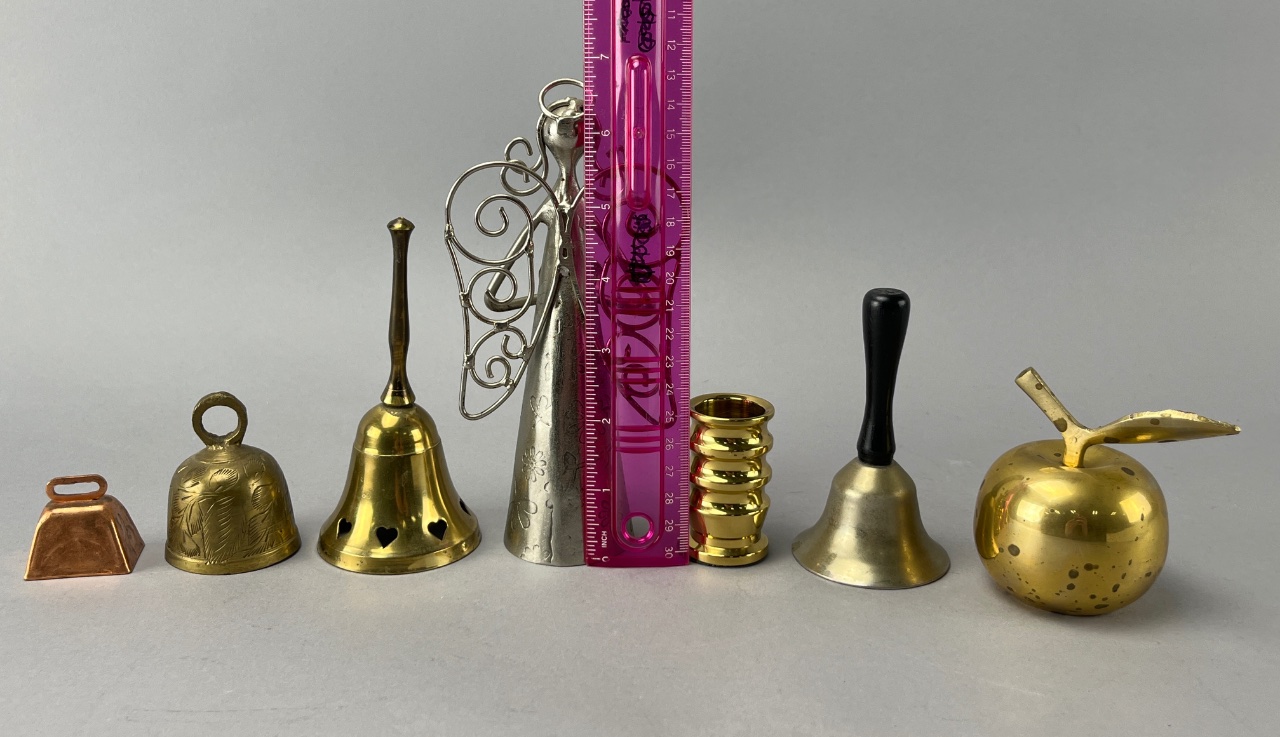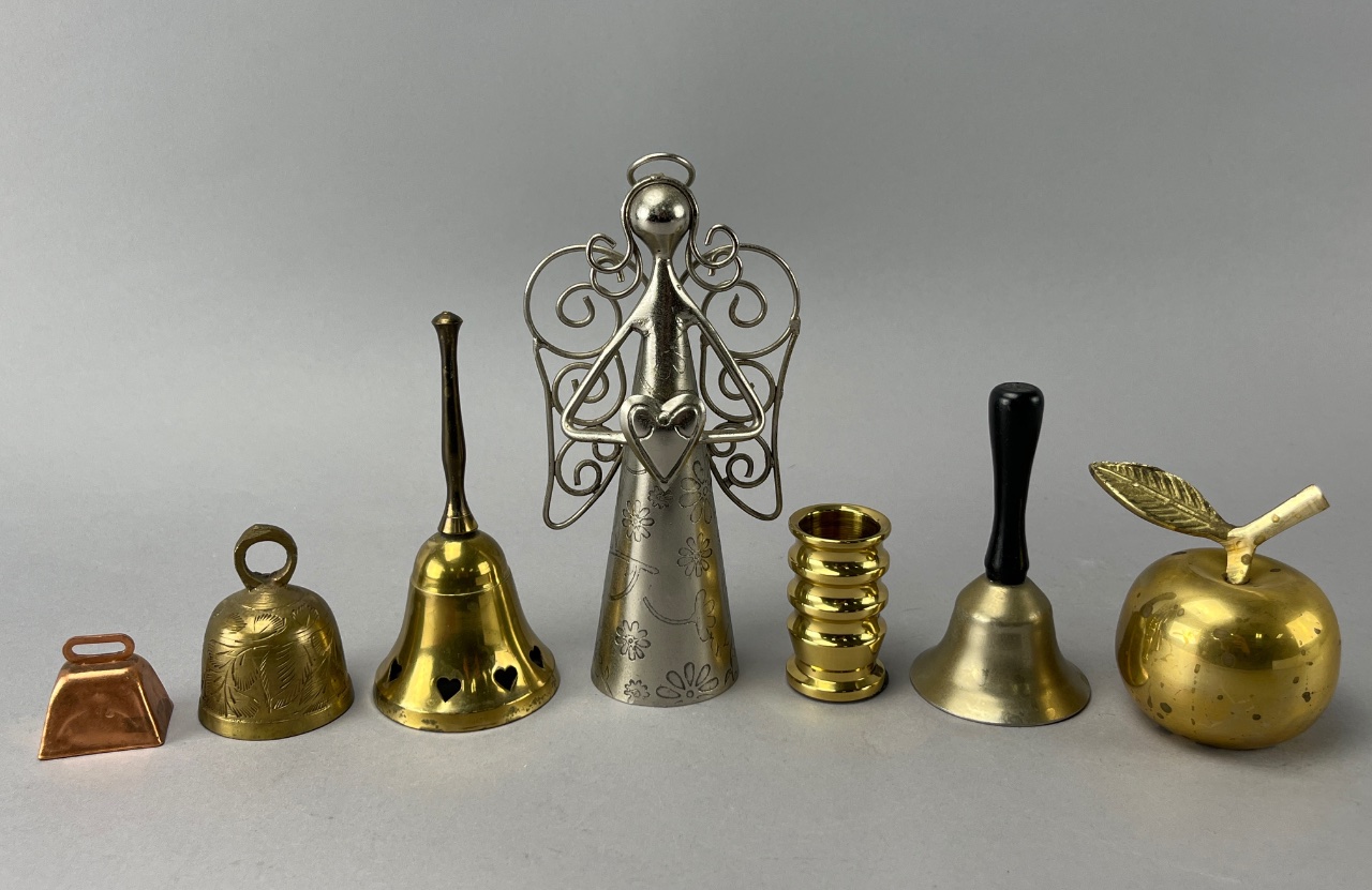 Grouping of 6 metal bells and 1 candlestick holder. Includes a small copper bell with a loop handle, a brass bell with a floral design and a loop handle, a larger brass bell with heart-shaped cutouts, a silver-colored angel figurine with decorative wings, a gold-colored candlestick holder with multiple rings, a brass bell with a black handle, and a gold-colored apple with a leaf. Materials include copper, brass, silver-colored metal, and gold-colored metal. Tallest bell is about 7″H. CONDITION: Condition not assessed. SHIPPING: In-House Shipping Available