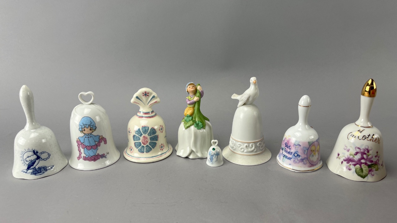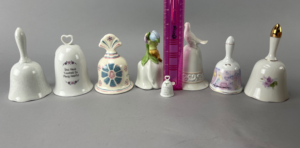 Set of 8 decorative porcelain bells featuring floral and figurative designs. Includes variations such as heart-shaped handles, gold-tipped handles, and motifs including flowers, doves, and text inscriptions. Tallest bell is 5″H. CONDITION: Condition not assessed. SHIPPING: In-House Shipping Available