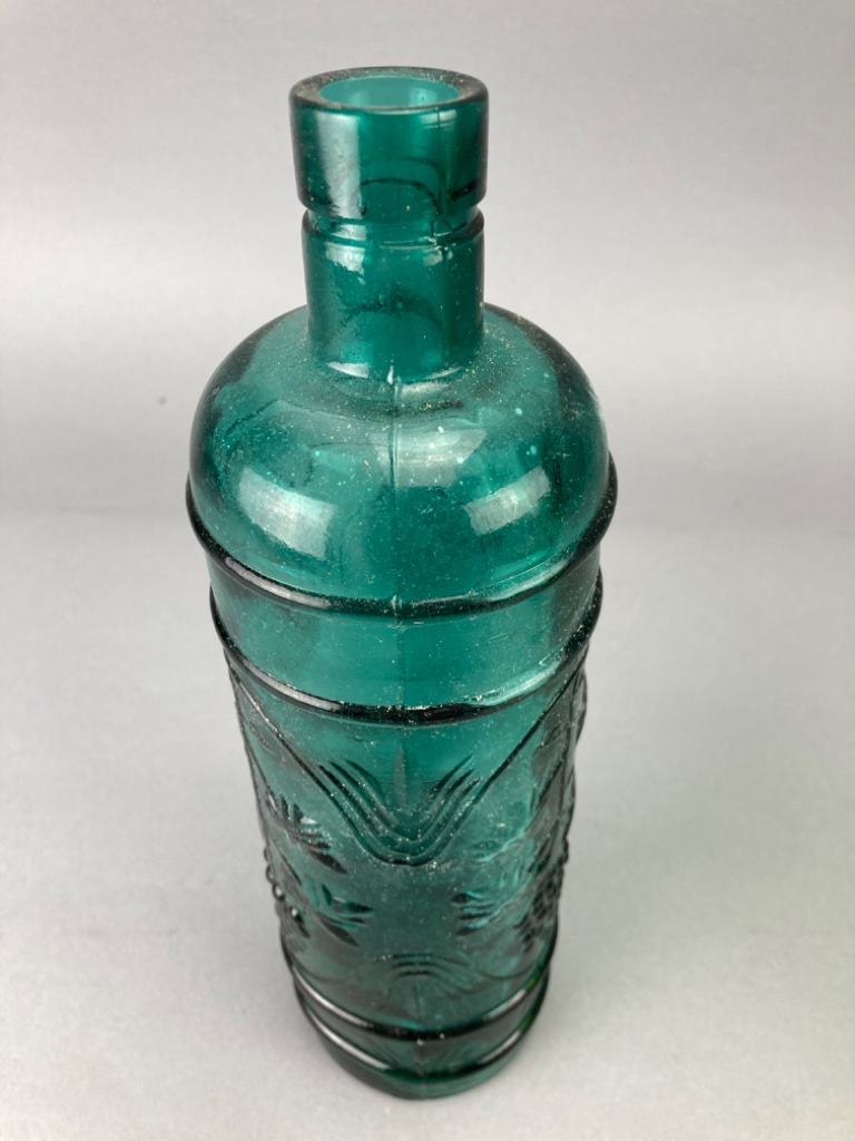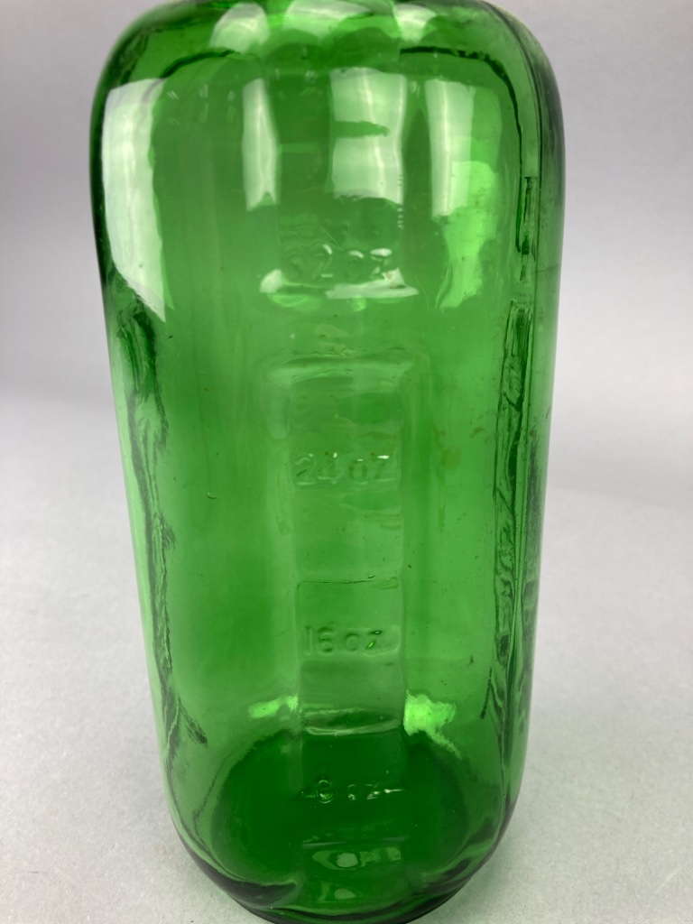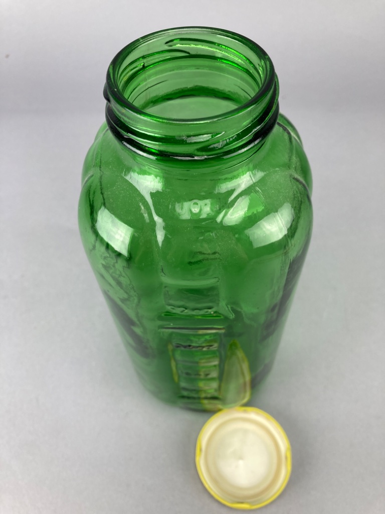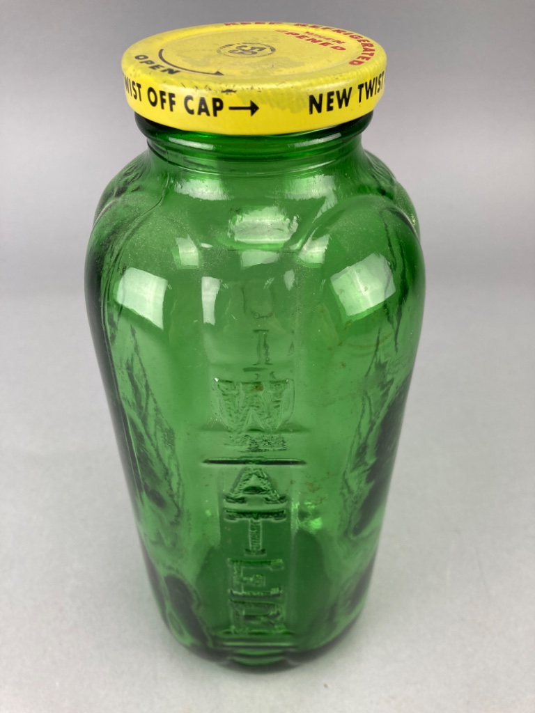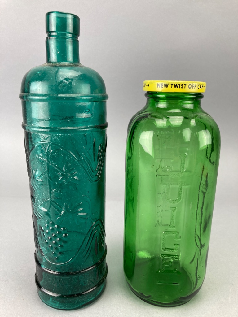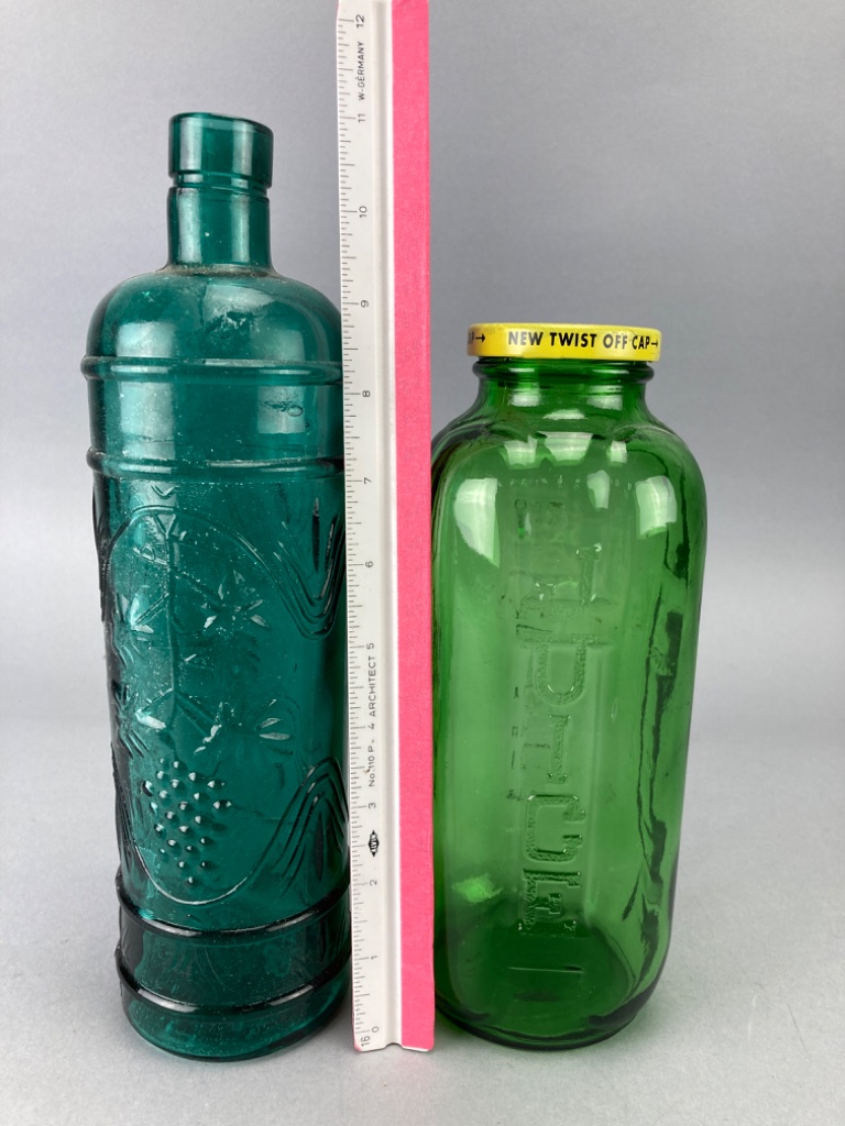 Pair of green glass bottles, including one dark green bottle with embossed floral design and narrow neck, and one light green bottle embossed ‘JUICE’ on one side and ‘Water’ on the other with a yellow twist-off cap labeled ‘NEW TWIST OFF CAP’. The light green bottle also features measurement markings on the back. Tall bottle is 11″H. CONDITION: Condition not assessed. SHIPPING: In-House Shipping Available