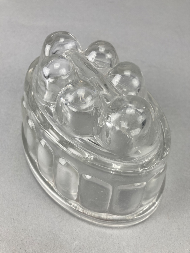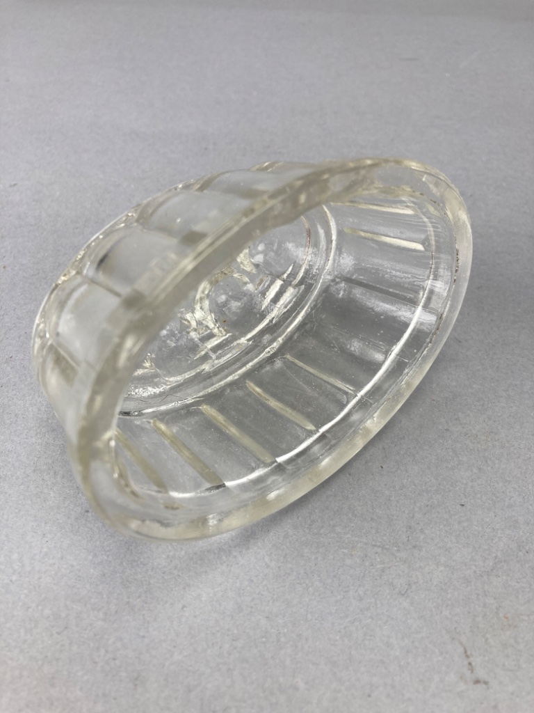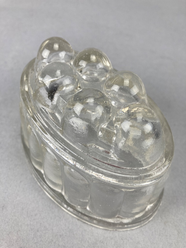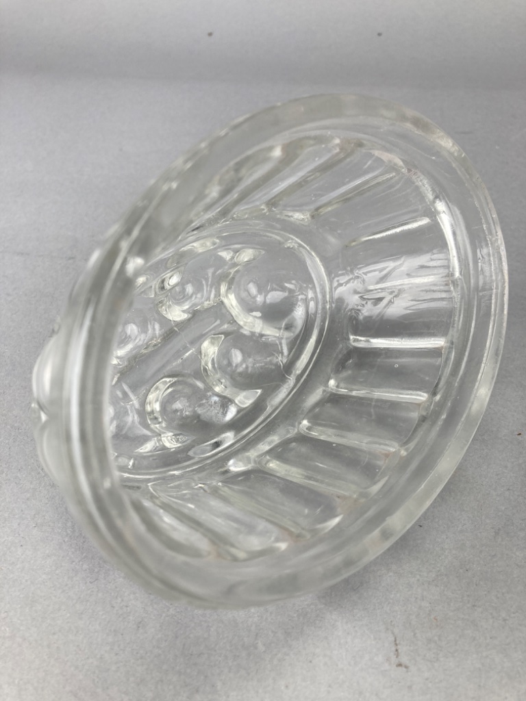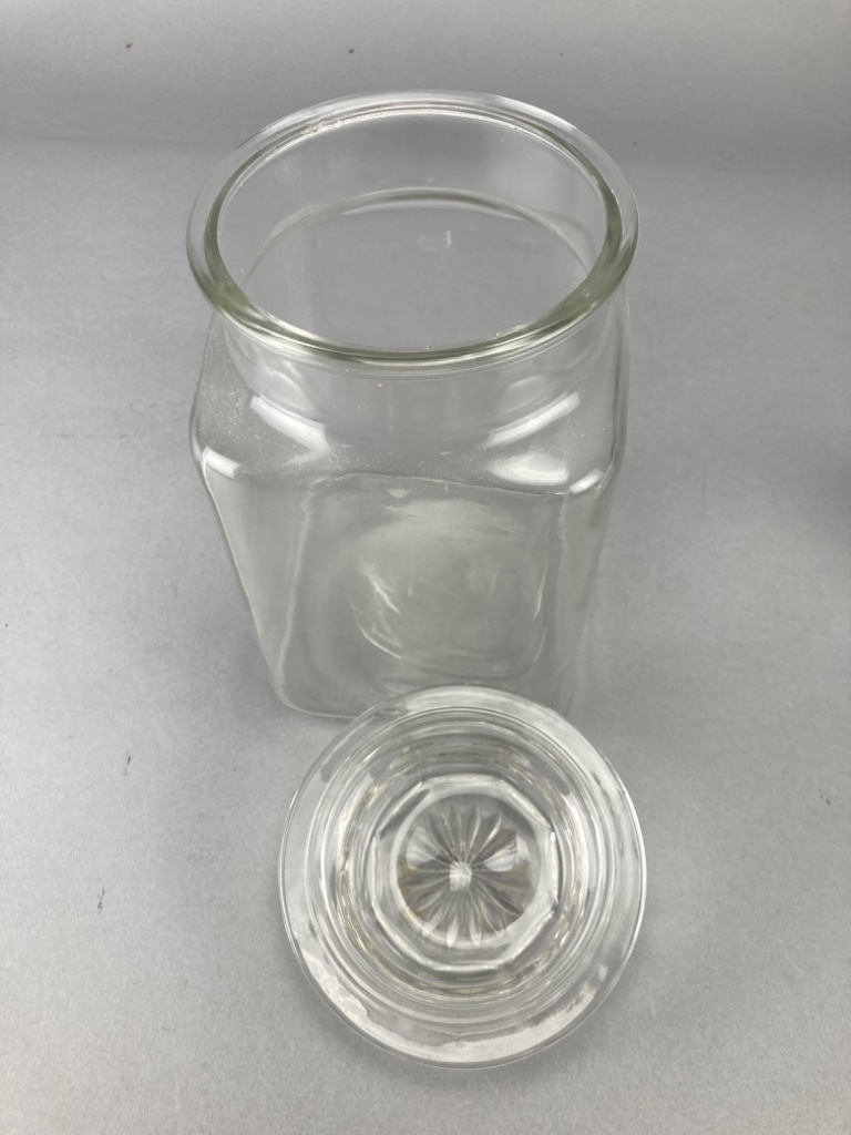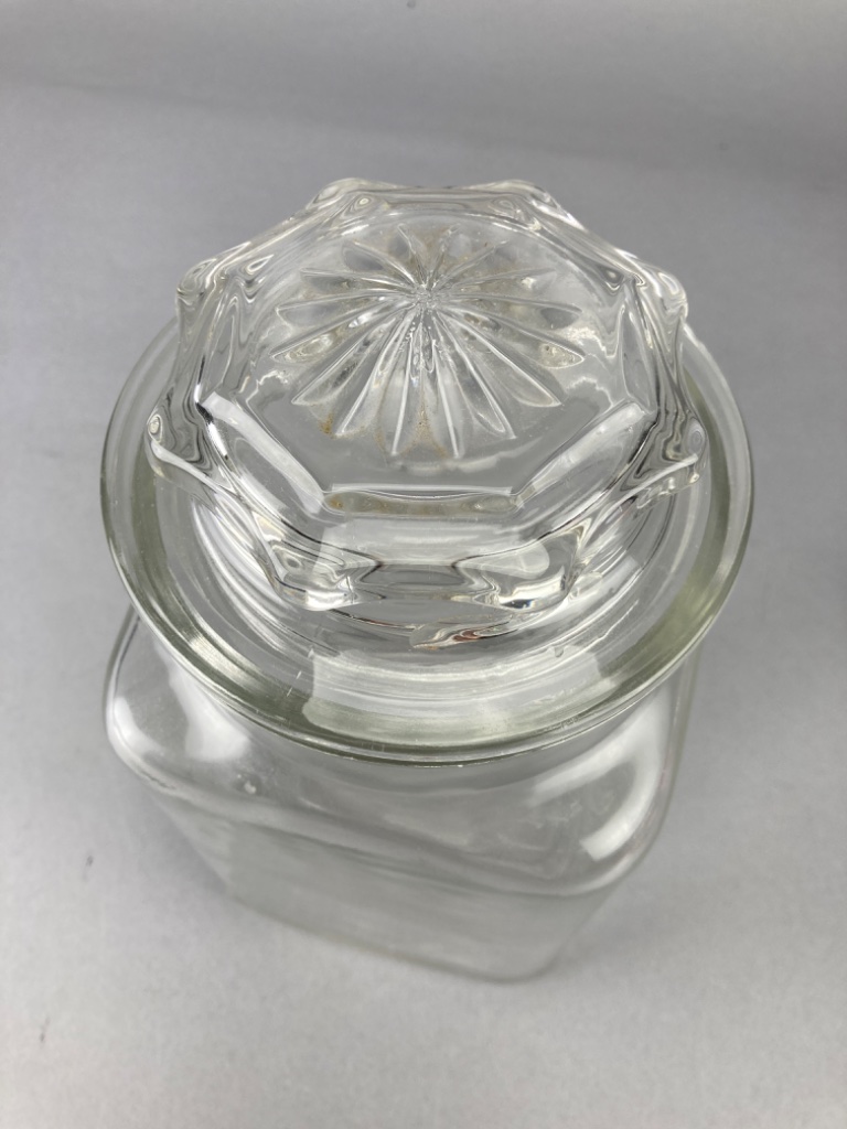 Glass jar with a flat base and straight sides, with matching lid. The molds feature rounded tops with raised bubble-like decorations and a decorative pattern. Jar is 8.5″H. CONDITION: Condition not assessed. SHIPPING: In-House Shipping Available
