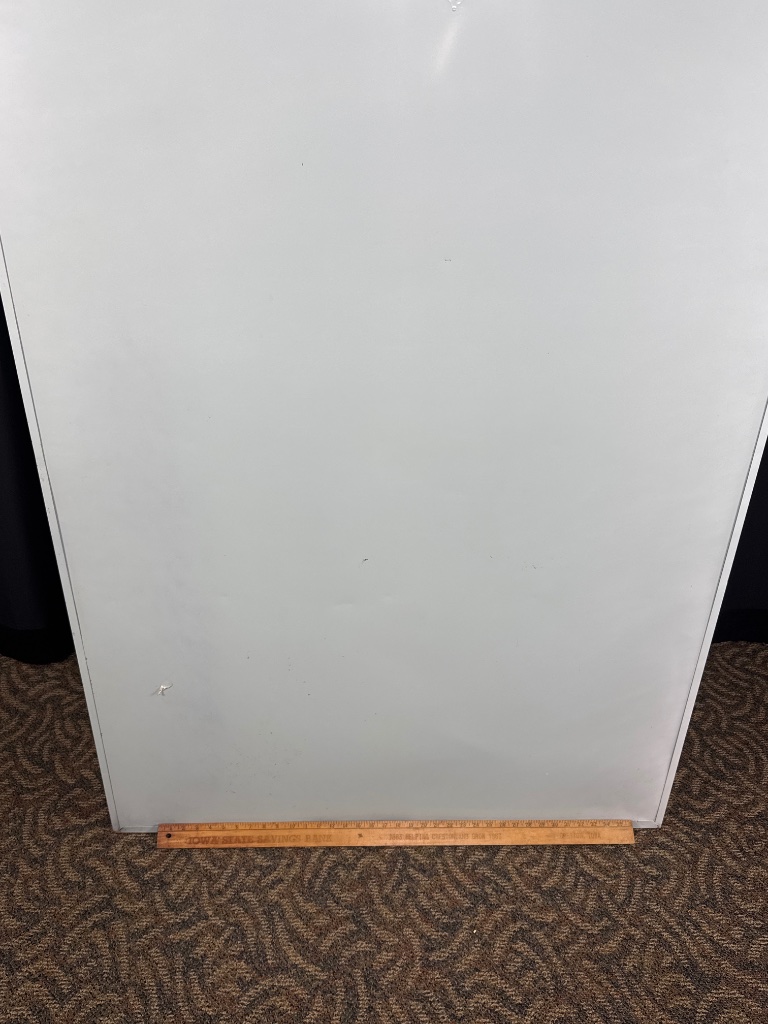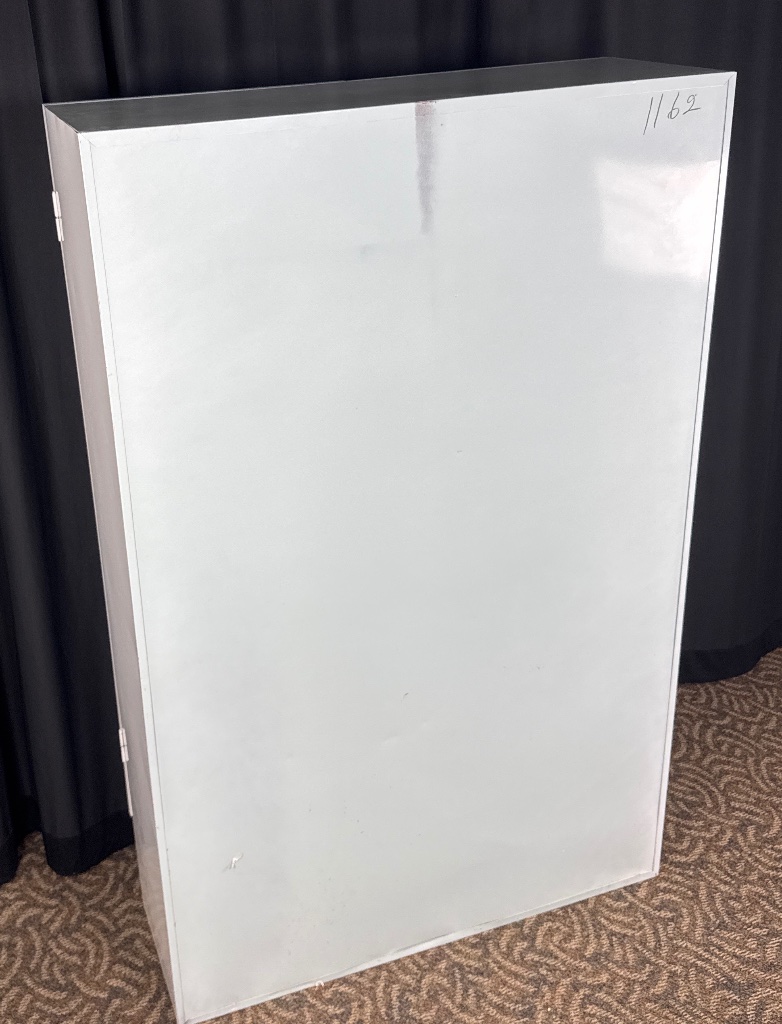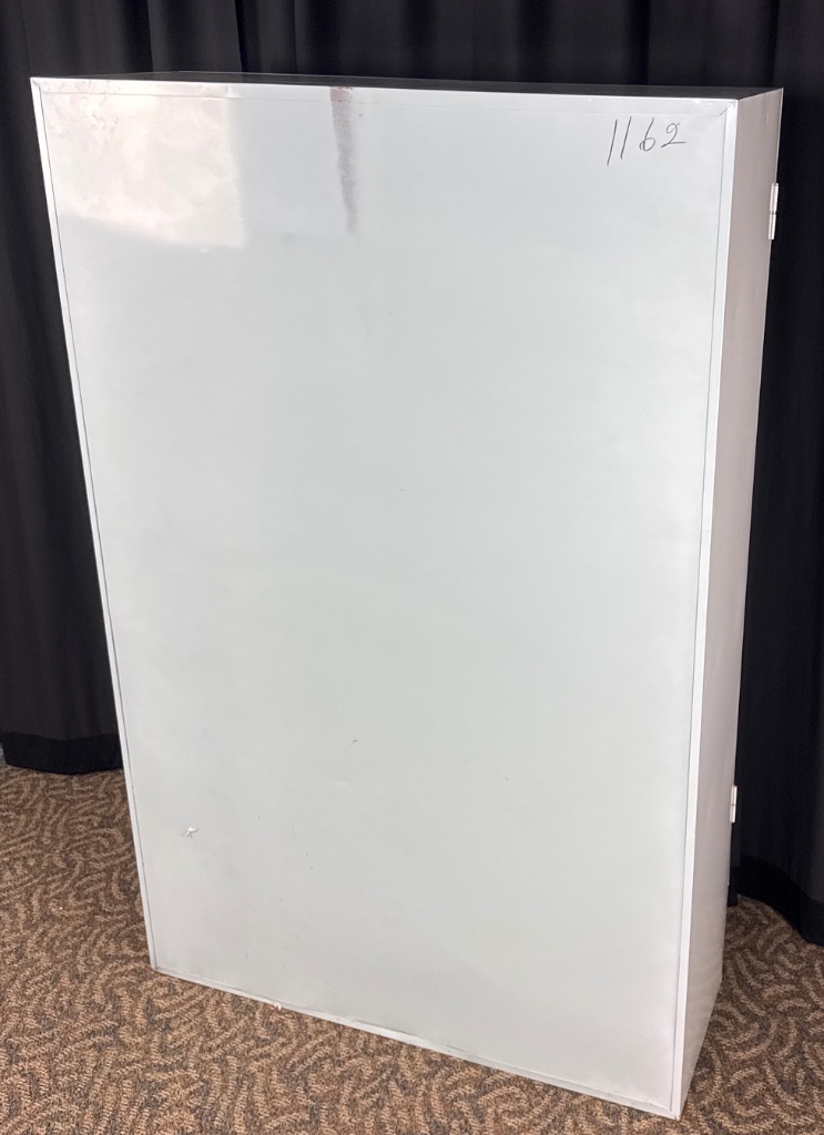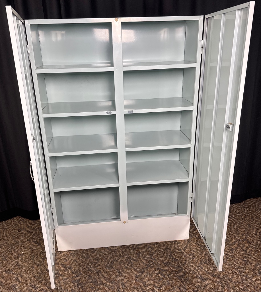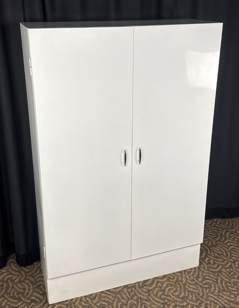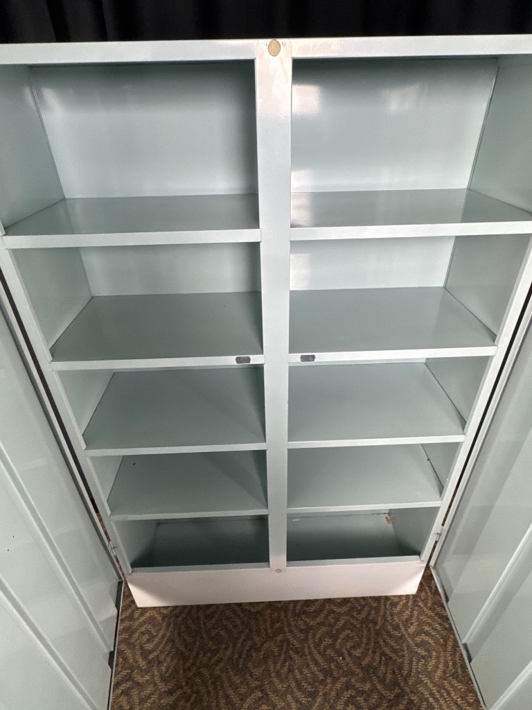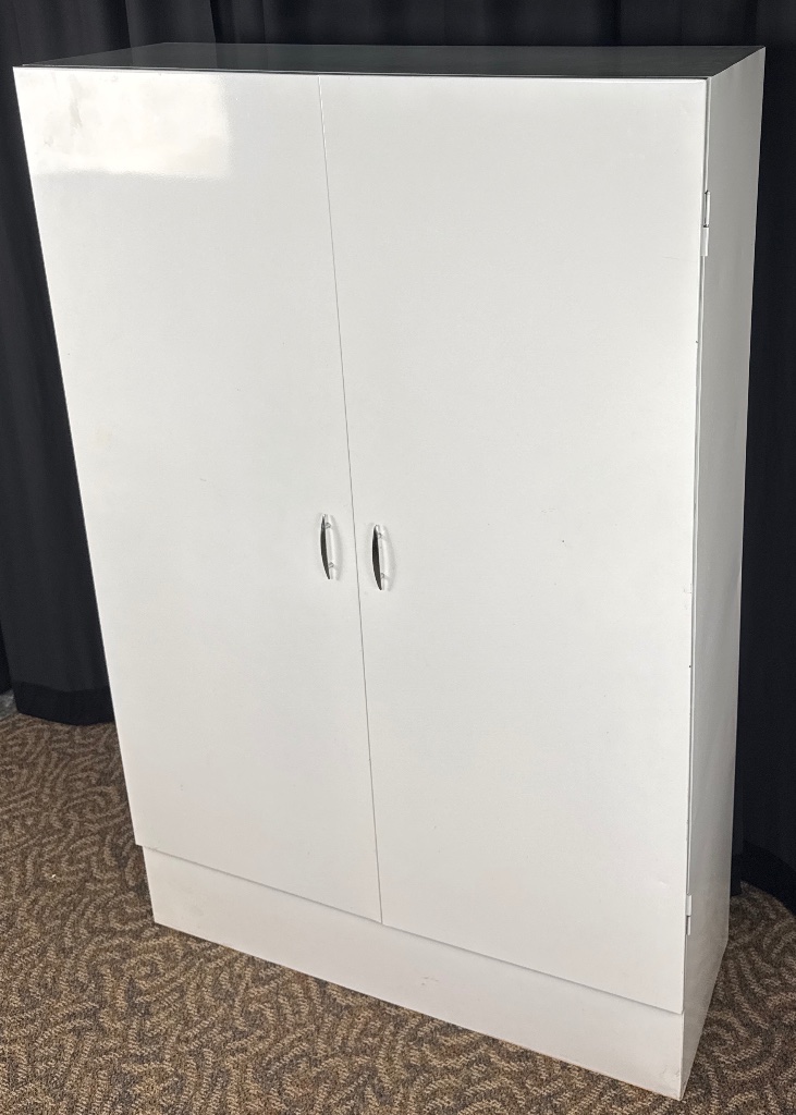 Tall white metal storage cabinet with two doors, metal handles, and shelves inside. Smooth surface finish. Suitable for garage, pantry, or general utility storage. CONDITION: Minor scuffing on the surface. No significant damage observed. SHIPPING: In-House Shipping Available