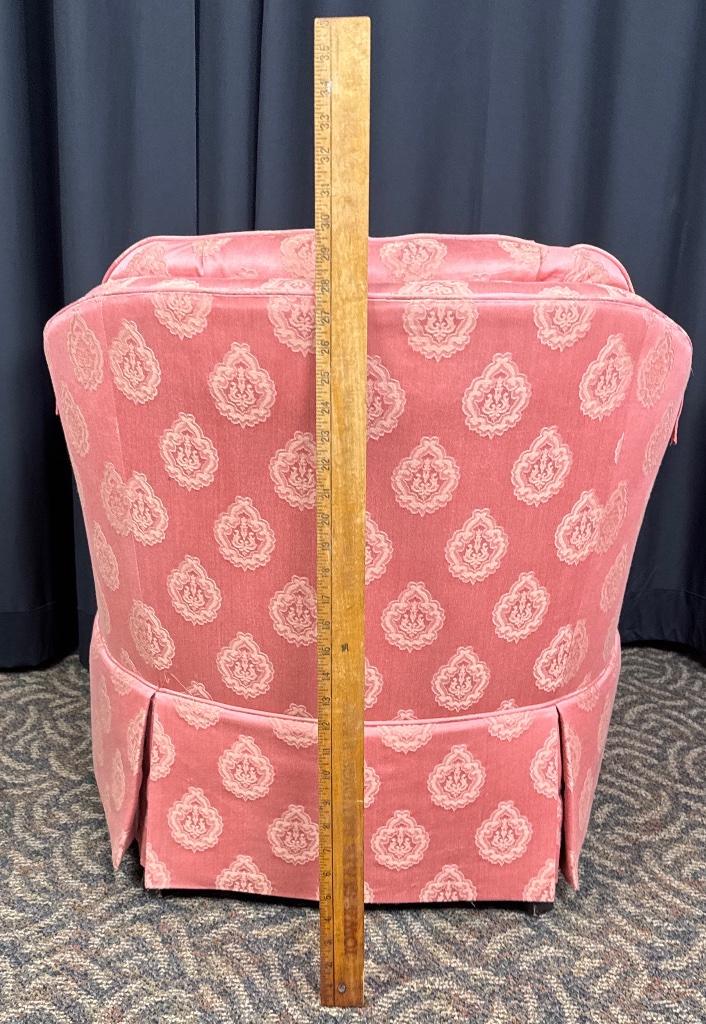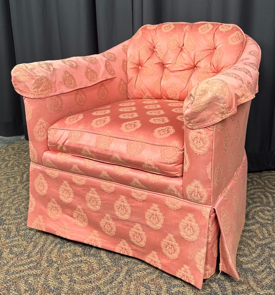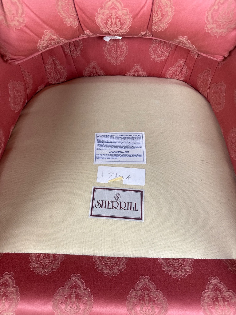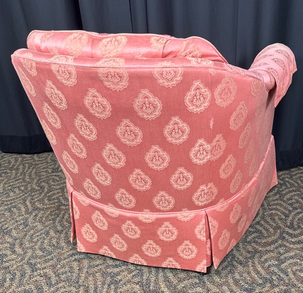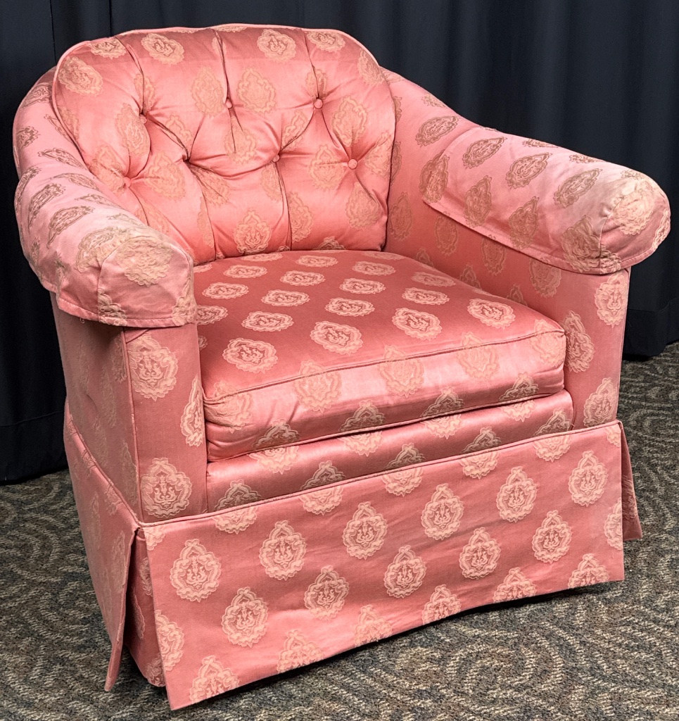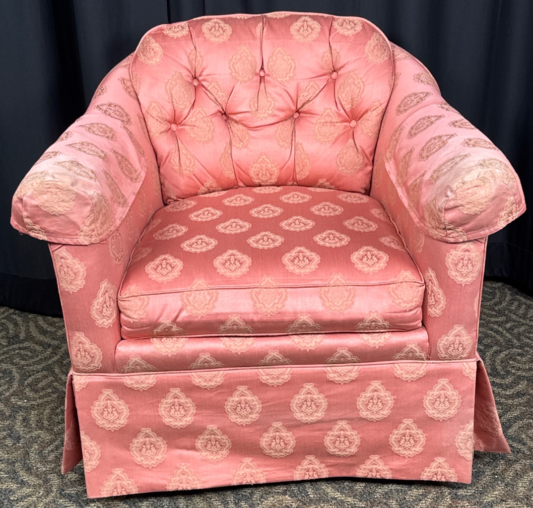 Sherrill upholstered club chair featuring pink fabric upholstery with a tufted back, skirted base with pleats, and removable cushion. Decorative pattern visible on the upholstery. CONDITION: Fading to upholstery fabric and minor wear to armrests. SHIPPING: In-House Shipping Available