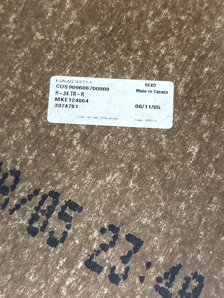 Haworth round table featuring a gray laminate tabletop and chrome pedestal base with a five-legged star design. The underside bears a label reading ‘HAWORTH’, along with model number ‘H-34 TR-R’, ‘Made in Canada’, and a manufacture date of August 11, 2005. CONDITION: Minor surface scratches observed on the tabletop. No significant wear on the chrome base. SHIPPING: In-House Shipping Available