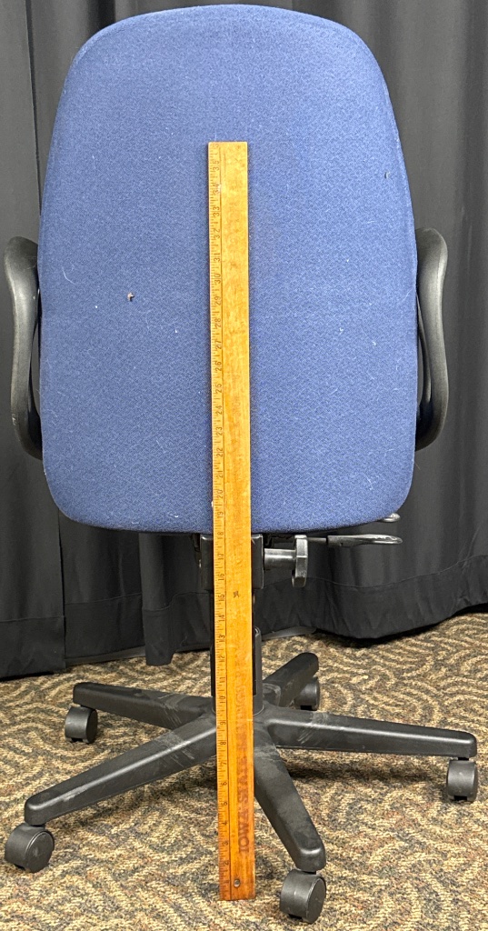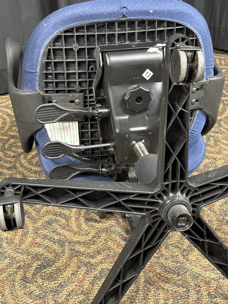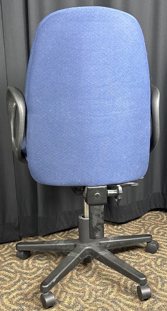 Blue fabric office chair with adjustable height and armrests. Features a five-point rolling base, black plastic armrests, and a height-adjustable seat mechanism with visible adjustment levers. The chair bears a mark referencing California Bureau of Home Furnishings Bulletin 129, indicating compliance with TB 129 flammability standards for public building furnishings. CONDITION: Visible dust and hair on fabric surface. Minor wear observed on armrests and base. SHIPPING: In-House Shipping Available