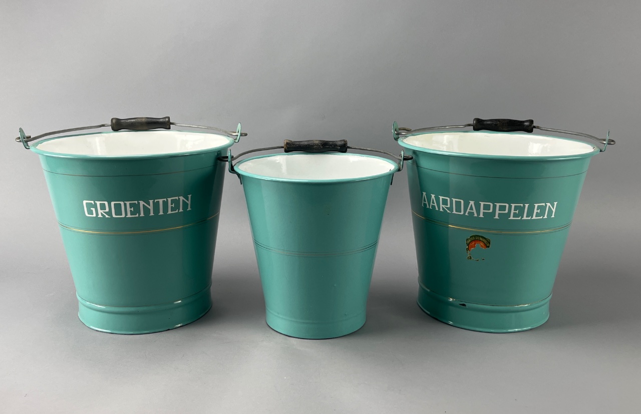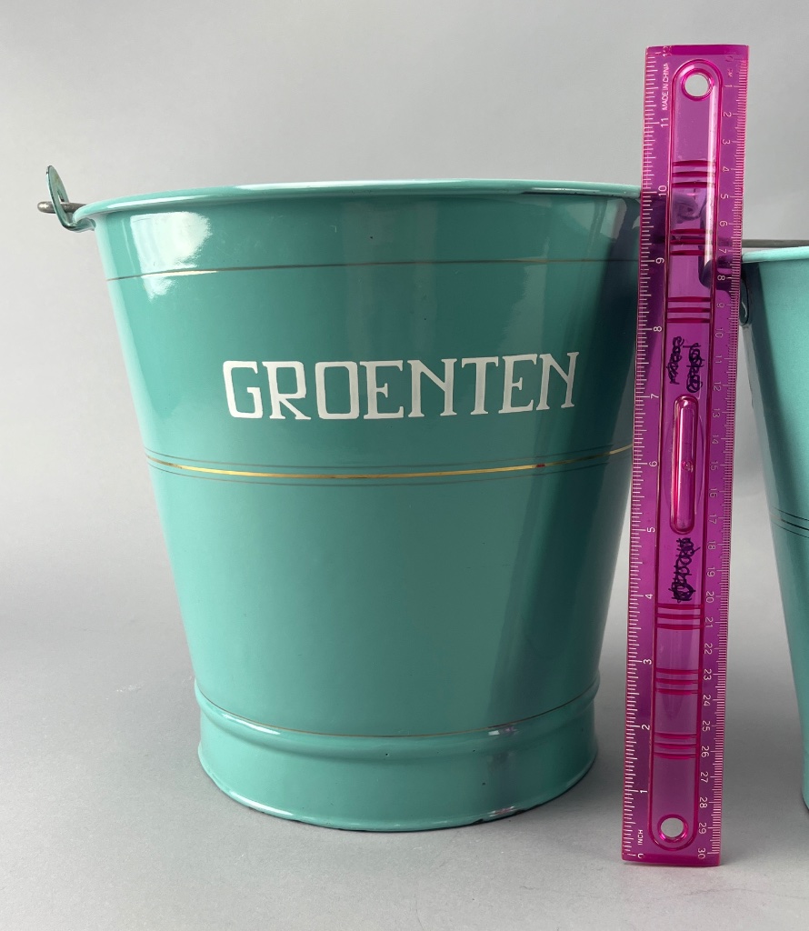 Set of three ceramic buckets with metal handles featuring a turquoise exterior, white interior, and decorative gold stripe around the middle. Each bucket is labeled in white text: ‘GROENTEN’ (vegetables) and ‘AARDAPPELEN’ (potatoes). Taller bucket is 10″H. CONDITION: Some surface wear and minor scratches visible on the exterior. SHIPPING: In-House Shipping Available