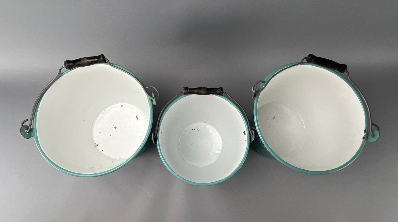 Set of Three Ceramic Buckets with Handles, Turquoise Exterior