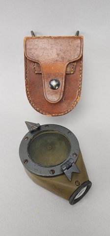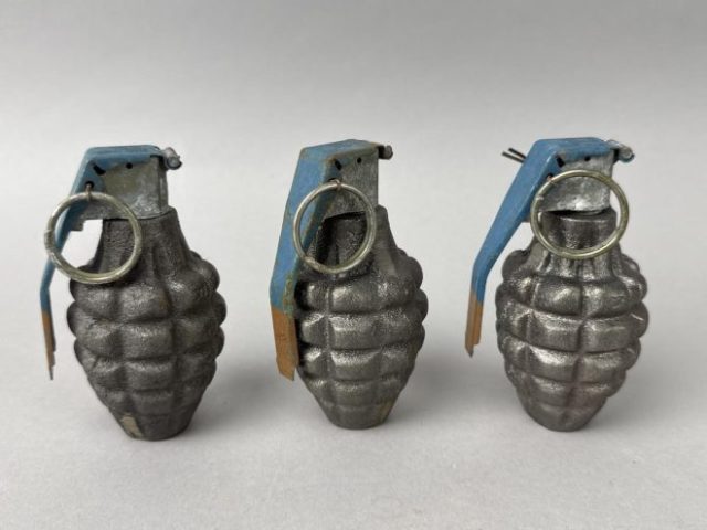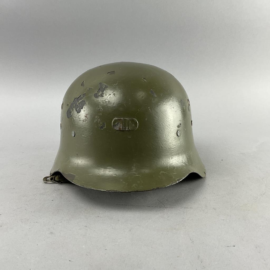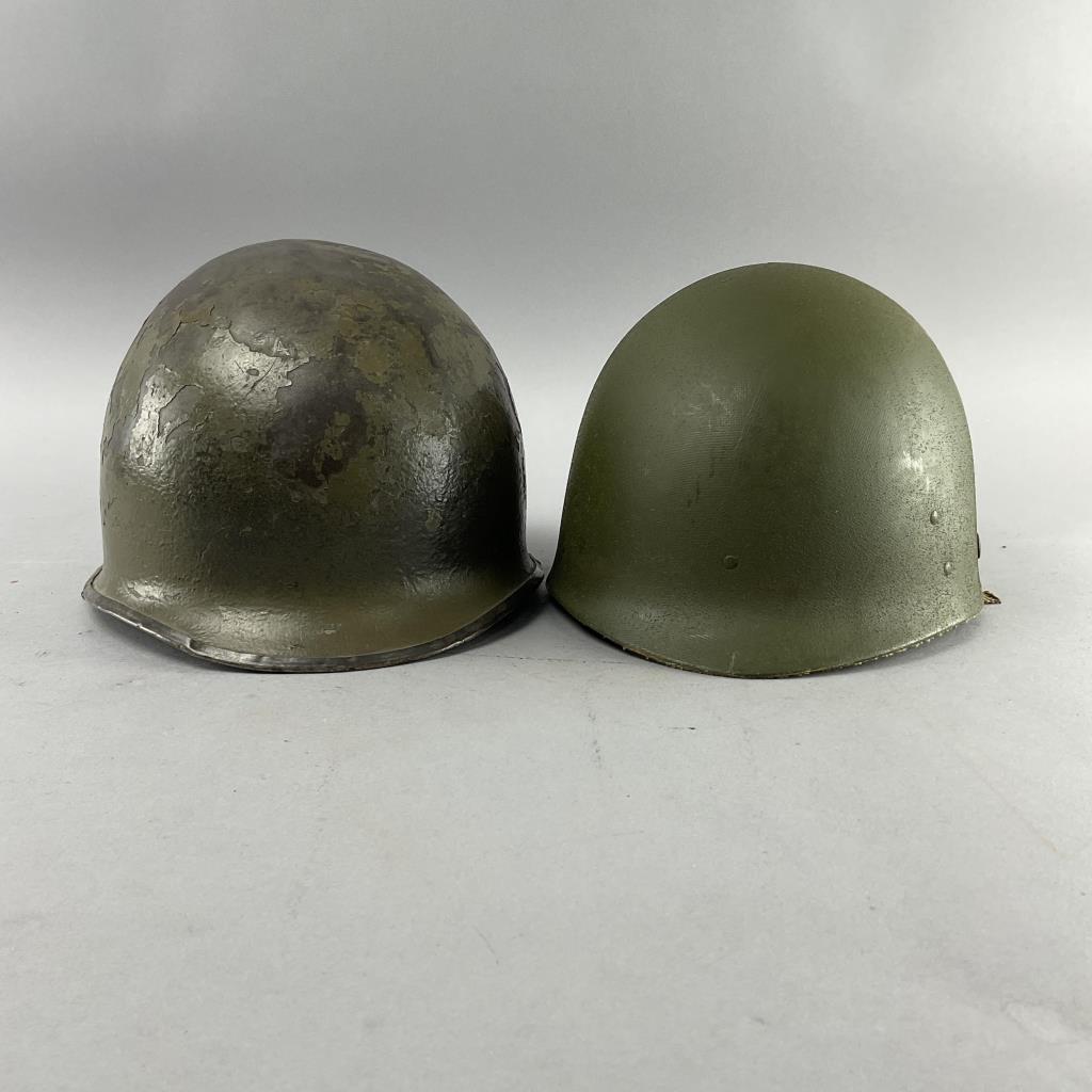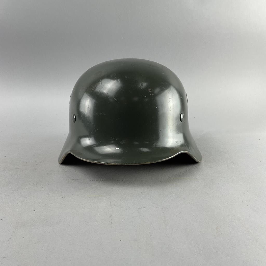 Highlights include WWII German helmets, 19th-century swords and sabers, antique powder flasks, and a diverse selection of collectible military items from around the world.