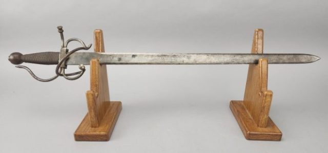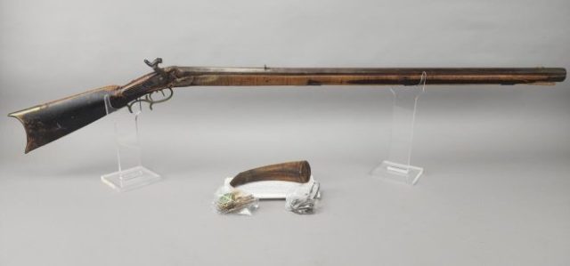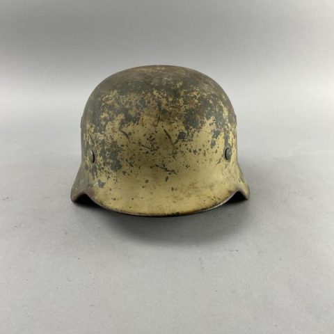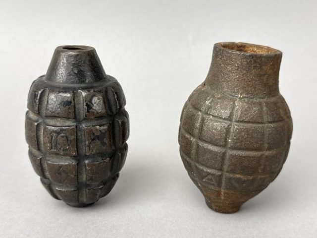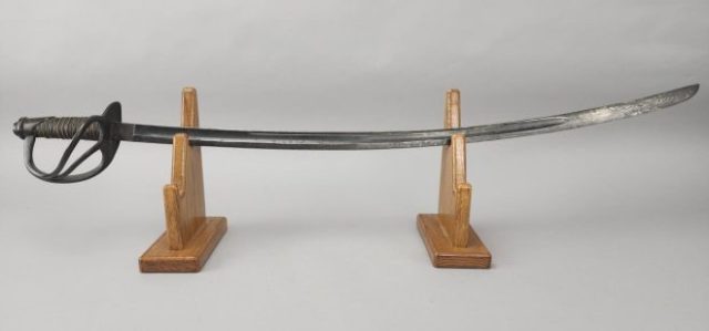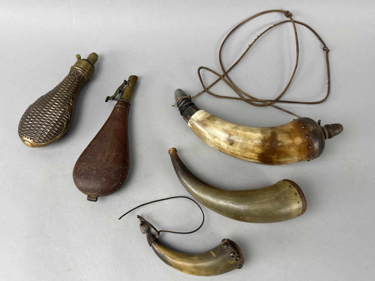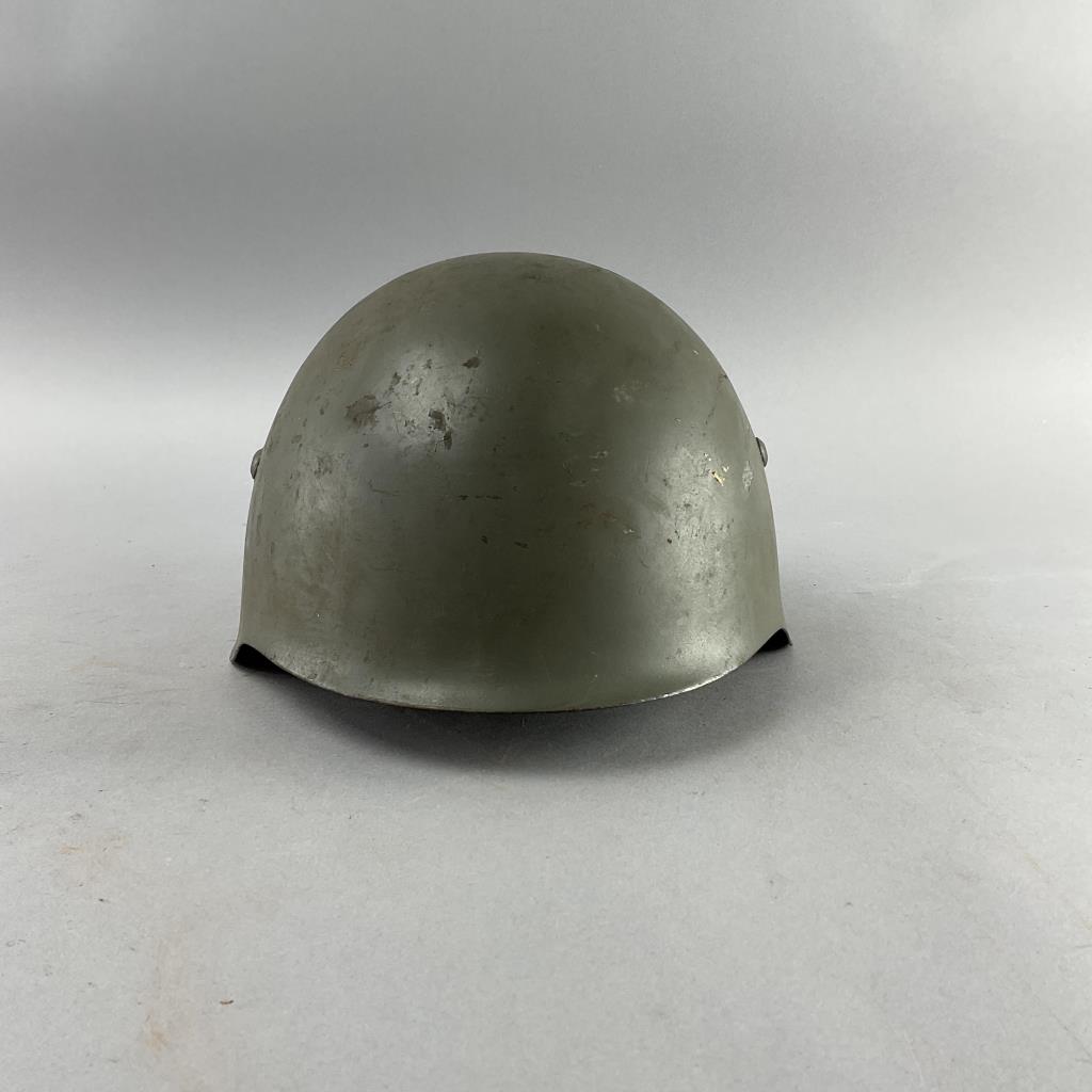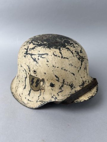 Highlights include WWII German helmets, 19th-century swords and sabers, antique powder flasks, and a diverse selection of collectible military items from around the world.